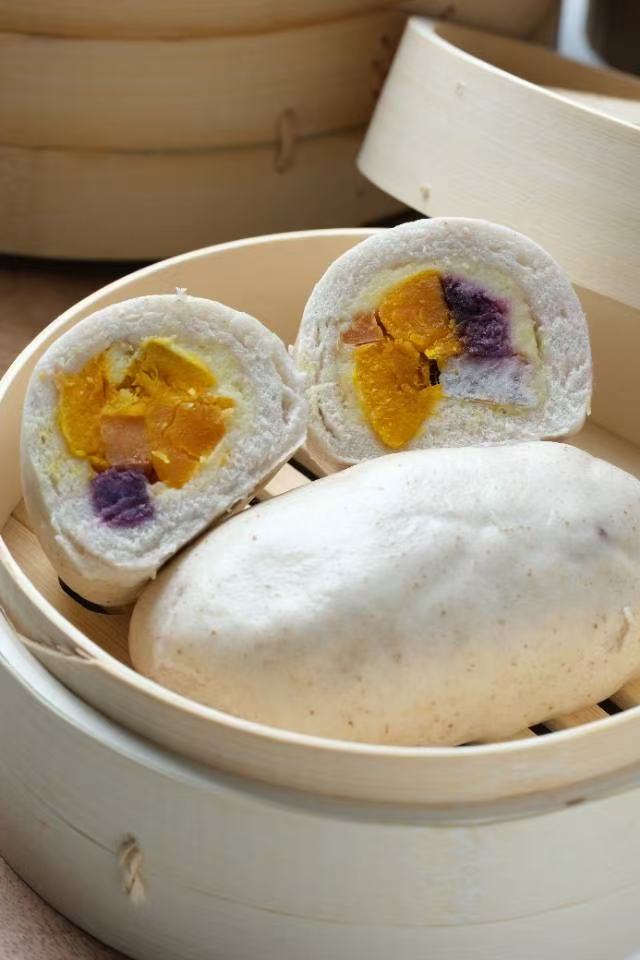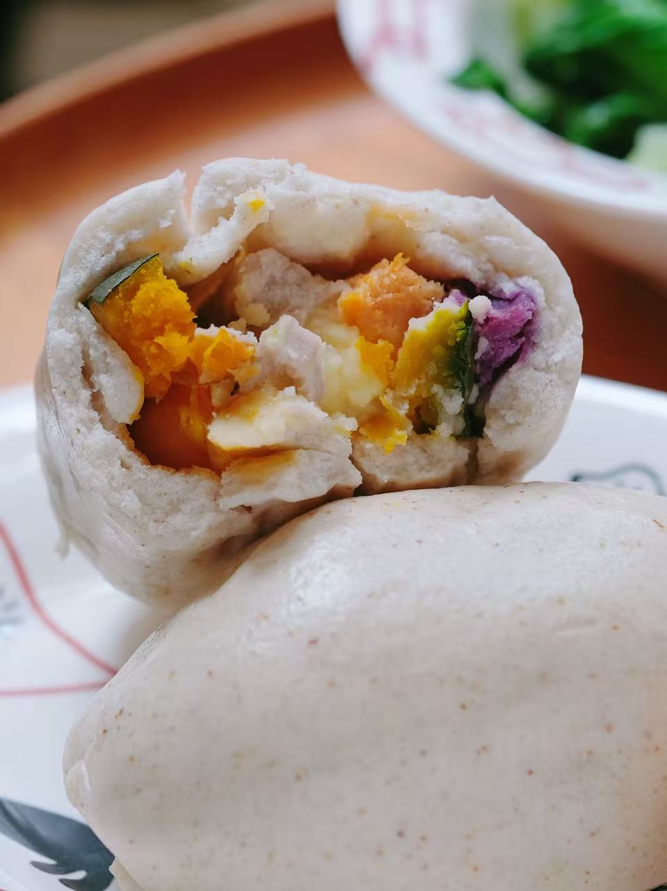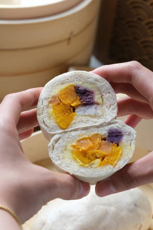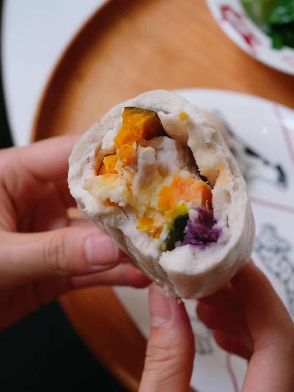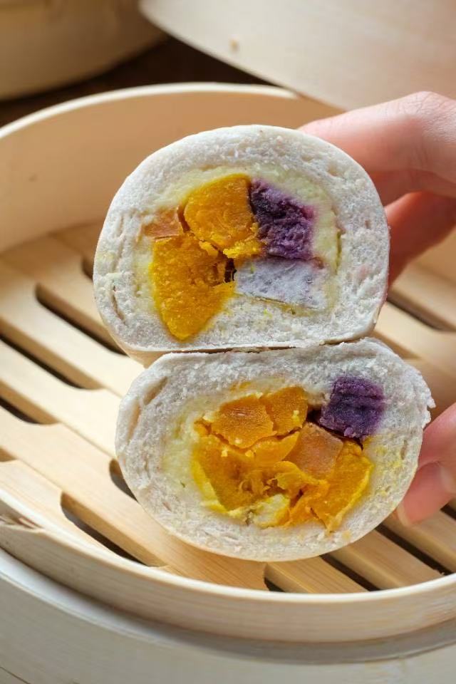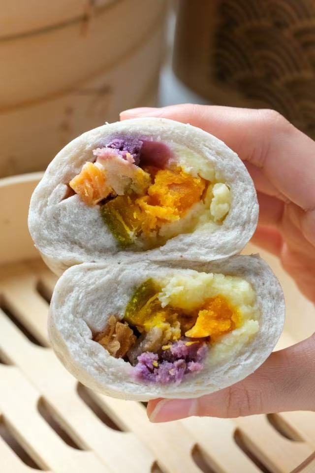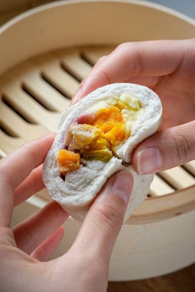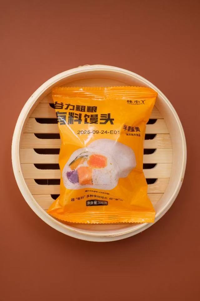 现在这颗馒头,是我们一群人“较真”出来的:要让你不用早起熬粗粮,不用纠结营养搭配,撕开包装一蒸,就能把芋头、地瓜、南瓜、紫薯这些实打实的粗粮,连同海鸭蛋黄的鲜香,一起吃进肚里。