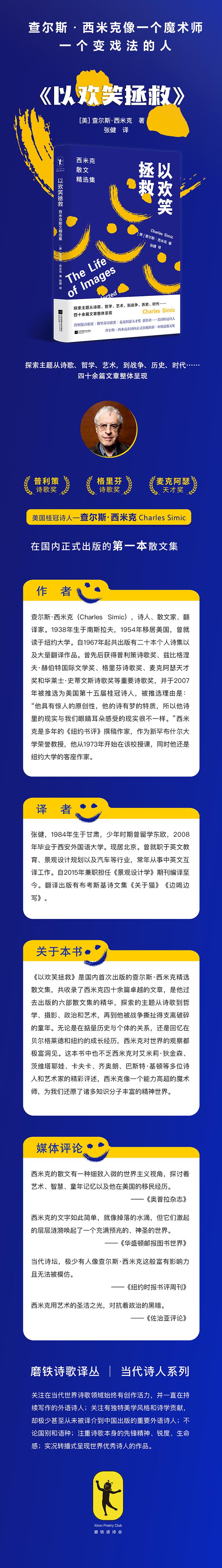 《以欢笑拯救》是国内首次出版的查尔斯·西米克精选散文集,共收录了西米克四十余篇卓越的文章,是他过去出版的六部散文集的精华,探索的主题从诗歌到哲学、摄影、政治和艺术,再到他被战争撕扯得支离破碎的童年。无论是在掂量历史与个体的关系,还是回忆在贝尔格莱德和纽约的成长经历,西米克对世界的观察都极富洞见。这本书中也不乏西米克对艾米莉·狄金森、茨维塔耶娃、卡夫卡、齐奥朗、巴斯特·基顿等多位诗人和艺术家的精彩评述,西米克像一个能力高超的魔术师,为我们还原了诸多知识分子丰富的精神世界。