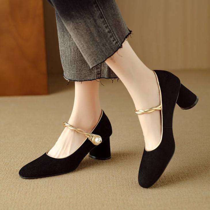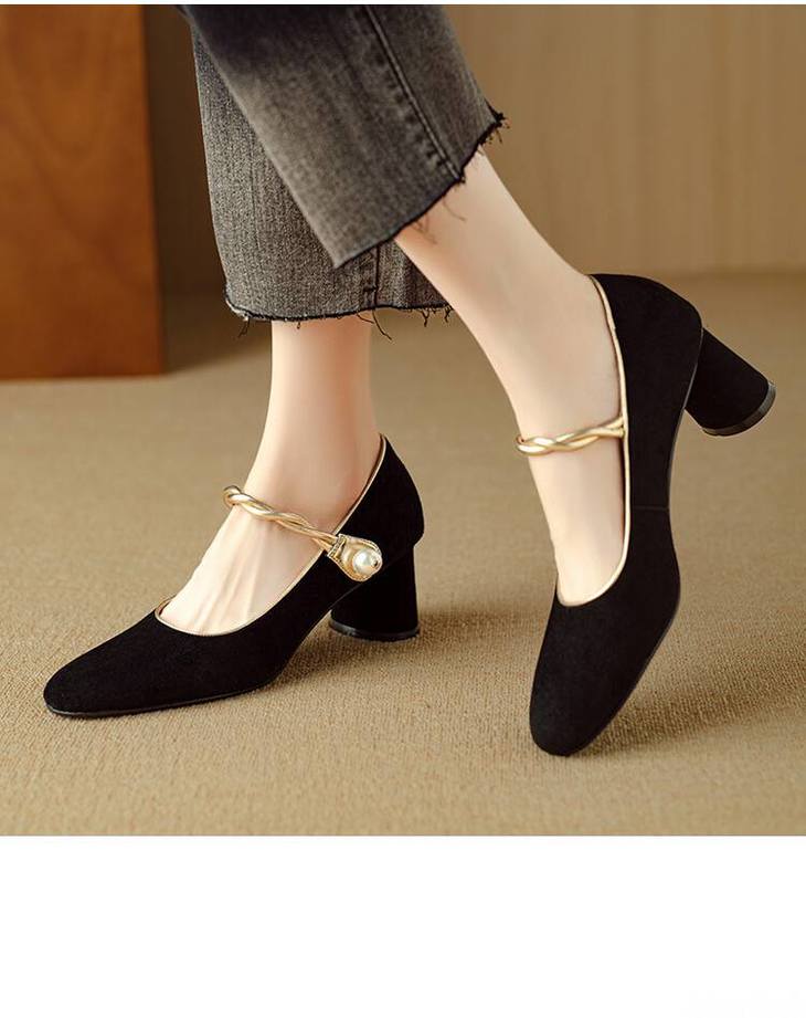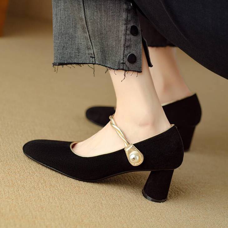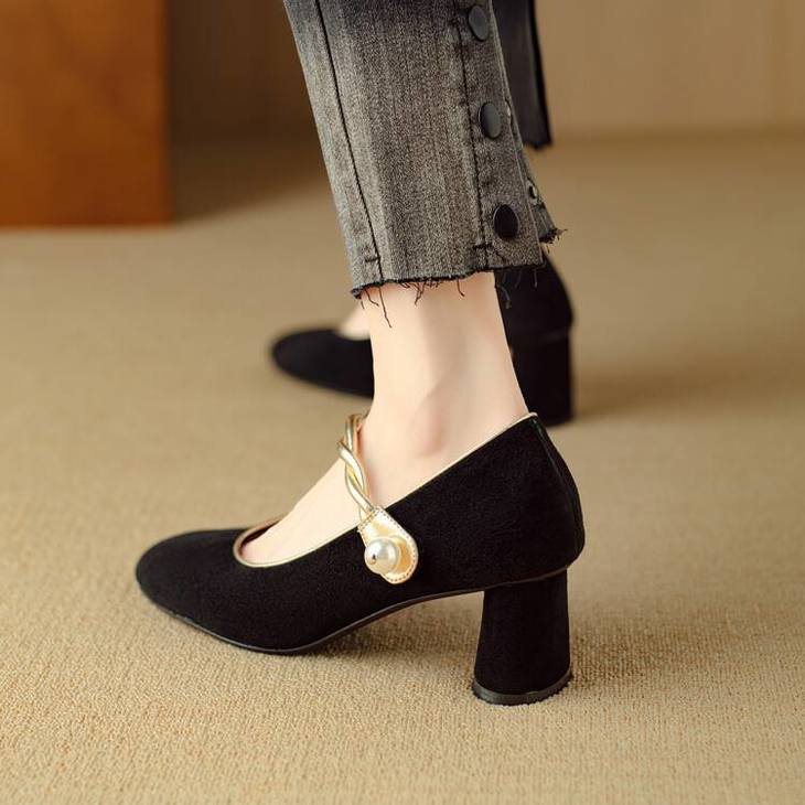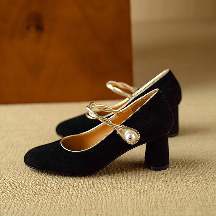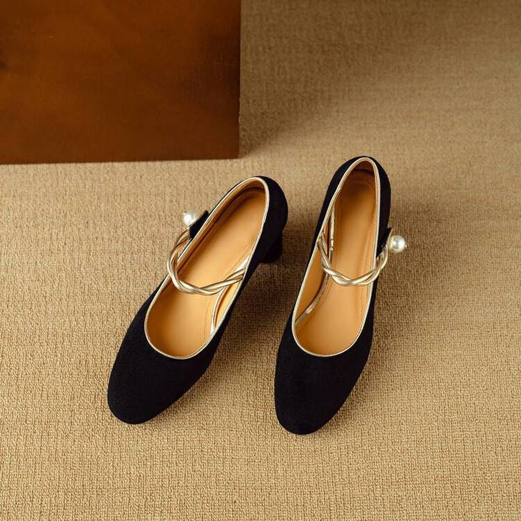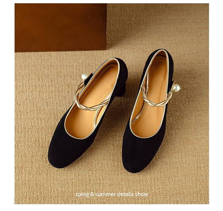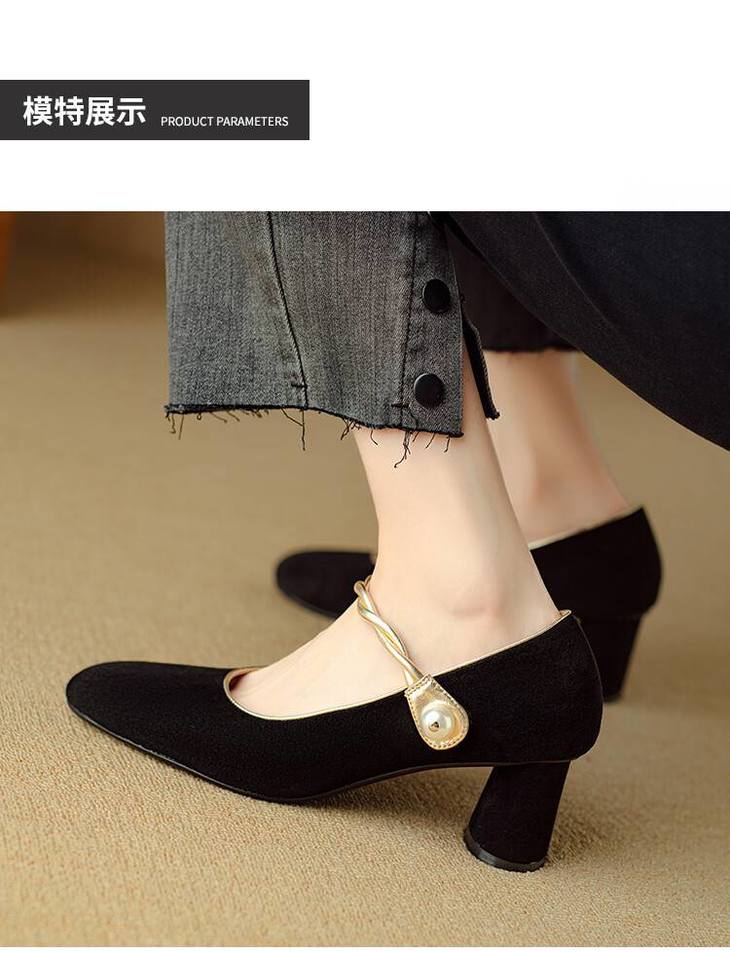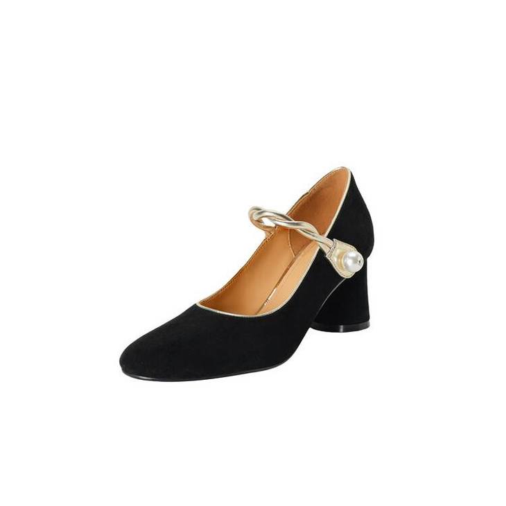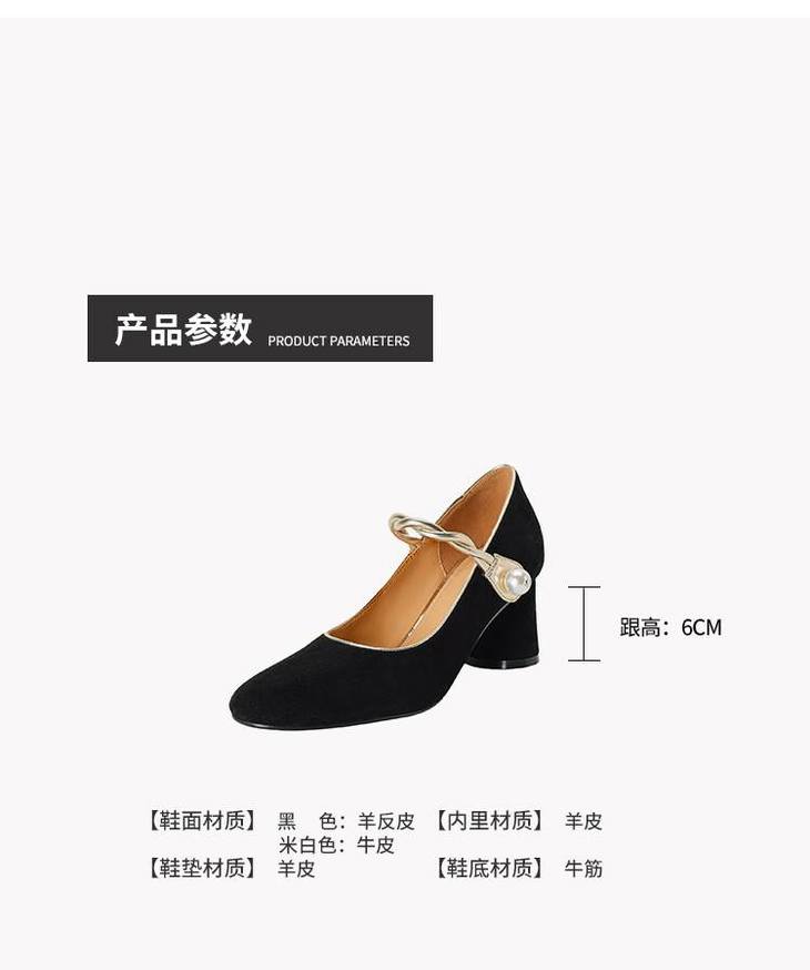 【预售5天】赫本风气质高跟鞋新品黑色羊翻皮粗跟珍珠一字带浅口玛丽珍女鞋DB&M5998