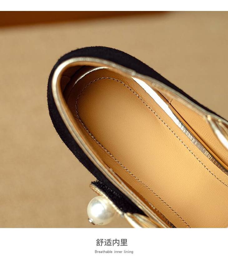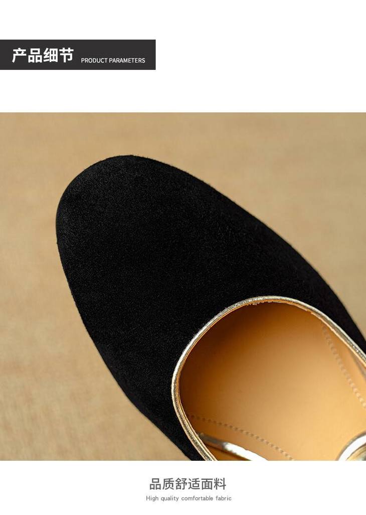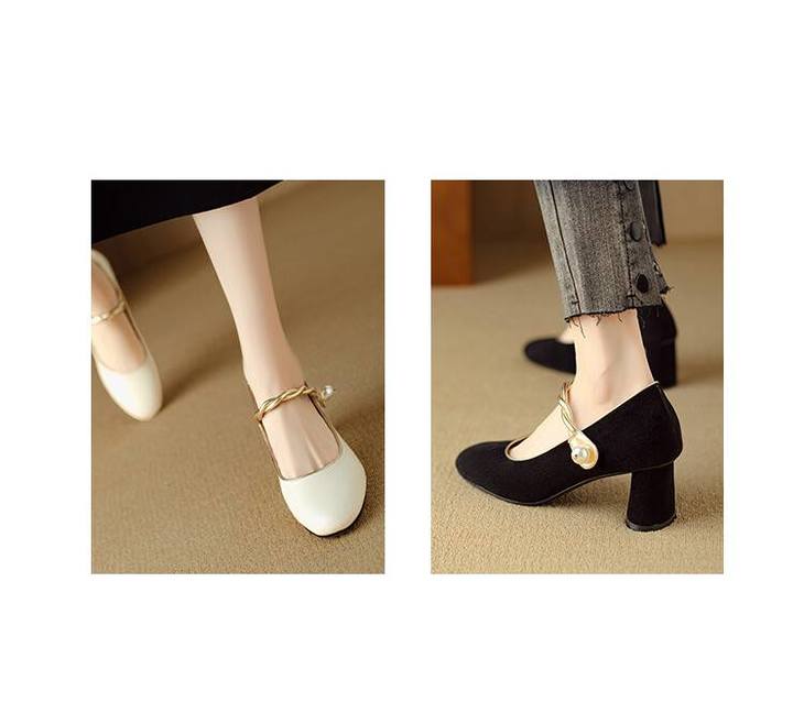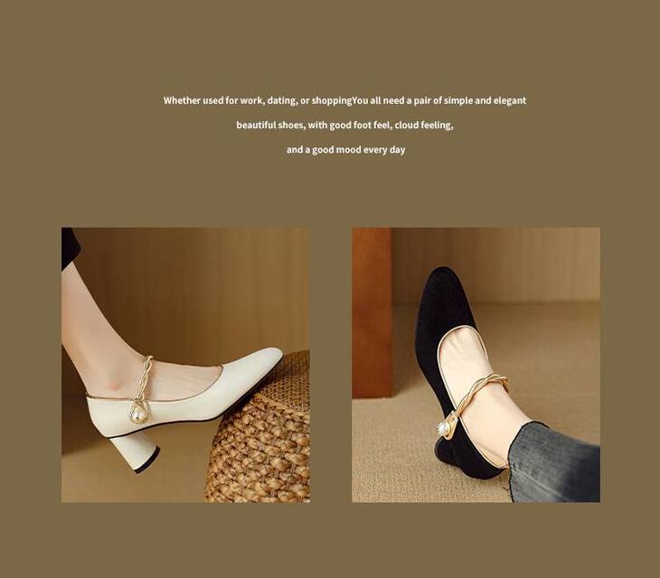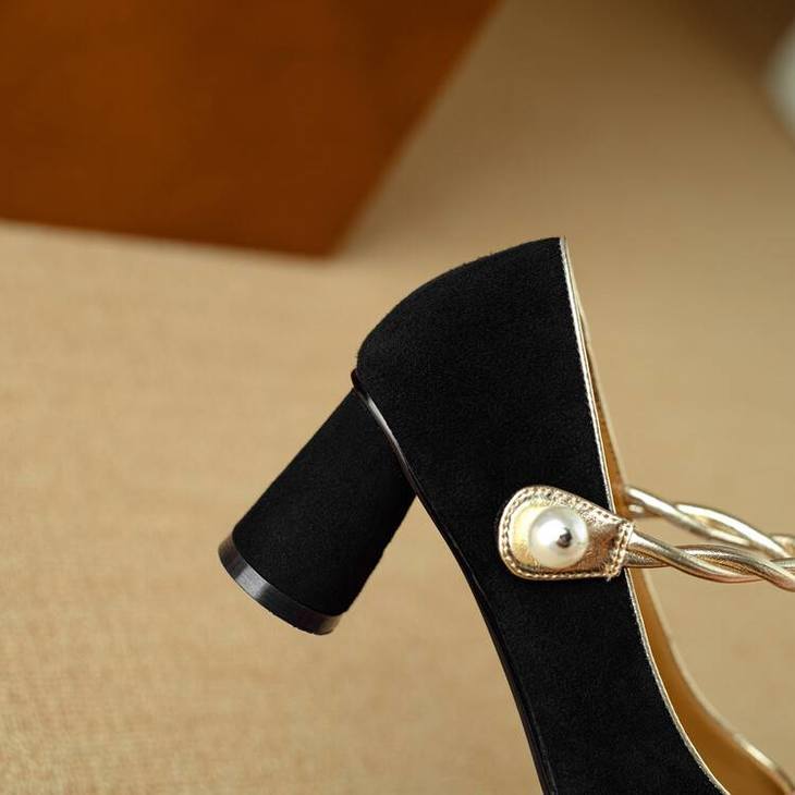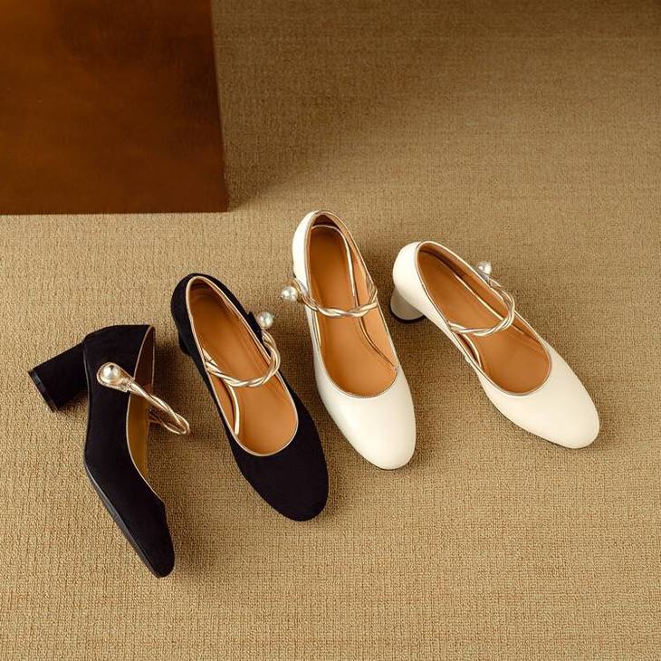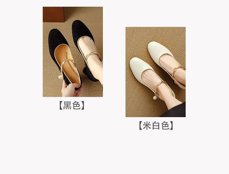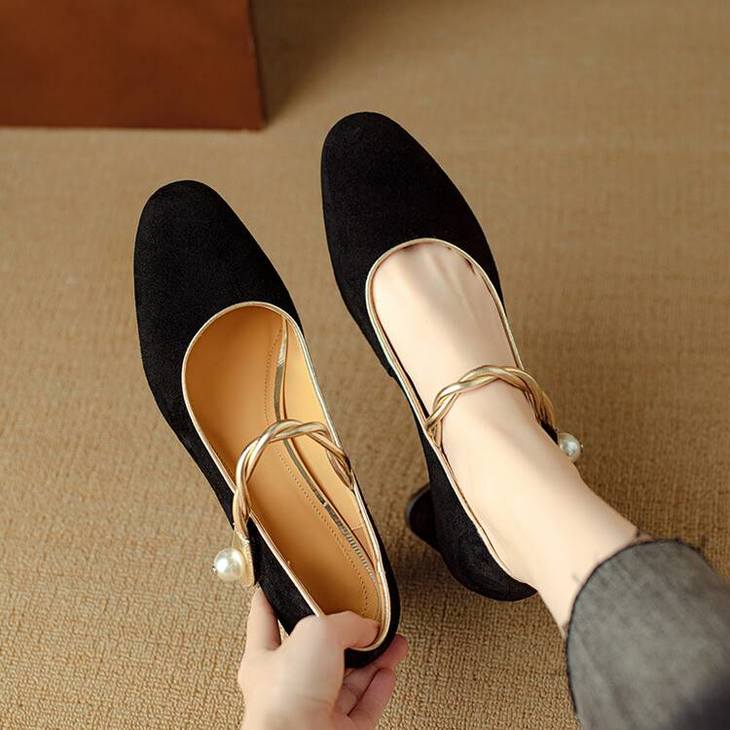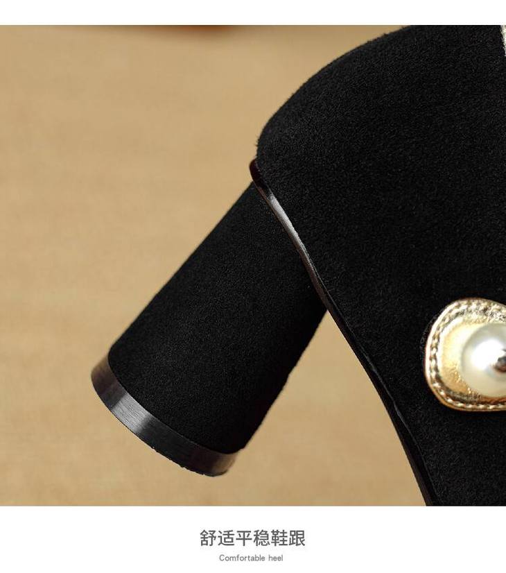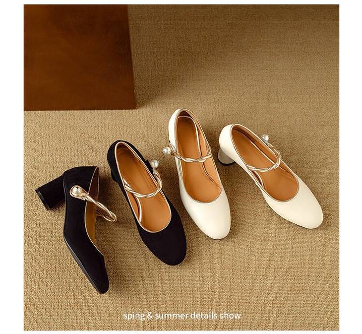 【预售5天】赫本风气质高跟鞋新品黑色羊翻皮粗跟珍珠一字带浅口玛丽珍女鞋DB&M5998
