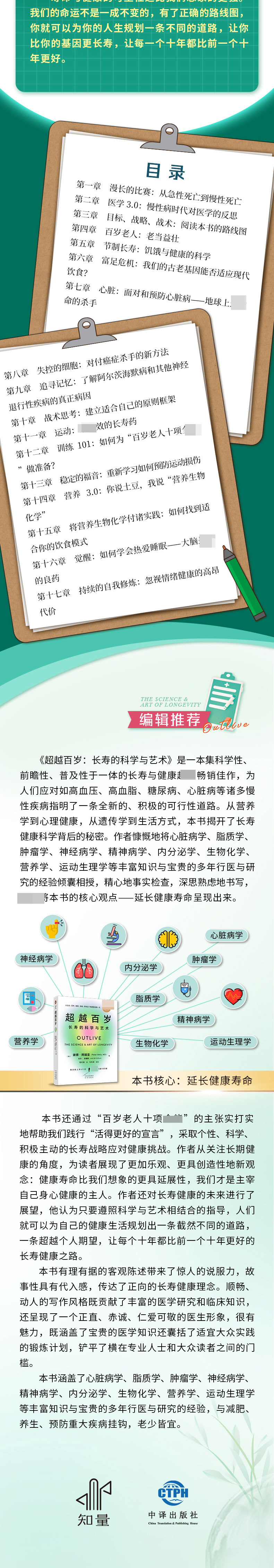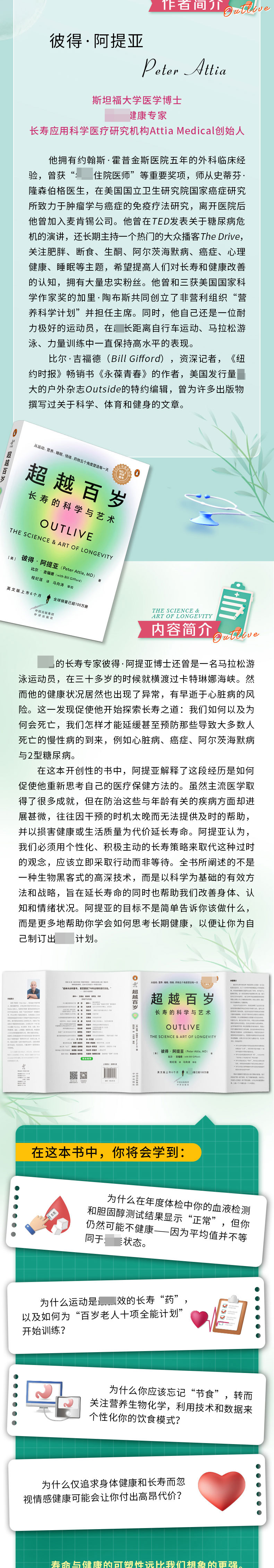 在这本开创性的书中,阿提亚解释了这段经历是如何促使他重新思考自己的医疗保健方法的。虽然主流医学取得了很多成就,但在防治这些与年龄有关的疾病方面却进展甚微,往往因干预的时机太晚而无法提供及时的帮助,并以损害健康或生活质量为代价延长寿命。阿提亚认为,我们必须用个性化、积极主动的长寿策略来取代这种过时的观念,应该立即采取行动而非等待。全书所阐述的不是一种生物黑客式的高深技术,而是以科学为基础的有效方法和战略,旨在延长寿命的同时也帮助我们改善身体、认知和情绪状况。阿提亚的目标不是......