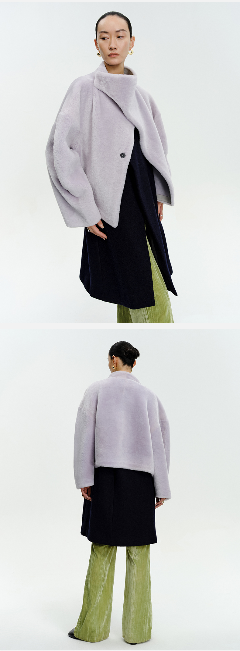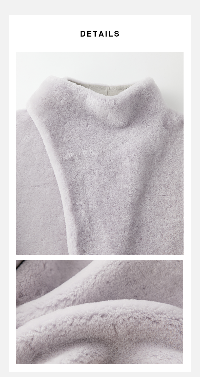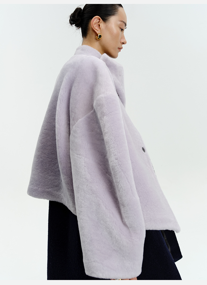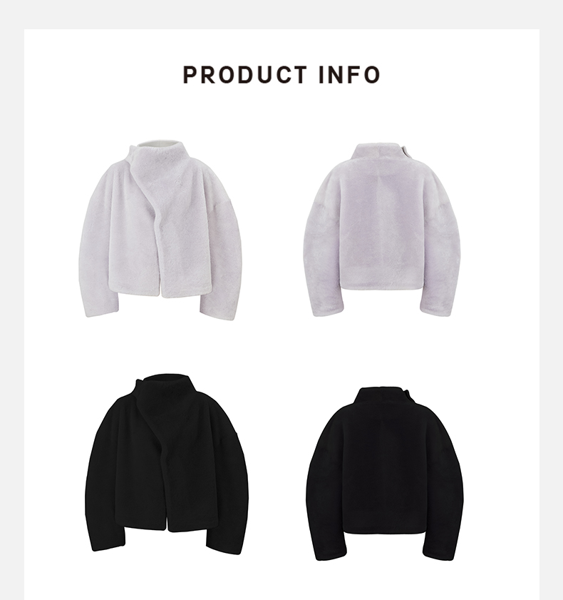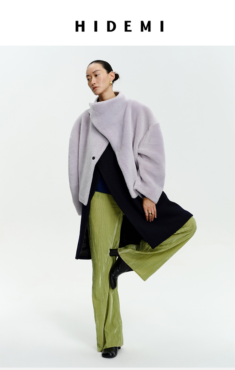 HIDEMI皮毛一体不对称立领设计感短款皮衣大衣 黑色/奶油紫