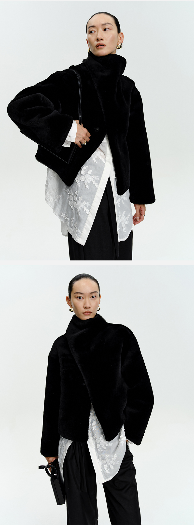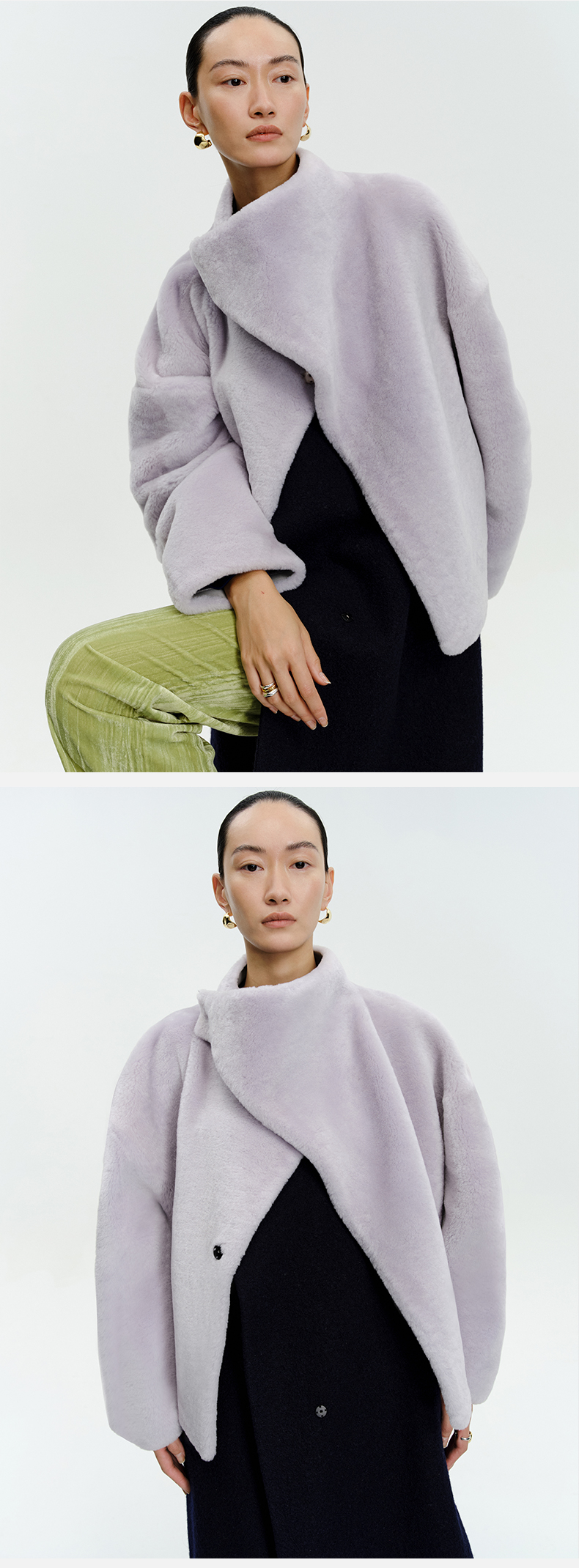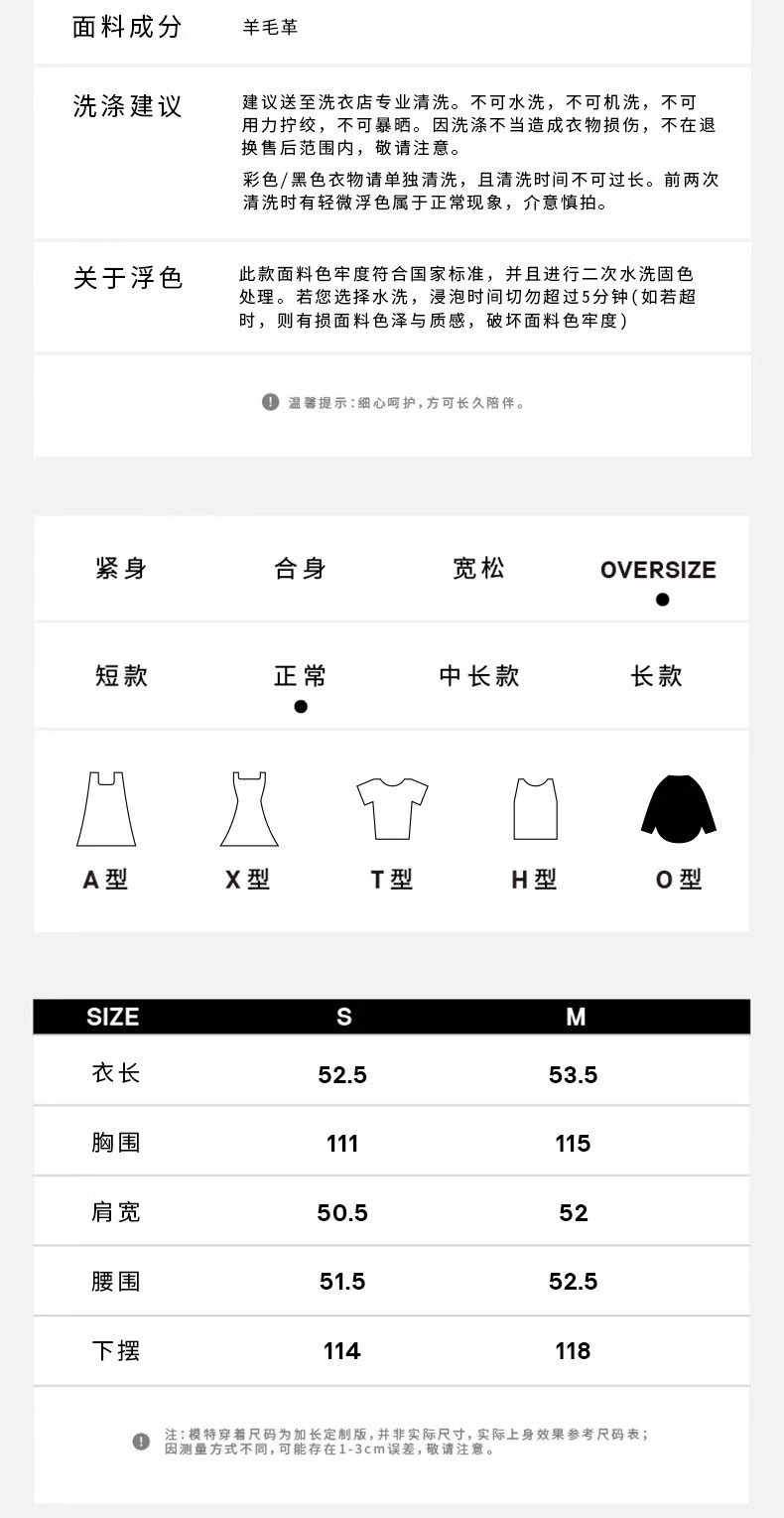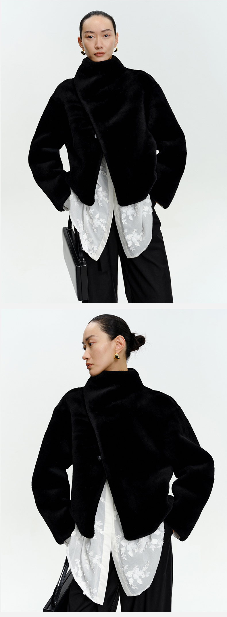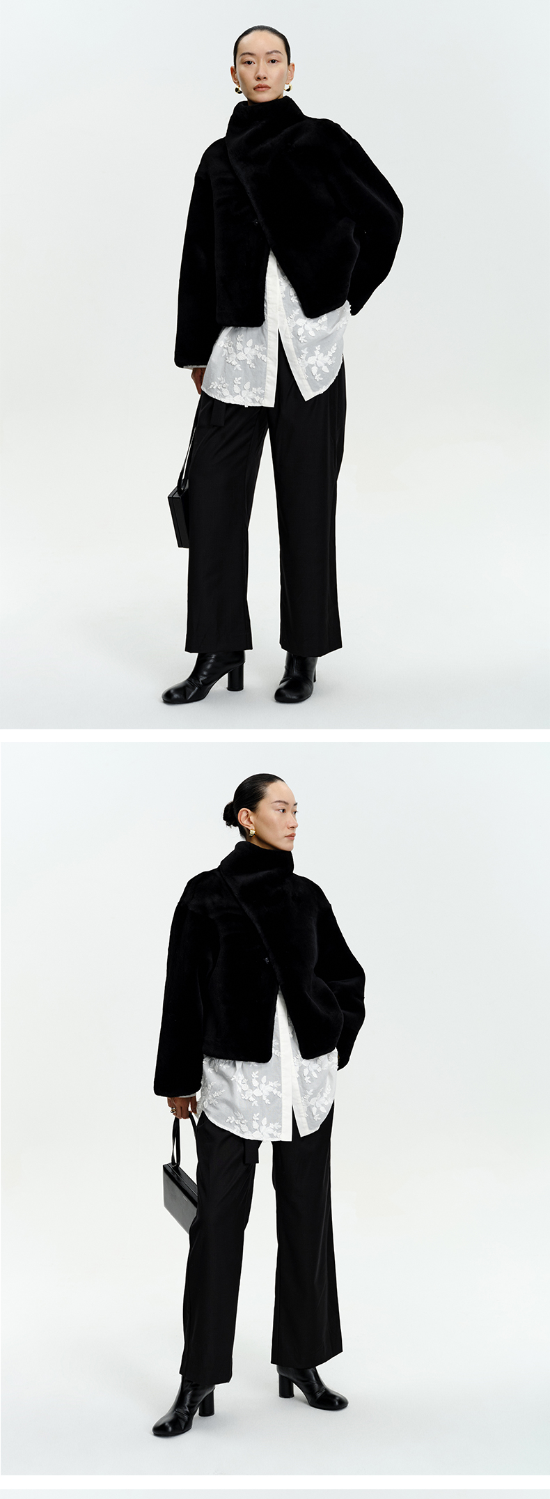 HIDEMI皮毛一体不对称立领设计感短款皮衣大衣 黑色/奶油紫