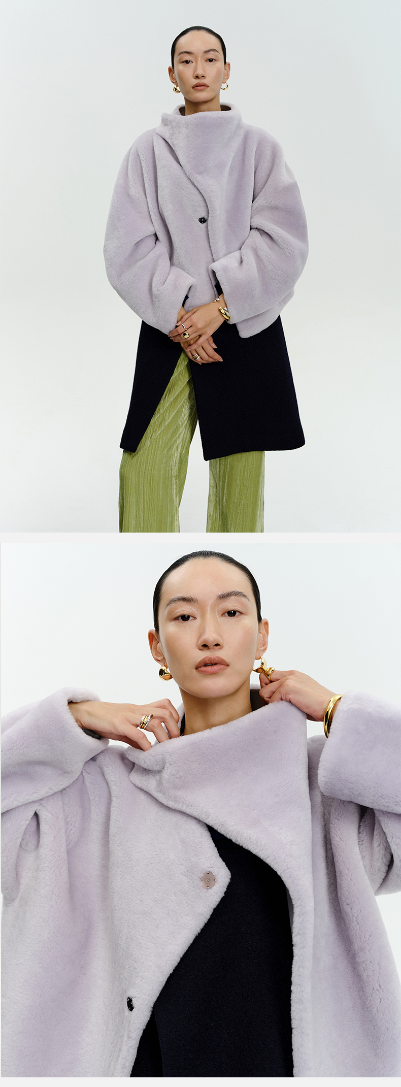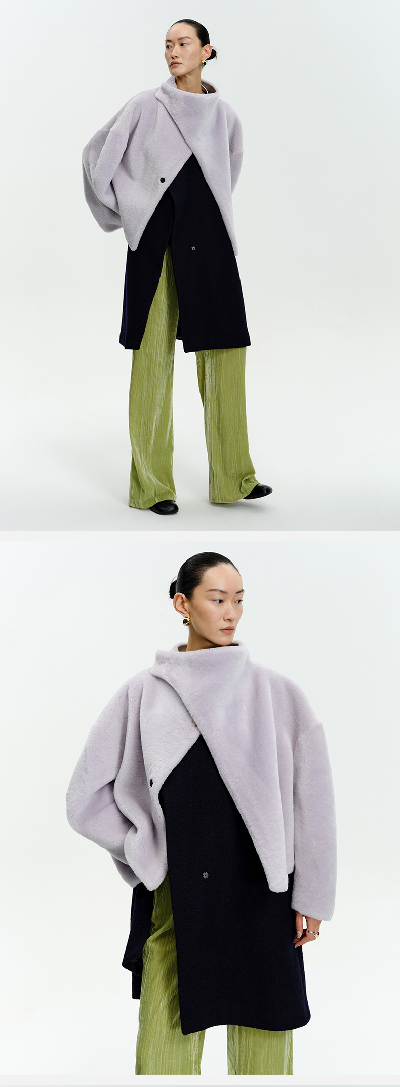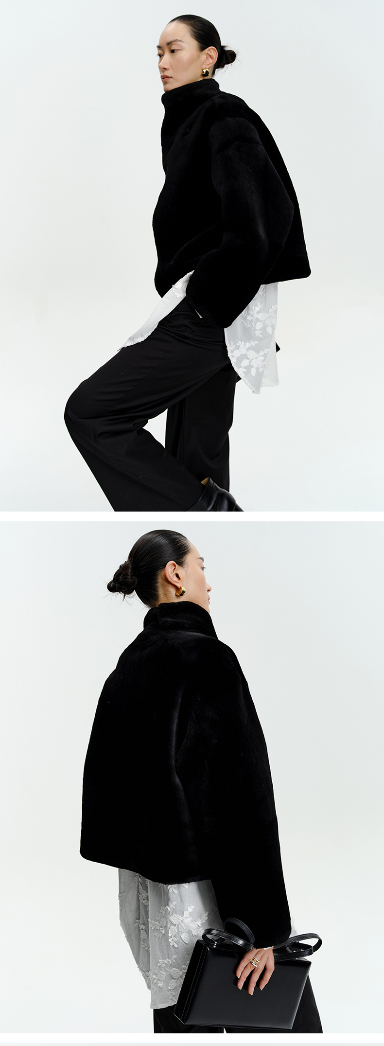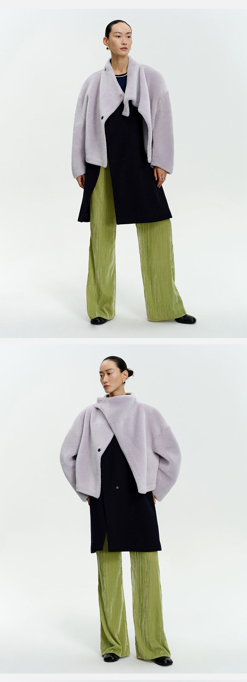 HIDEMI皮毛一体不对称立领设计感短款皮衣大衣 黑色/奶油紫