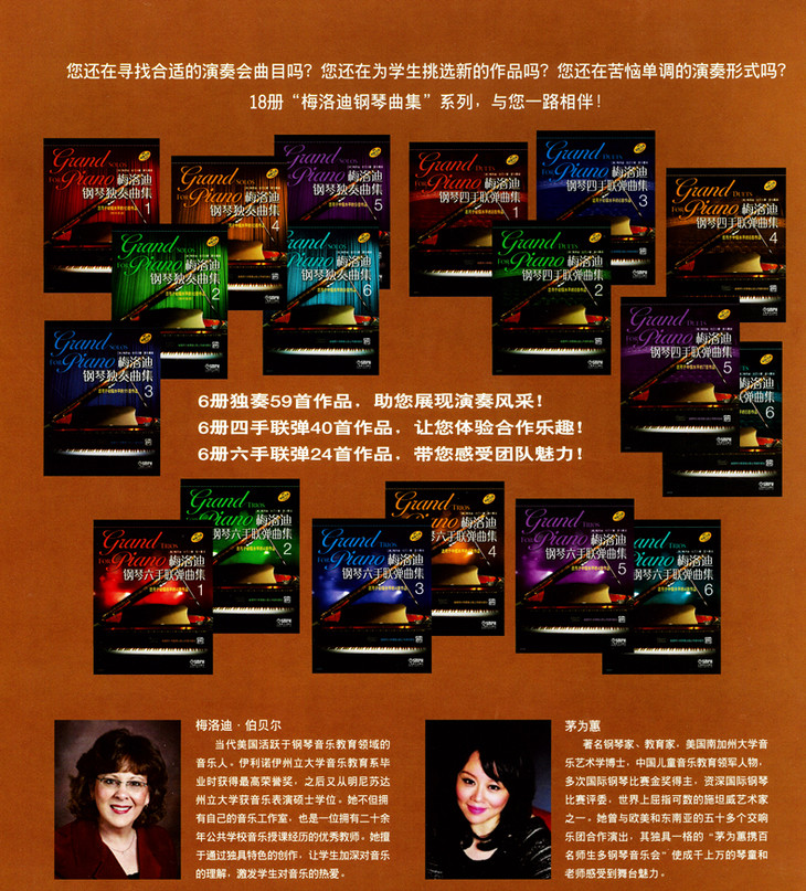 《梅洛迪钢琴六手联弹曲集》系列丛书就是为了让现在的学生体会不同的音乐风格和音乐语言,希望学生们能通过这个“曲集”同时提高他们的音乐修养和演奏技巧。我衷心希望学生们能在这套《梅洛迪钢琴六手联弹曲集》系列丛书中感受愉悦,找到兴趣!