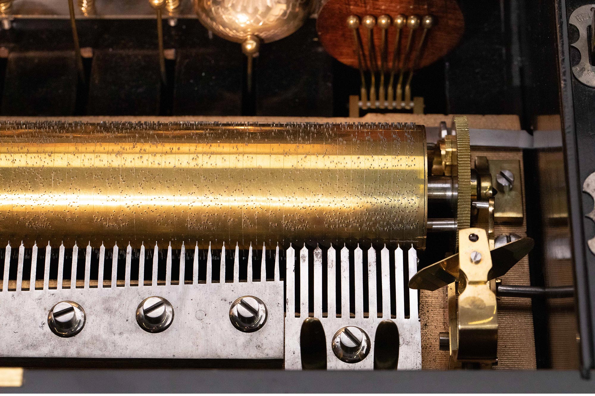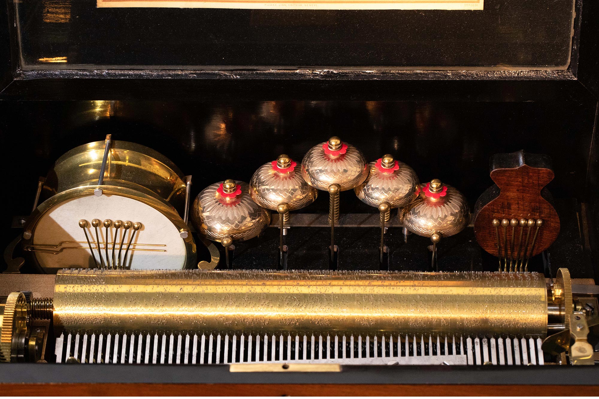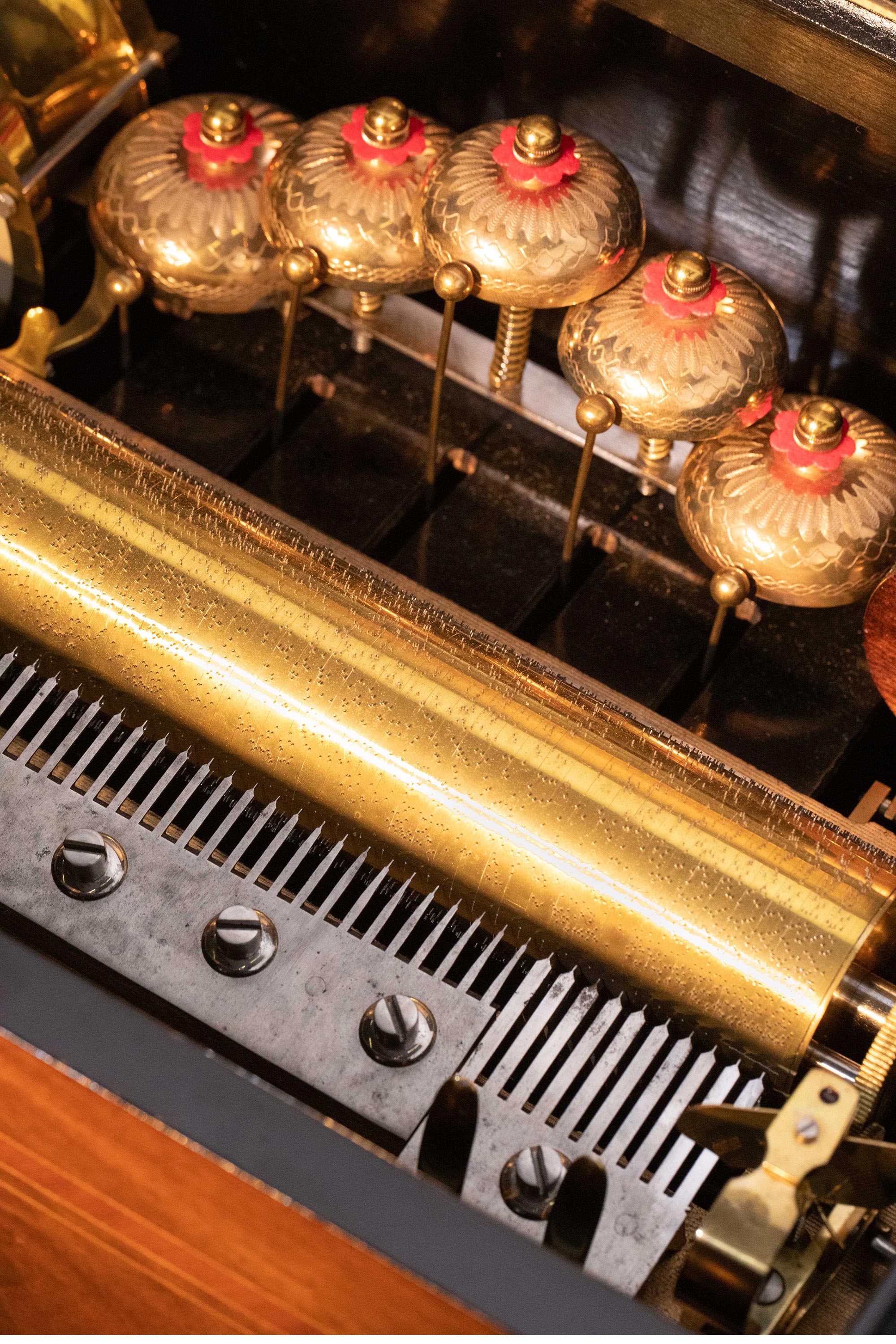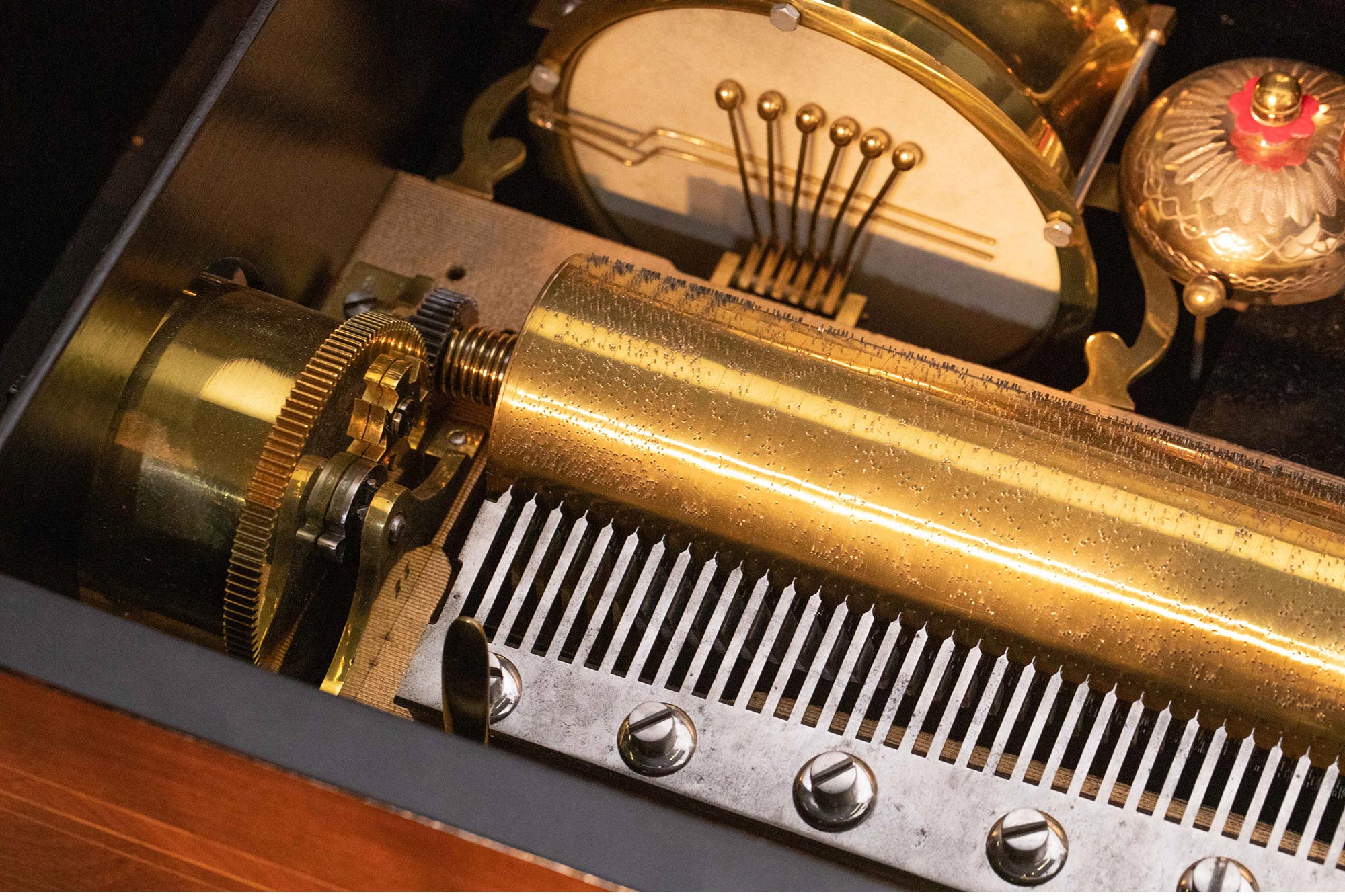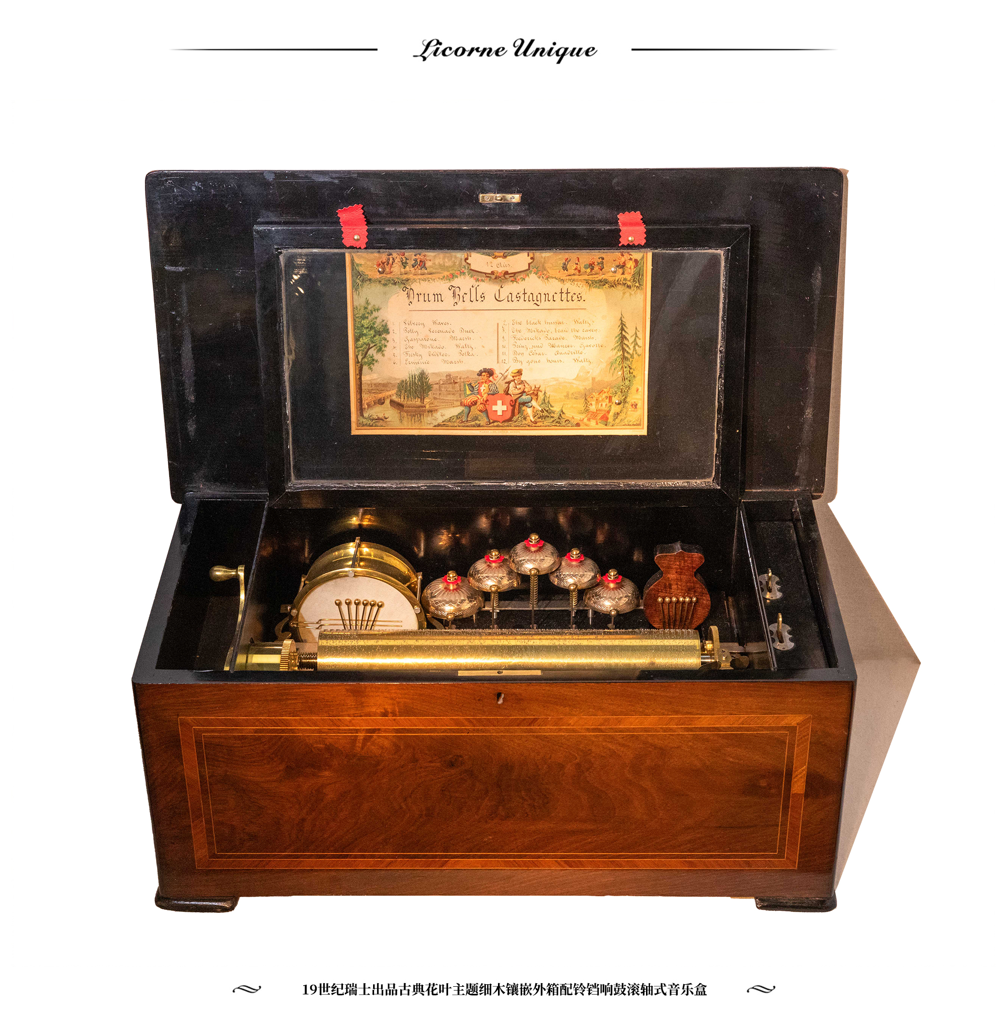 19世纪瑞士出品古典花叶主题细木镶嵌外箱配铃铛响鼓滚轴式音乐盒