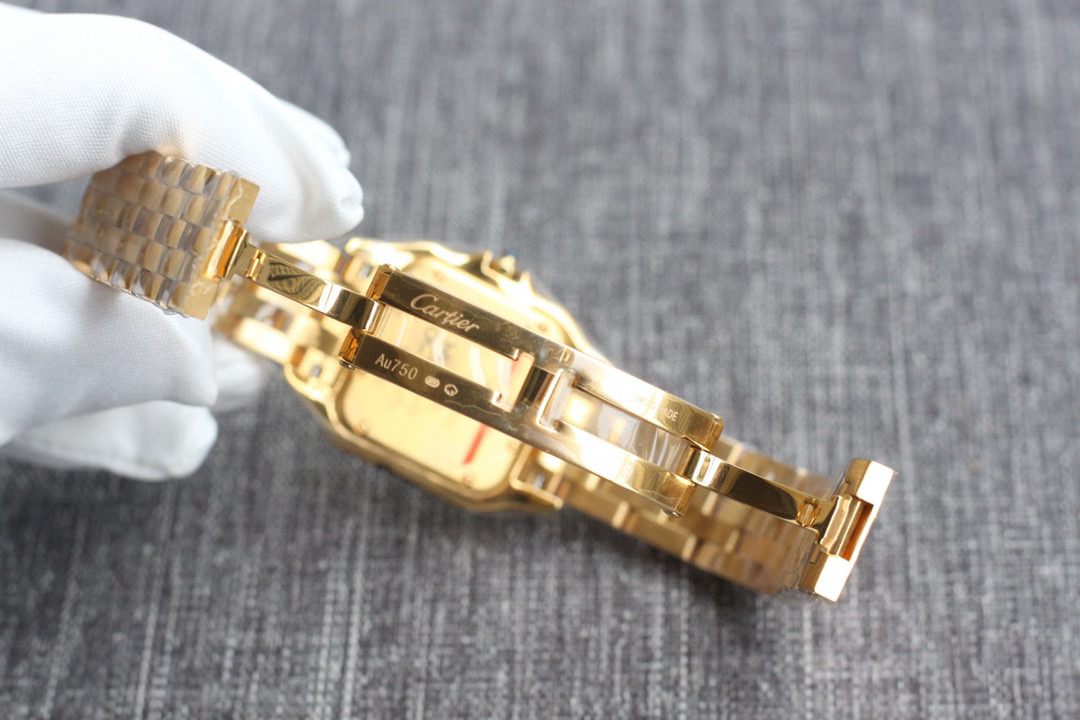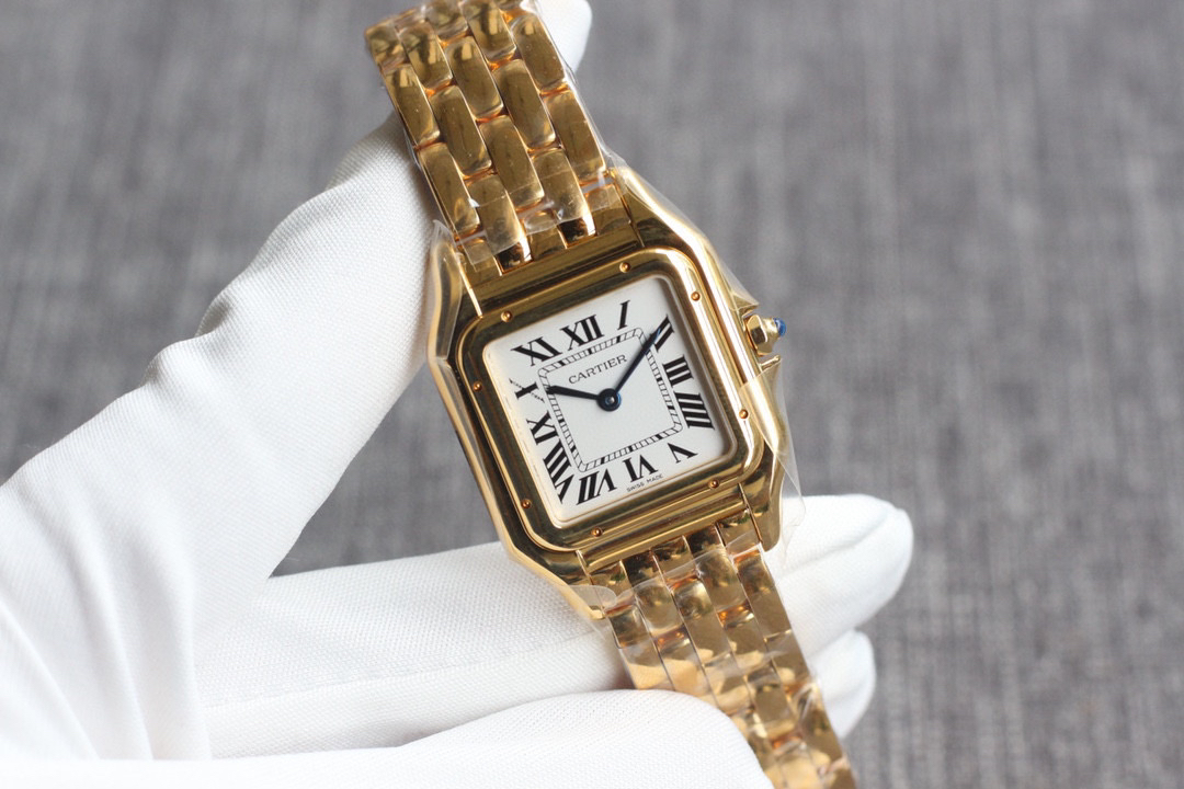 卡地亚猎豹系列 Panthère de Cartier华丽而不羁 中号 华丽而不羁,是Panthère de Cartier猎豹所传达的美学风格。它线条流畅,魅惑动人,柔软服帖于腕间,宛若在肌肤上翩翩起舞。独特的造型彰显成熟优雅、自信动人的女性形象。以精湛技艺,原装开模,打造出与正品无异的精美流线表耳,与表壳一体成型。搭载瑞士朗达石英机芯,316L精钢壳套,表盘尺寸:27 x 37毫米,厚度:6毫米,表冠镶嵌一颗合成蓝色尖晶石,镀银表盘,剑形蓝钢指针,100%三度防水。搭配专柜旅行包装物料。