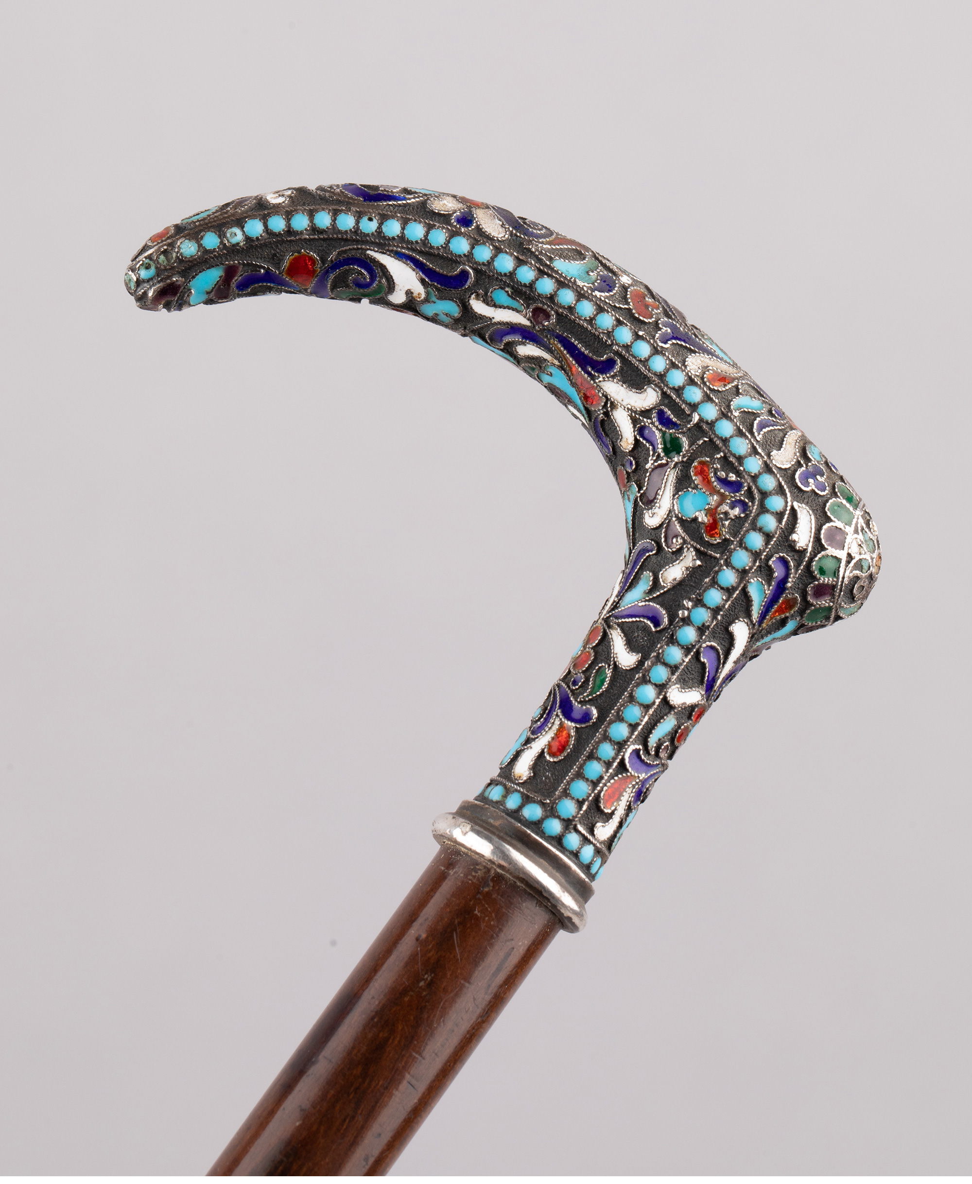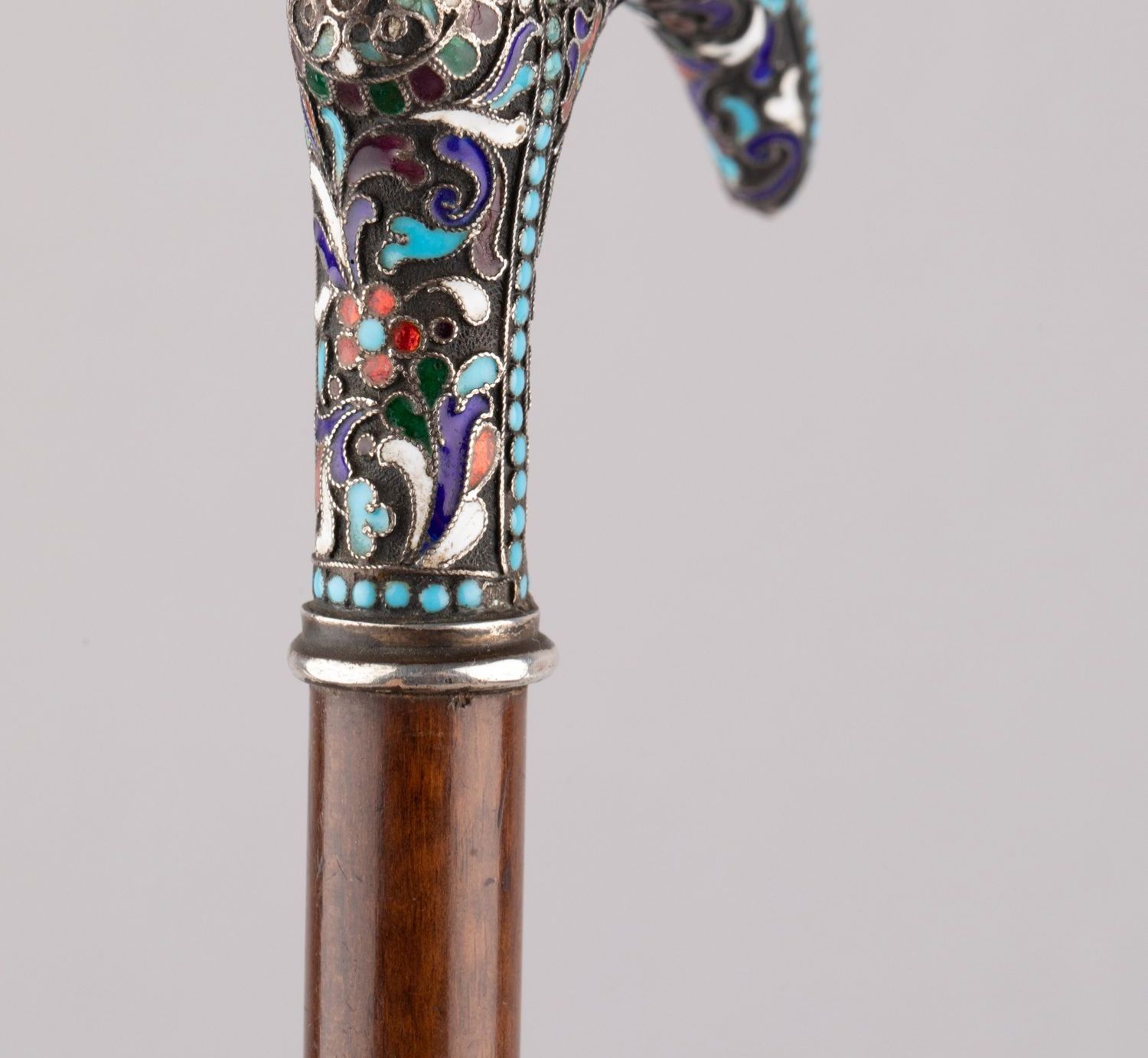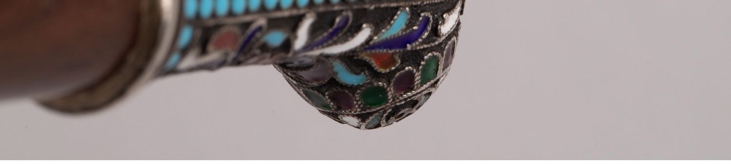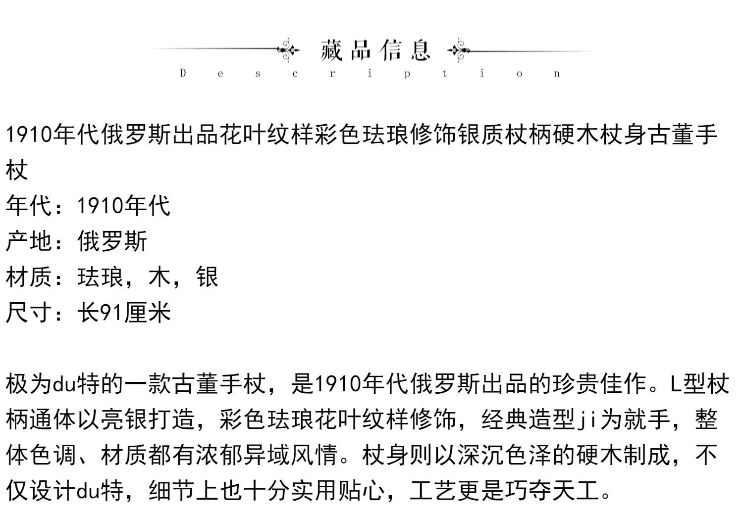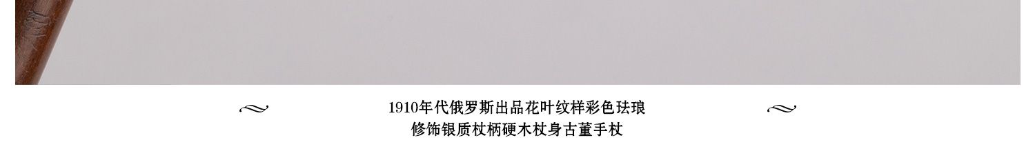 独角鹿西洋古董俄罗斯花叶纹样彩色珐琅银质杖柄硬木杖身古董手杖