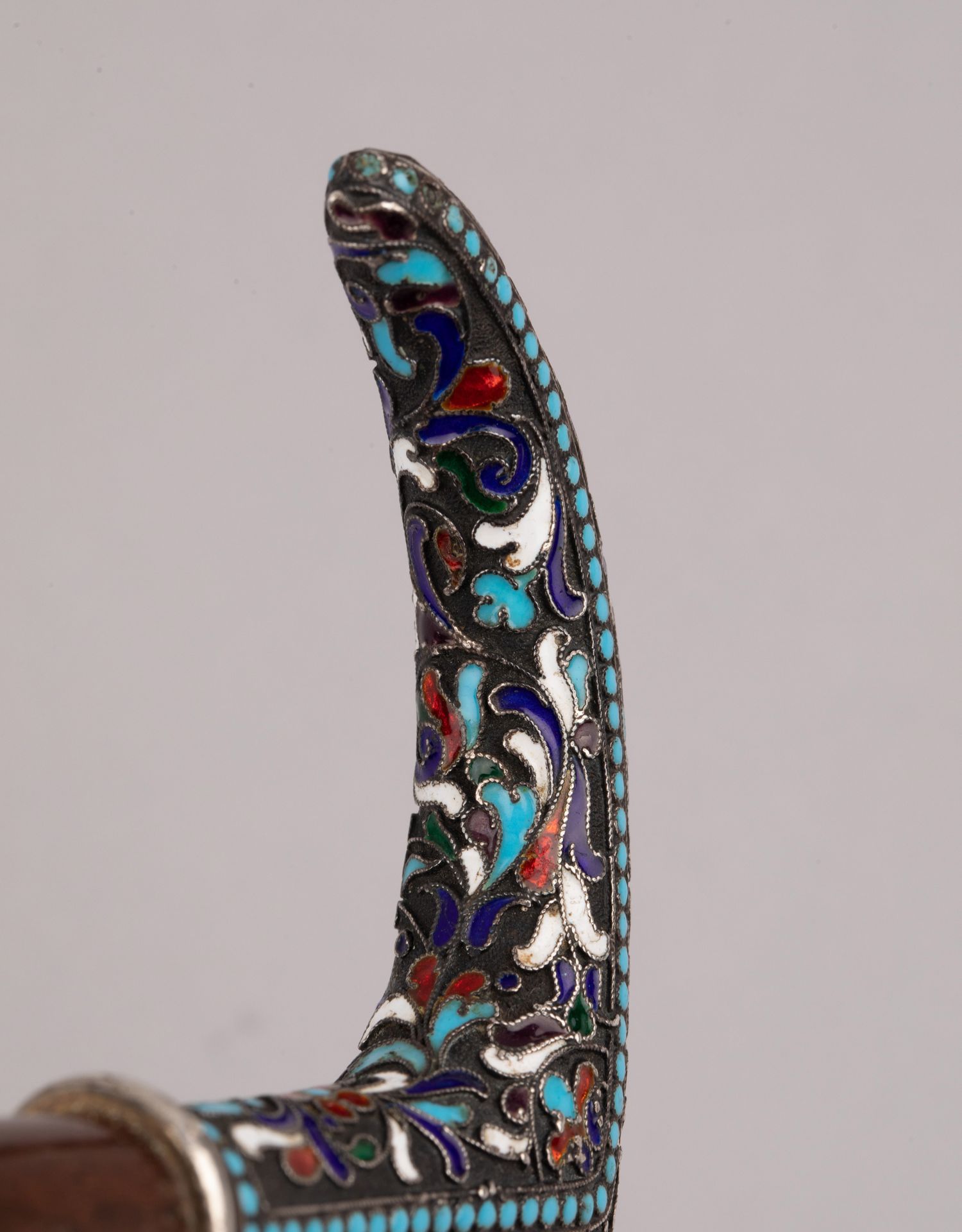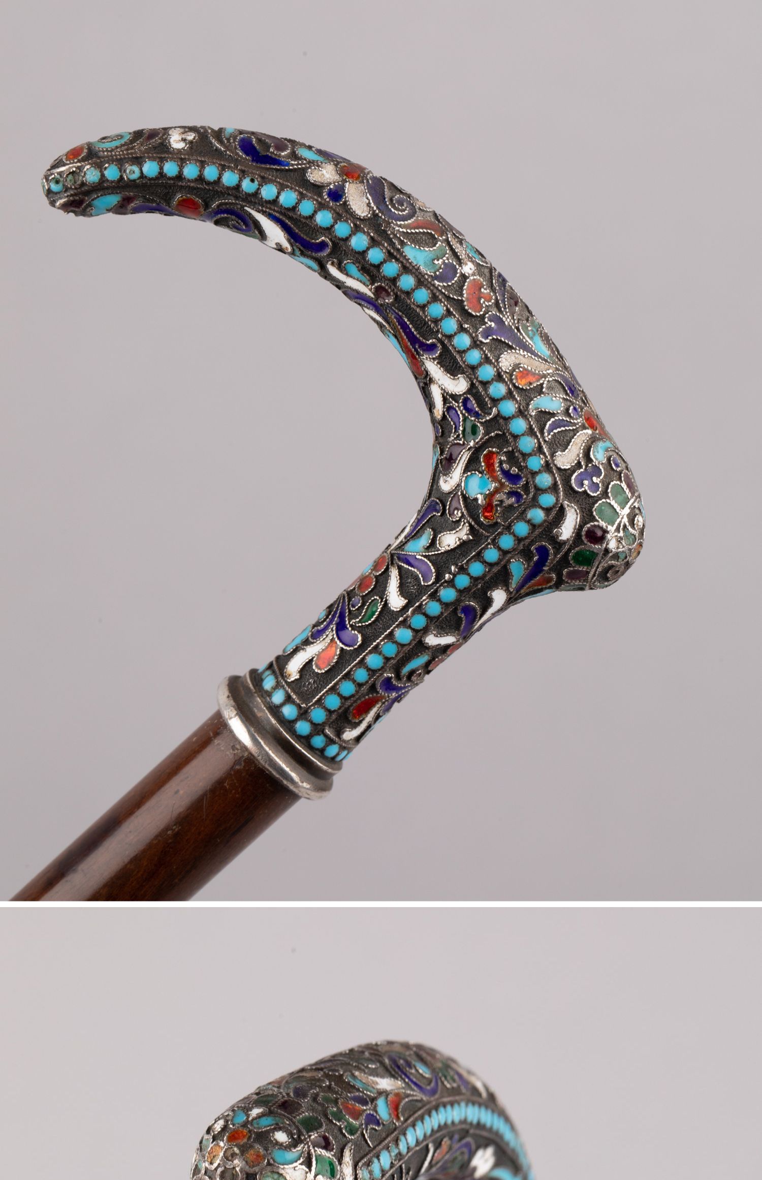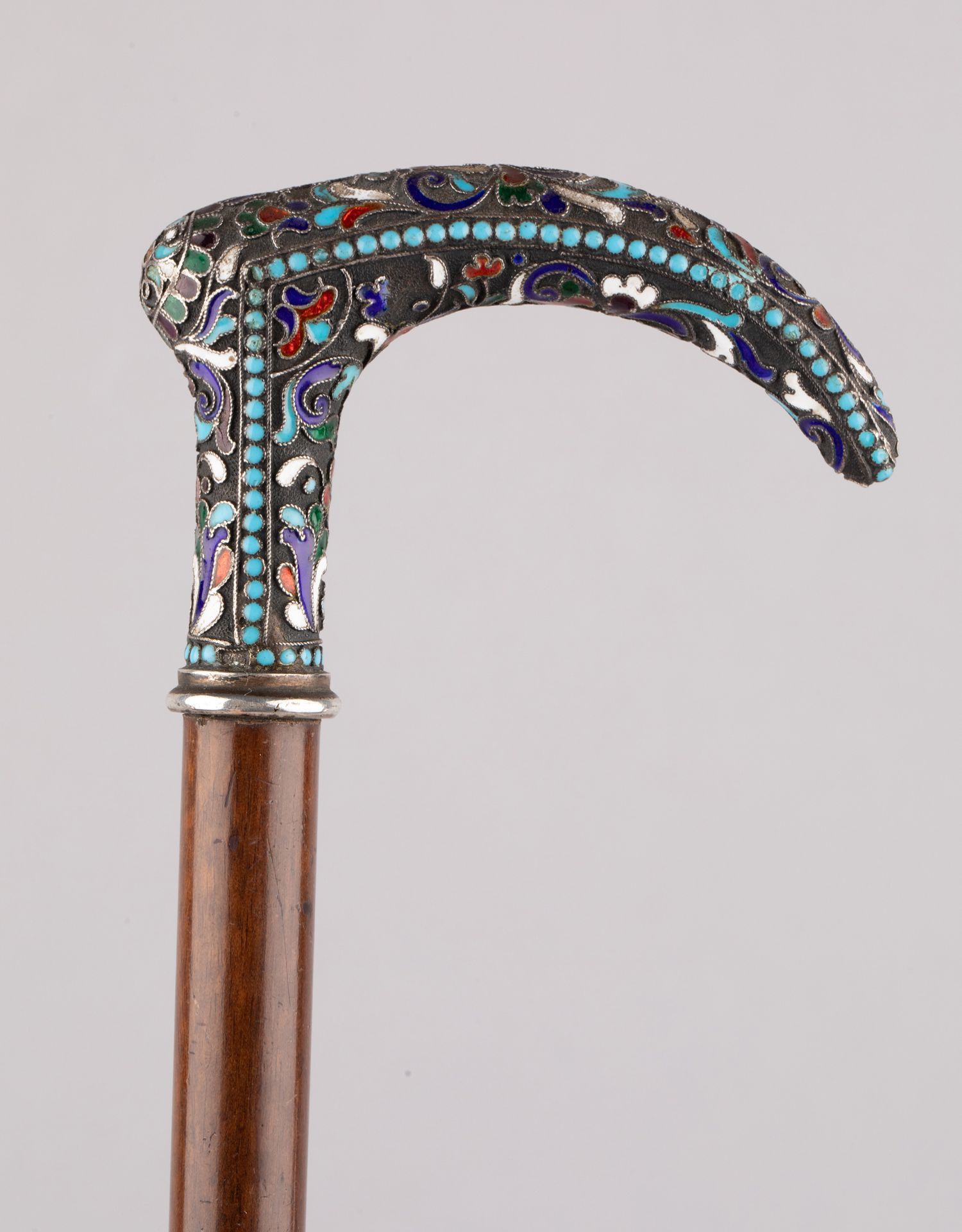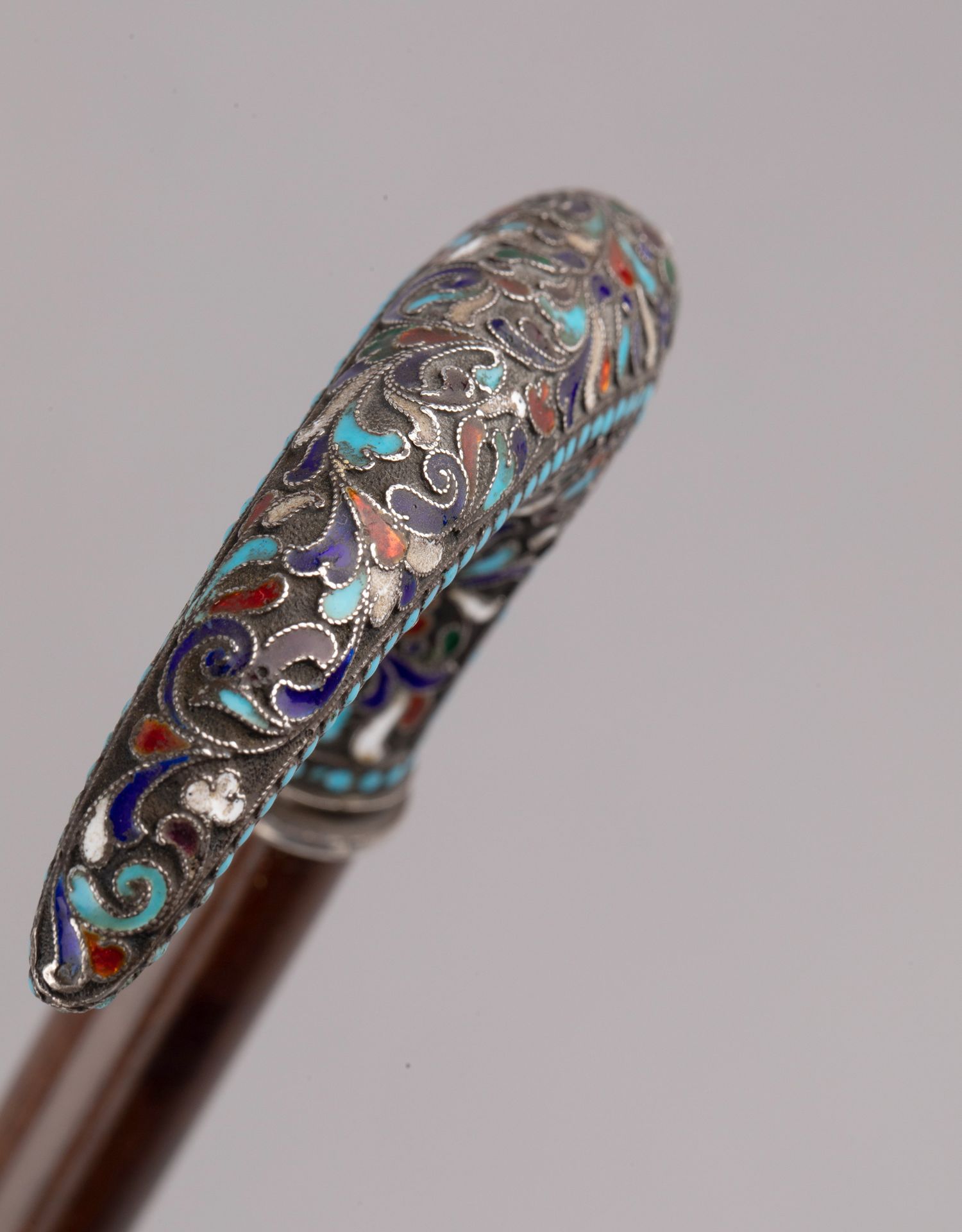 独角鹿西洋古董俄罗斯花叶纹样彩色珐琅银质杖柄硬木杖身古董手杖