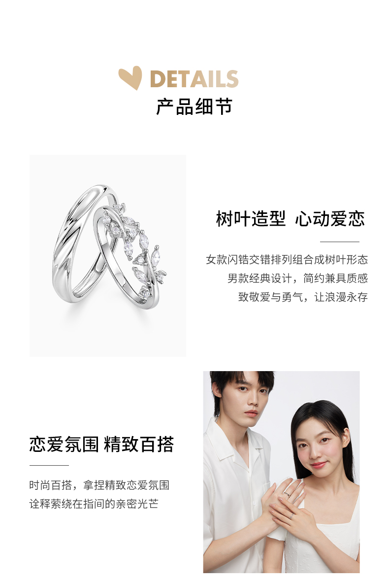 卡蒂罗KADER 相思乔木情侣对戒 连理枝镂空输液刻调节磨砂纹理 999足银 戒指 节日礼物 送女友