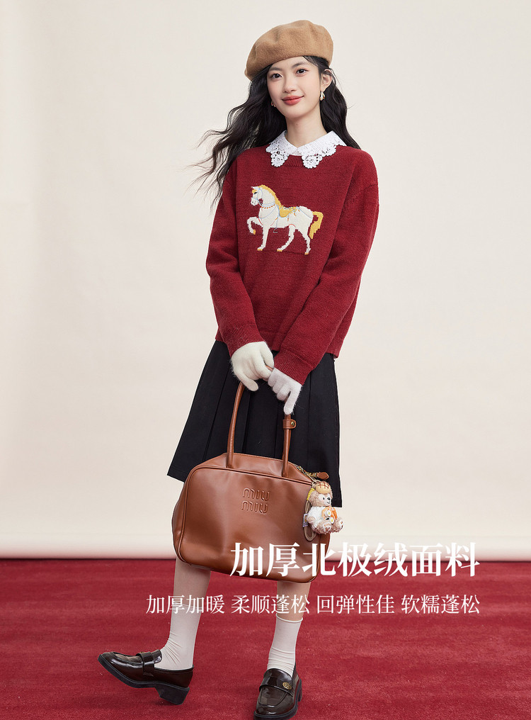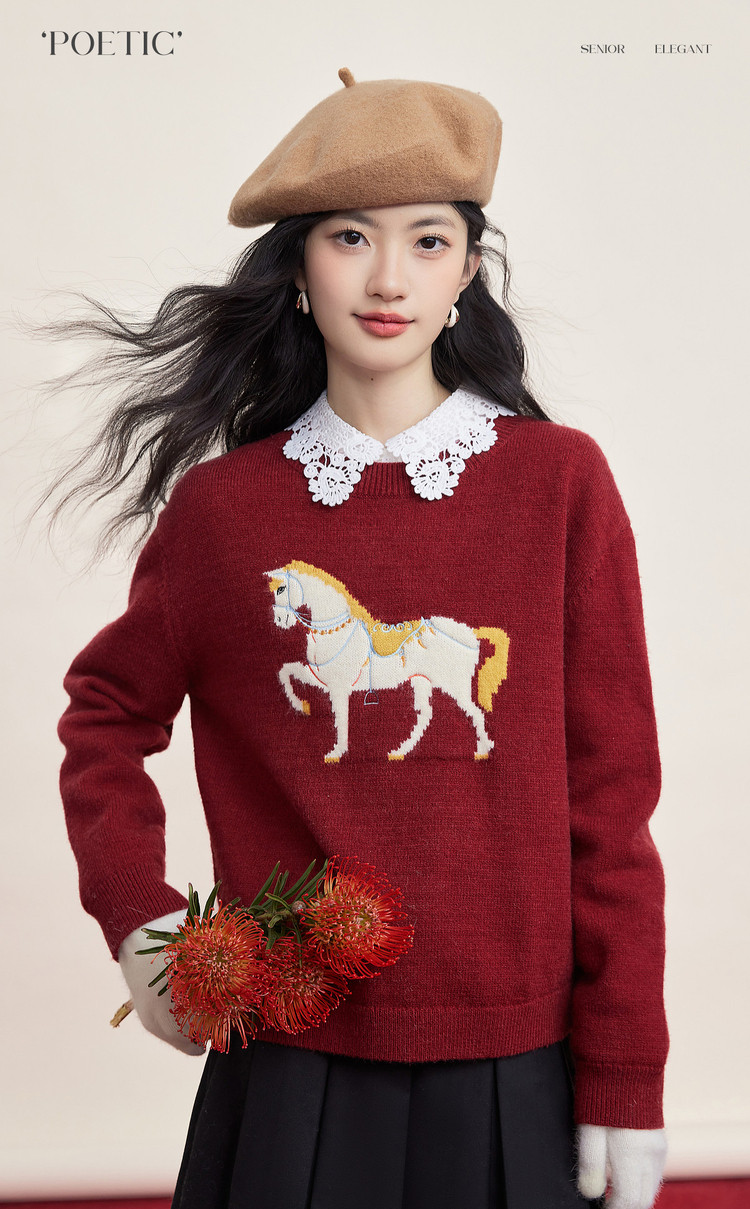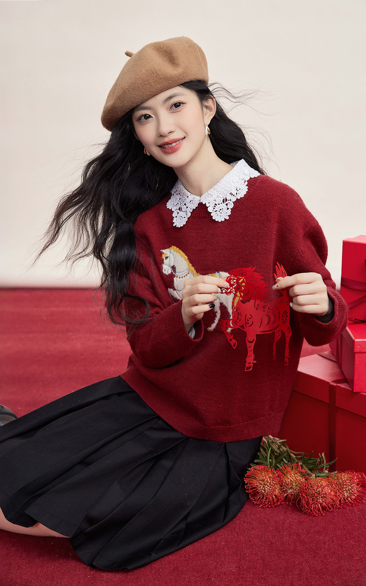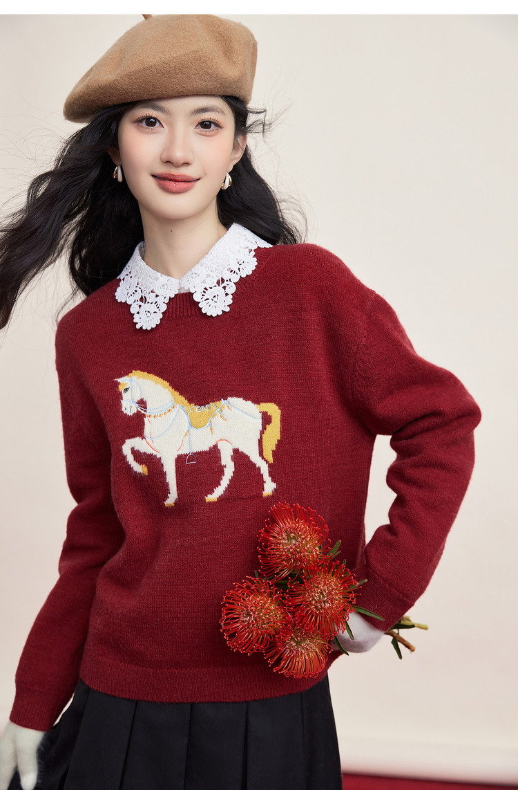 【12/31新品】熙世界「马年限定」小马提花套头毛衣冬加厚圆领本命年红色针织衫