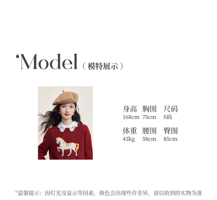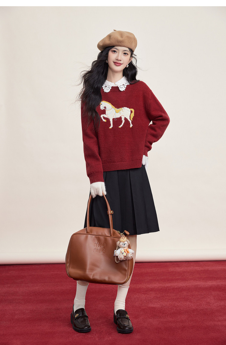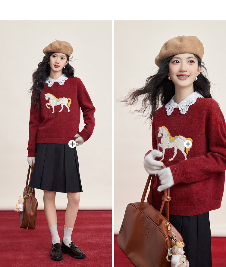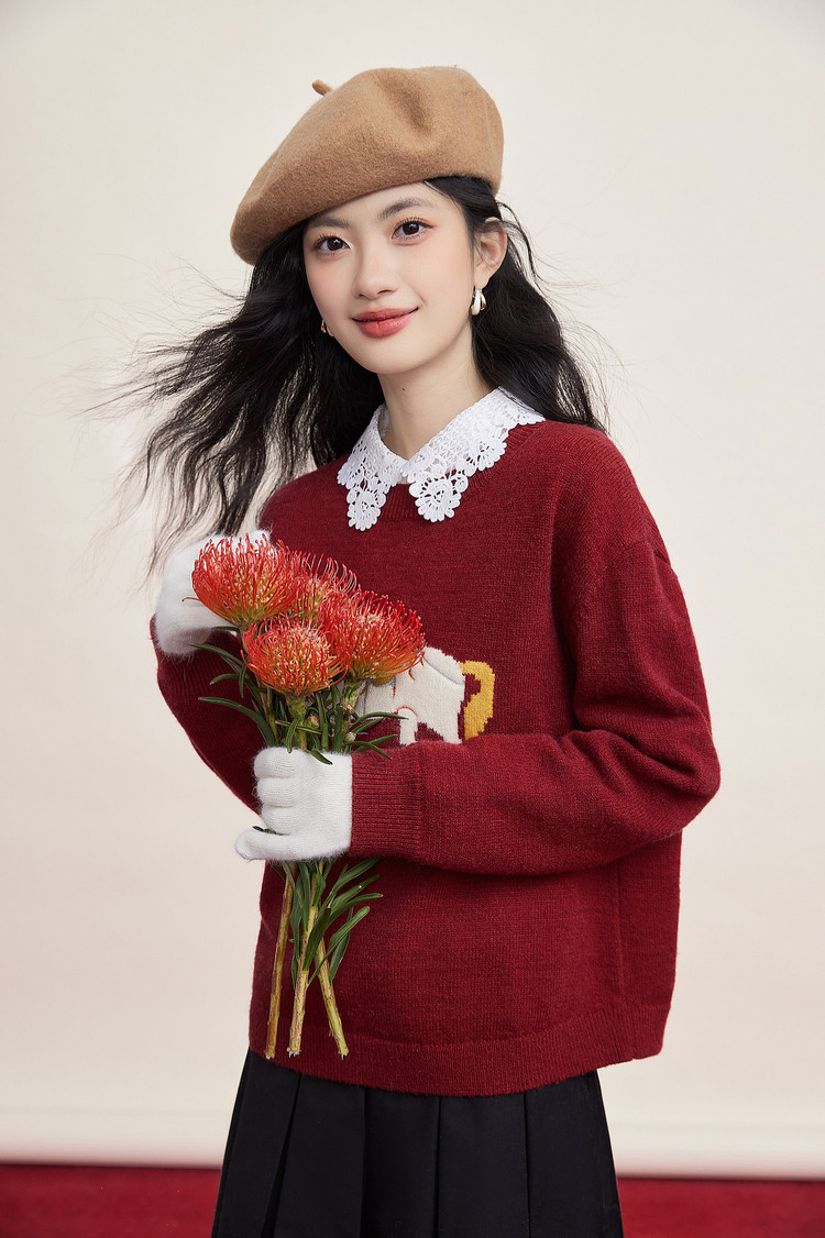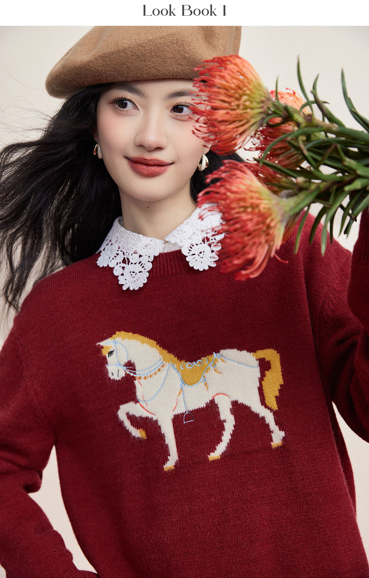 【12/31新品】熙世界「马年限定」小马提花套头毛衣冬加厚圆领本命年红色针织衫