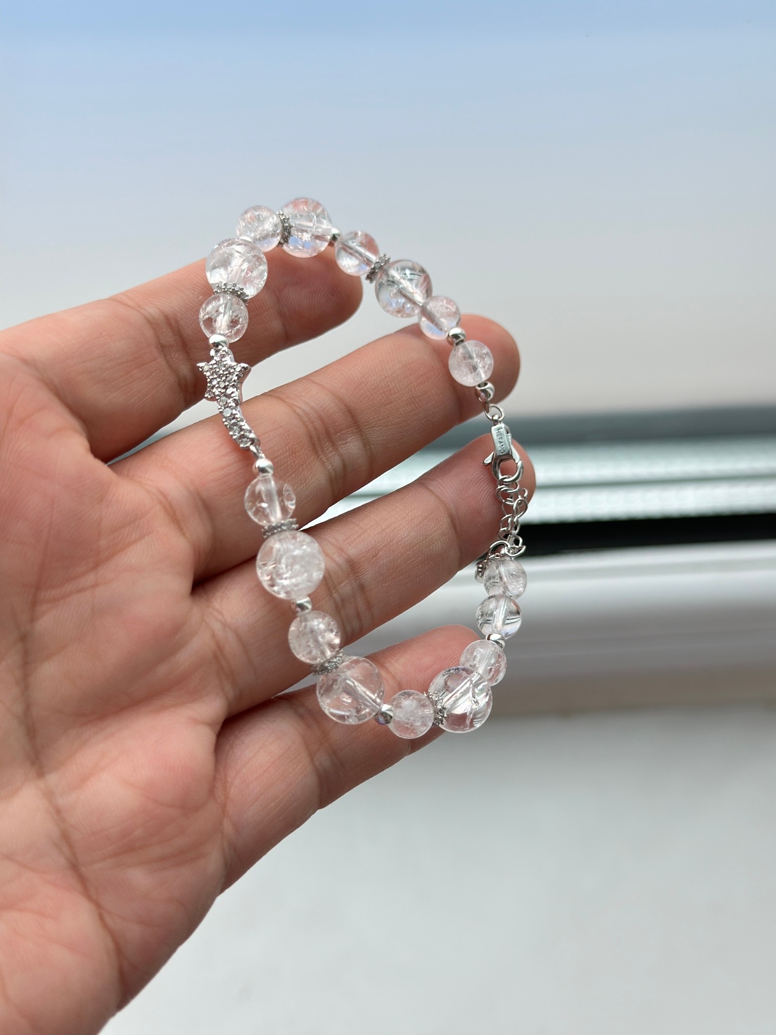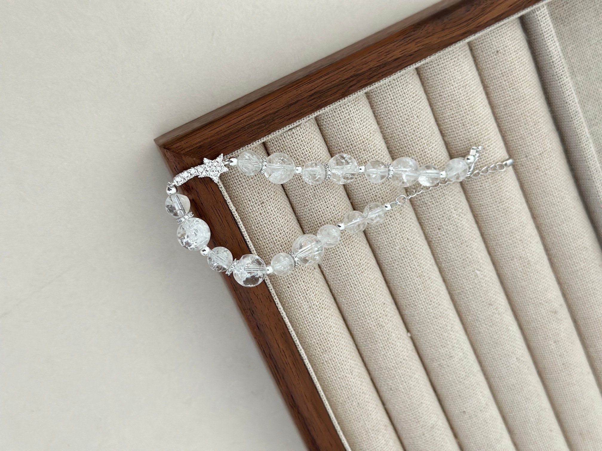 当流星划过夜空的刹那,所有未说出口的心愿都有了形状。何方将这份转瞬即逝的浪漫定格,让每一次抬手都似与星光撞个满怀。天然白水晶的纯净质地,在光影间流转着细碎光泽,仿佛把银河的碎片戴在了腕间。简约设计中藏着不张扬的温柔力量——它是写给生活的散文诗,是藏在细节里的小确幸。