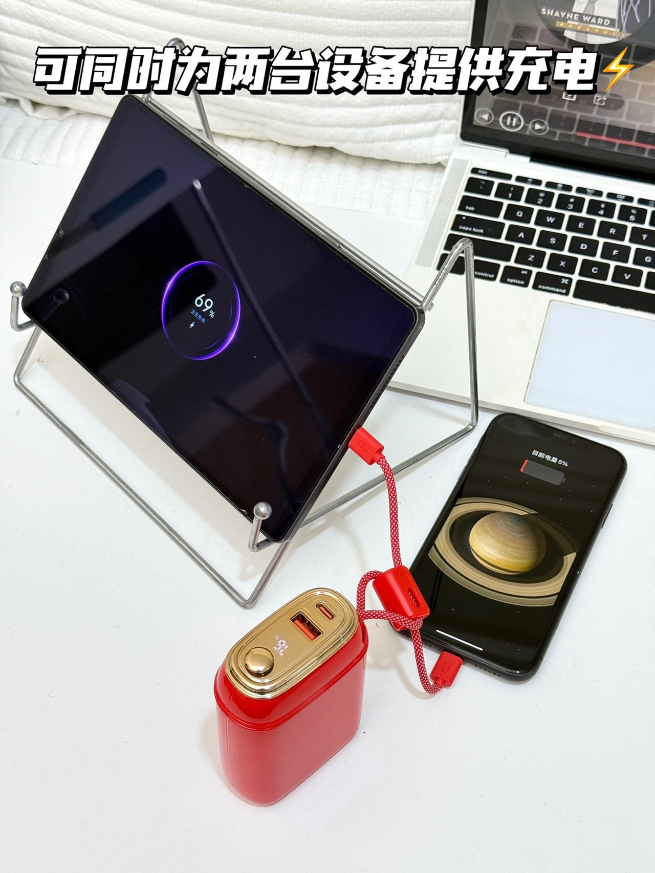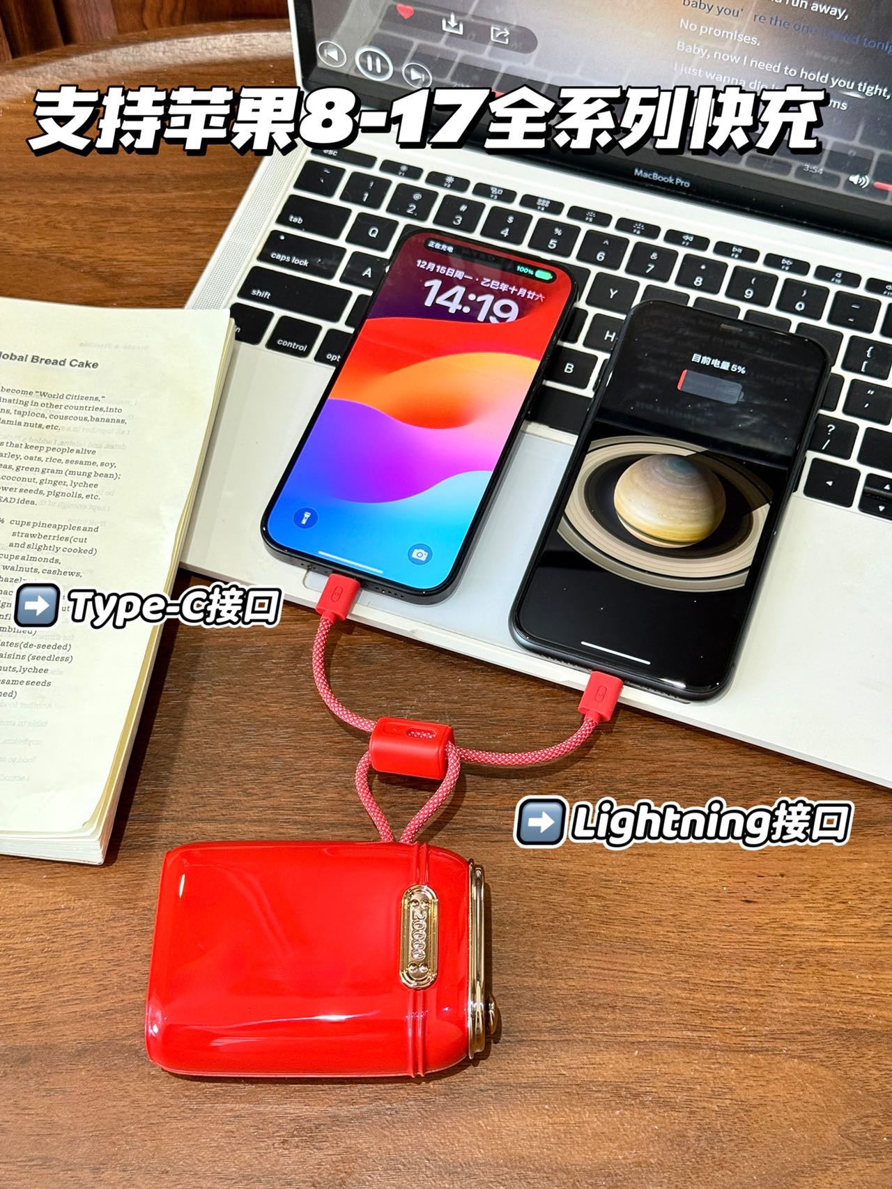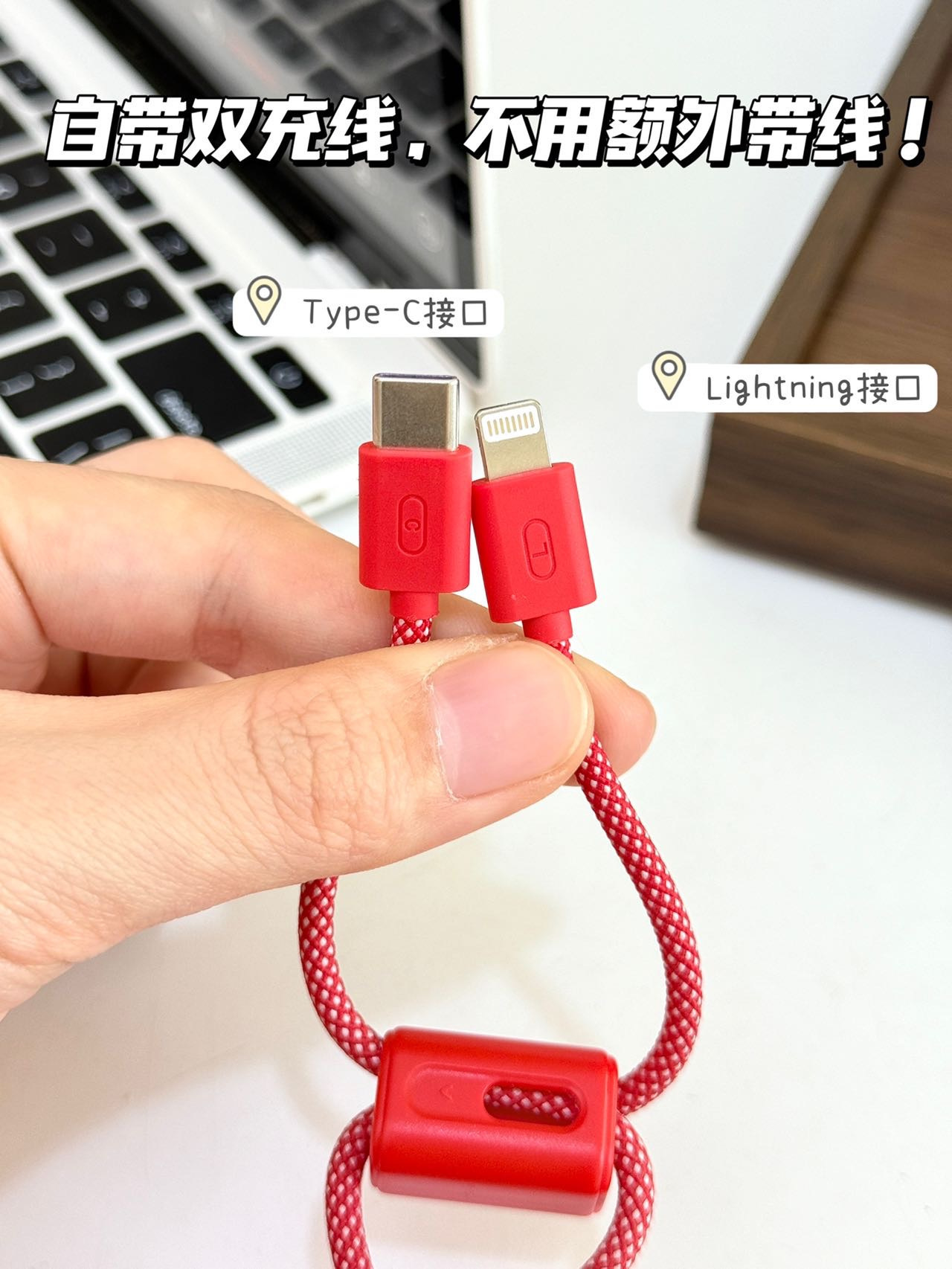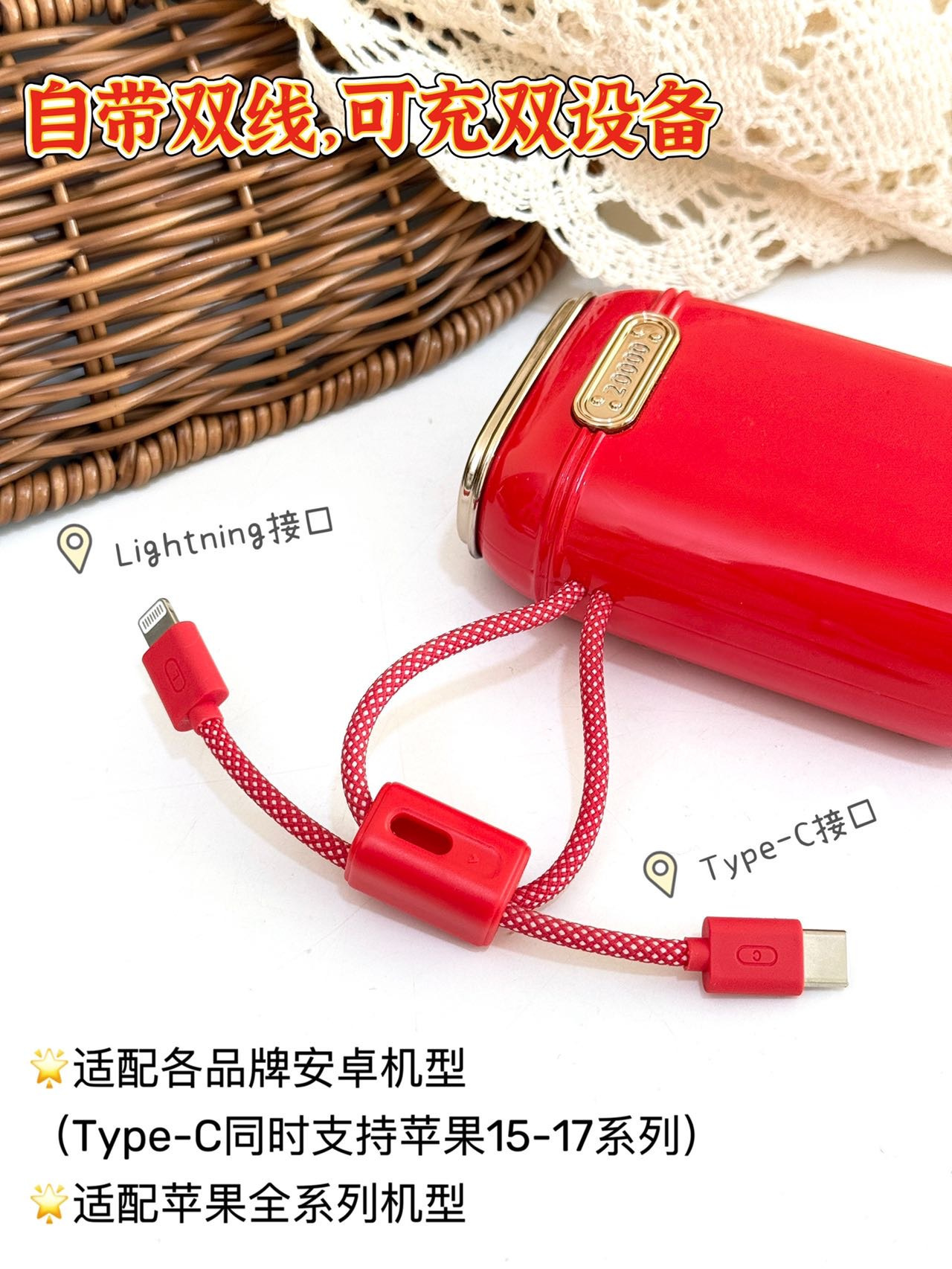 ✅拥有lightning/Type-C双充电口,双输入双输出,搭配外置双头快充,支持苹果全系列PD快充和华为22.5W超级快充