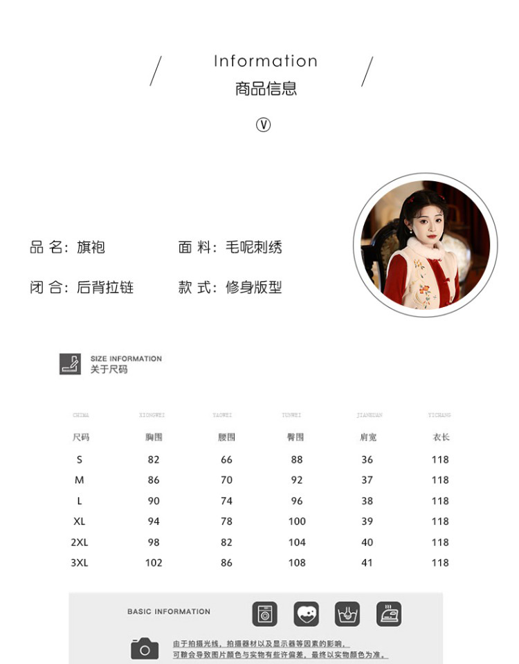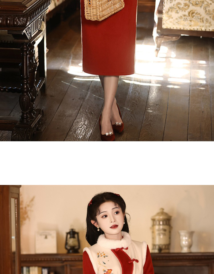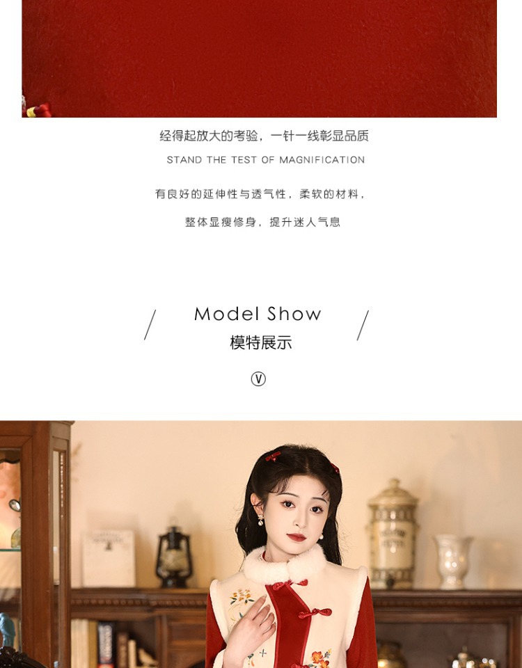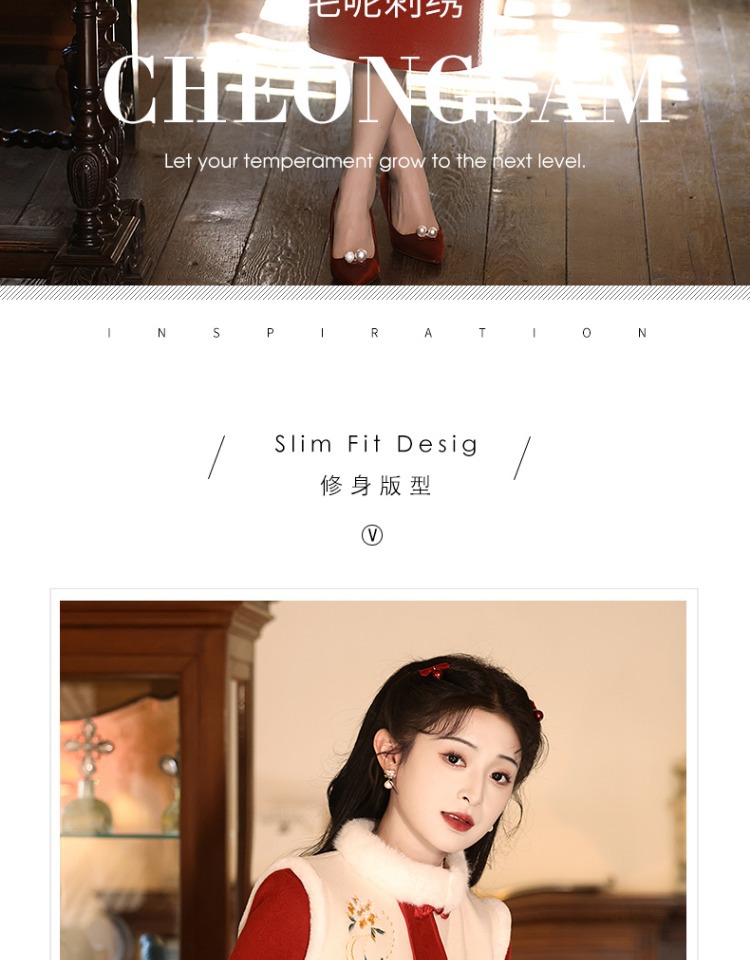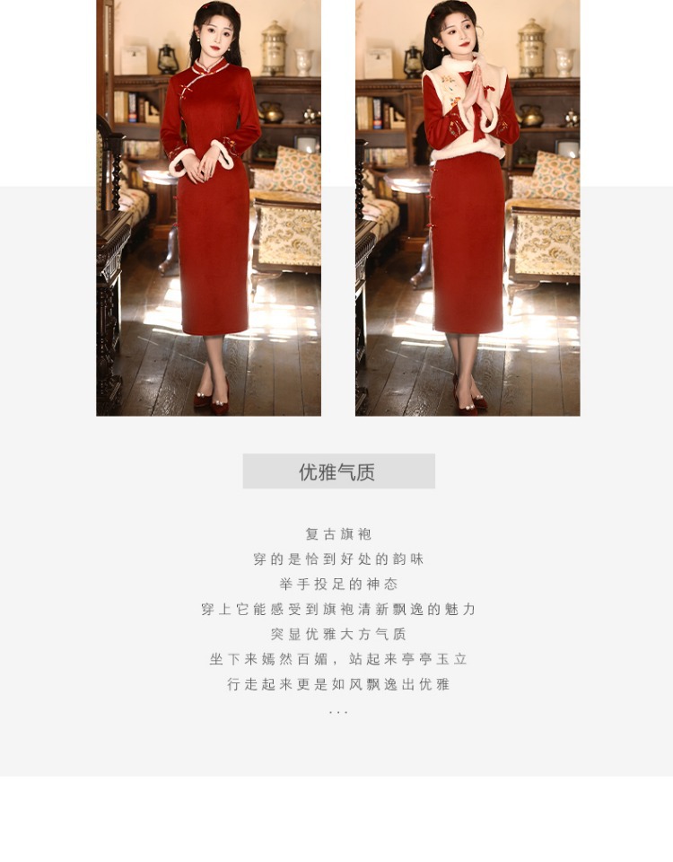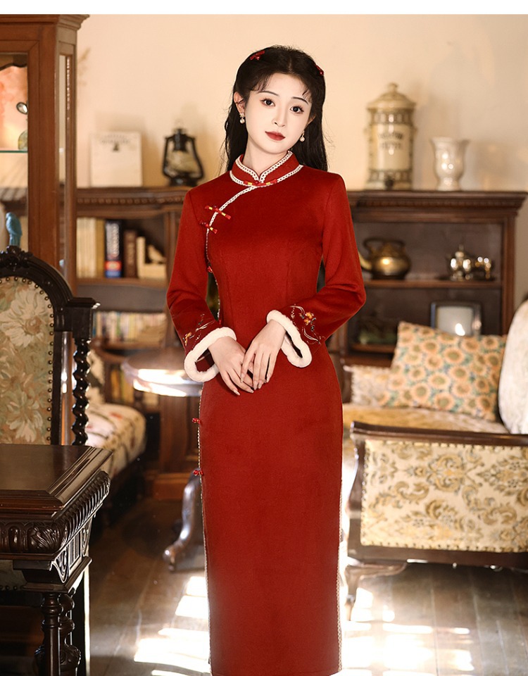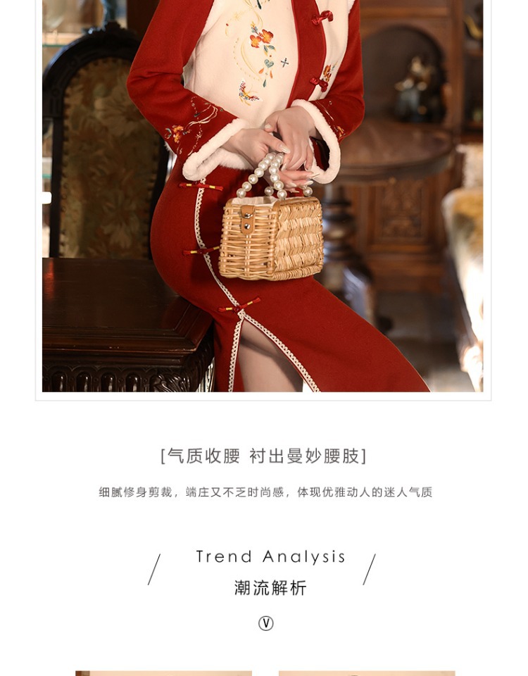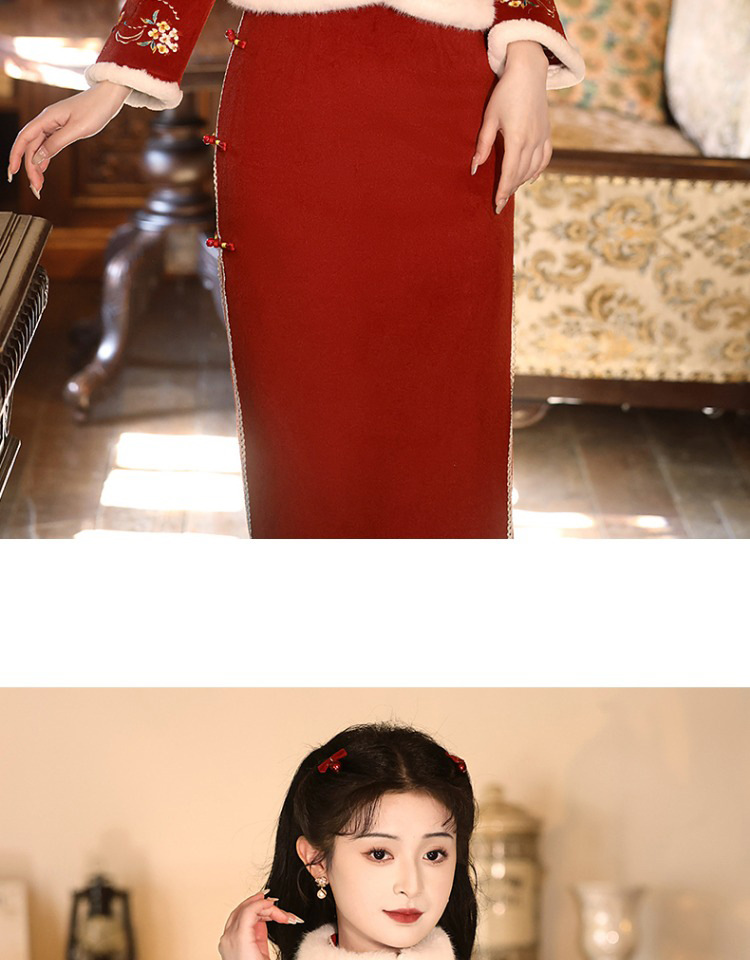 蕾丝加绒长袖保暖毛领日常旗袍 MLS6113