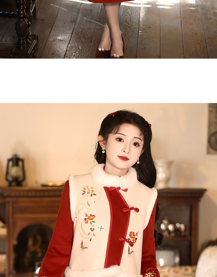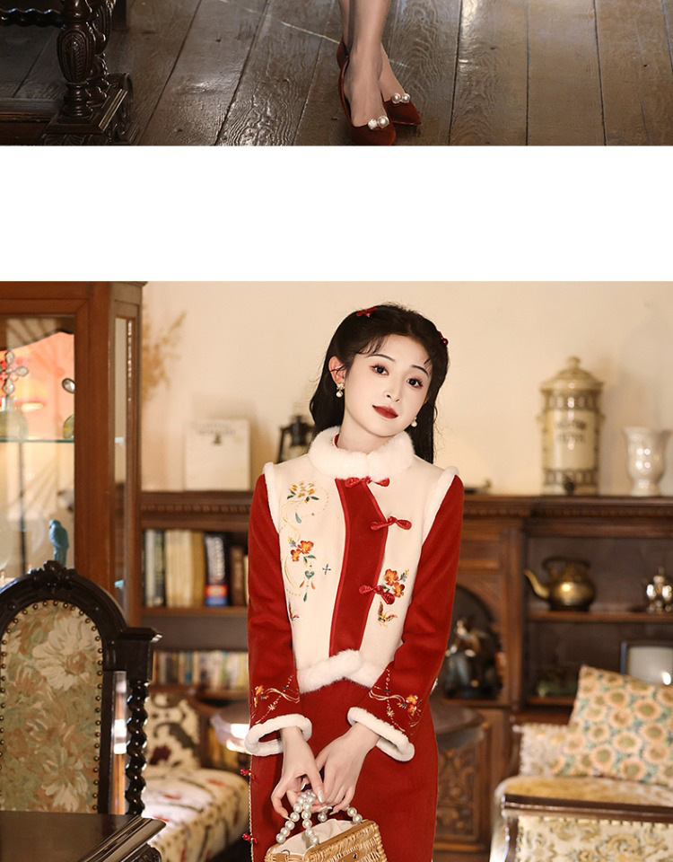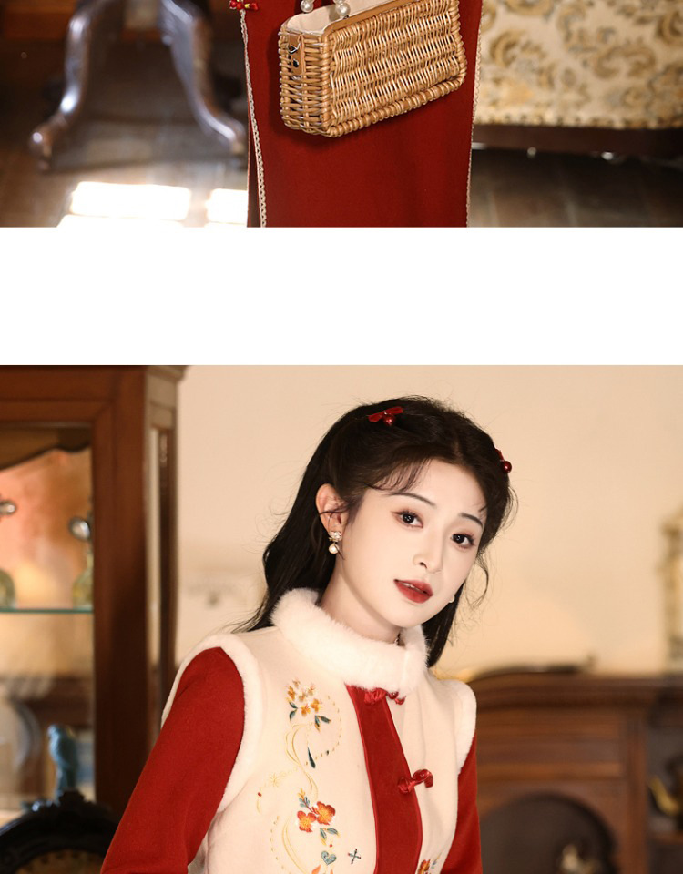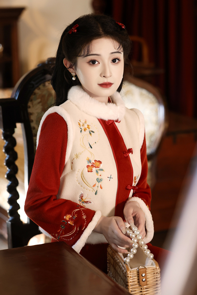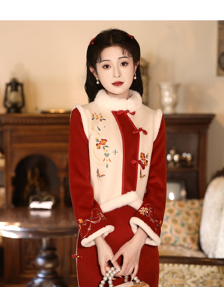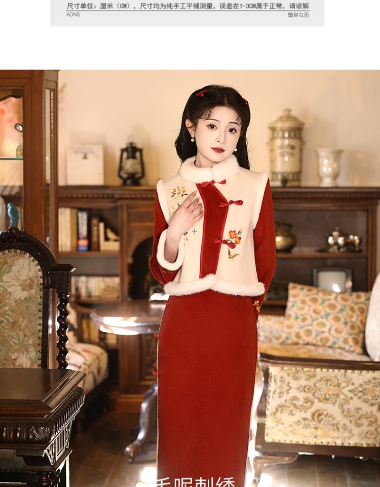加厚毛呢刺绣拜年服,过年新年马甲+唐装旗袍两件套装LSB-2524