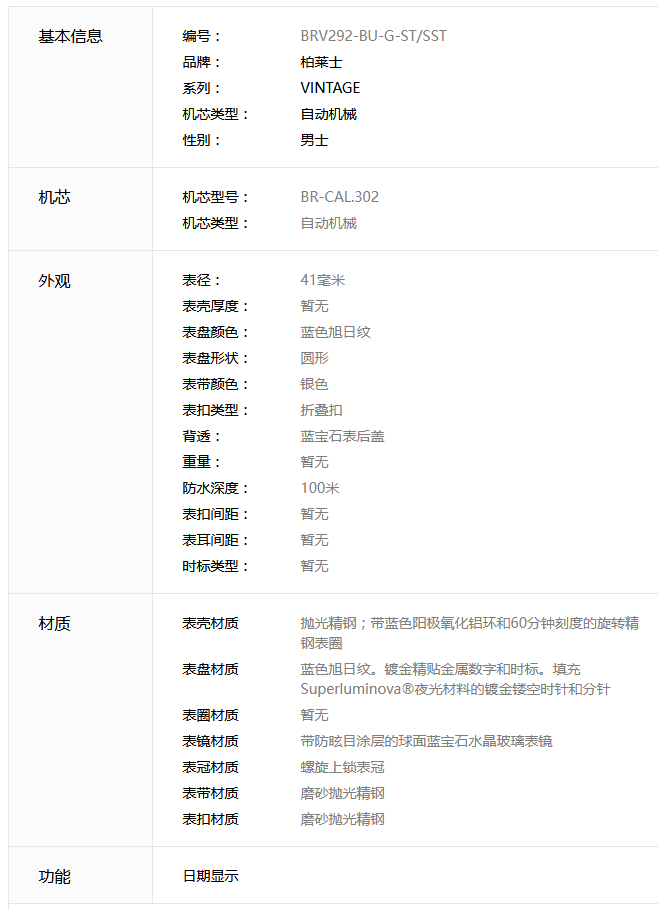 Bell & Ross 柏莱士 VINTAGE 系列 BRV292-BU-G-ST/SST 腕表