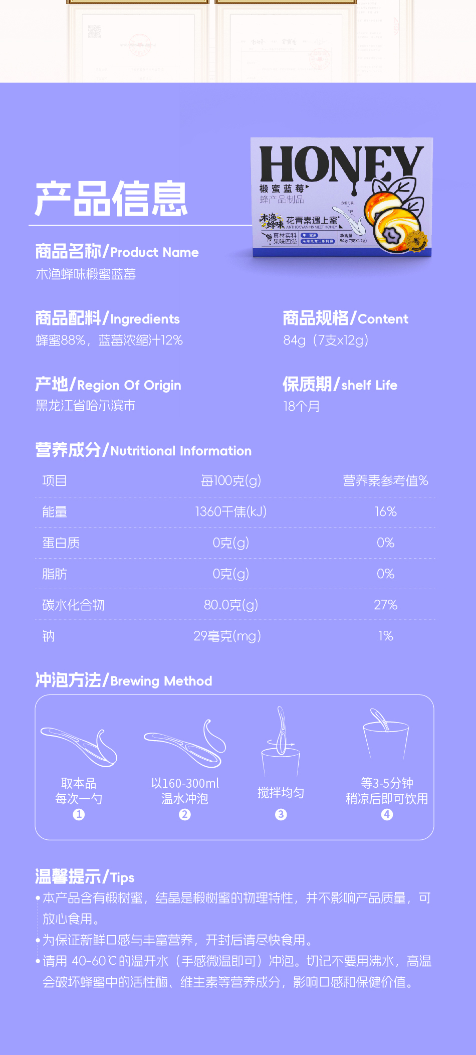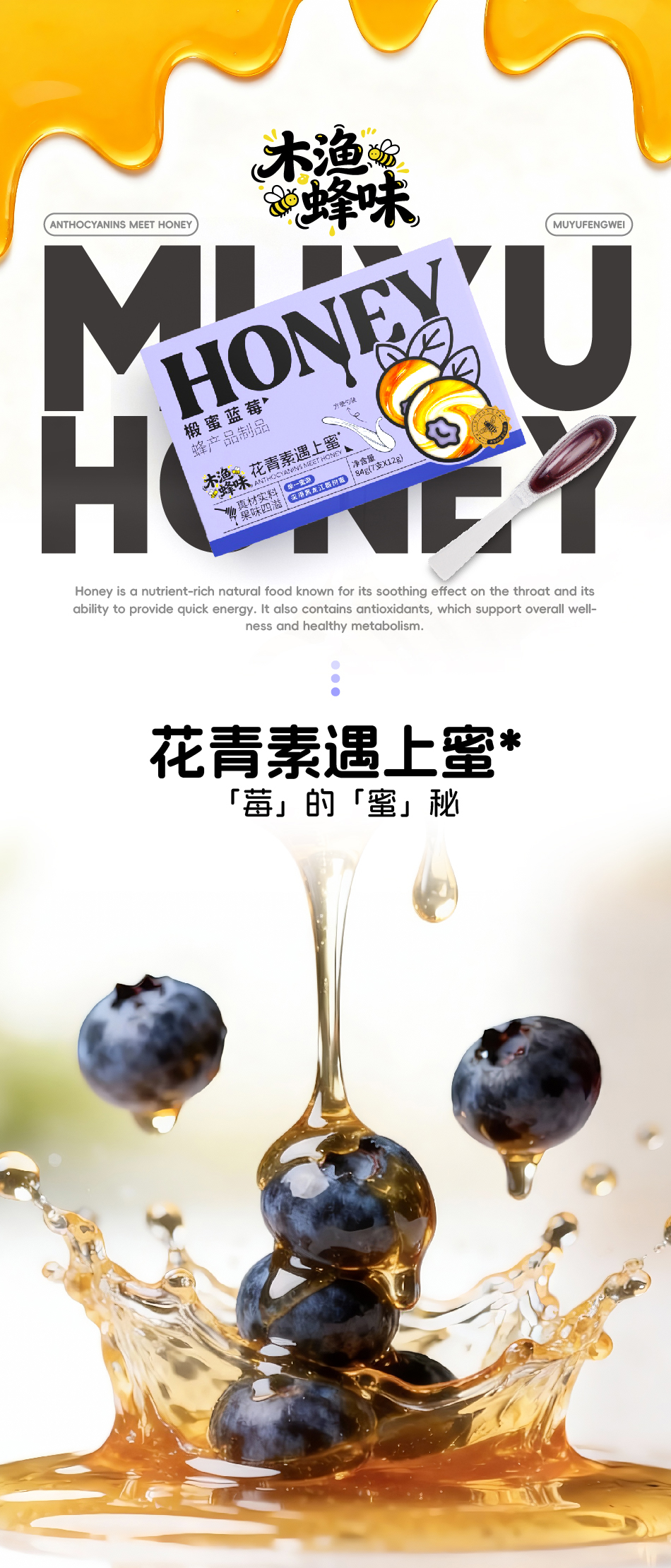 「木渔蜂味」椴蜜蓝莓 花青素遇上蜜 本真食材 蜜莓双加 花果香甜 7支*12g
