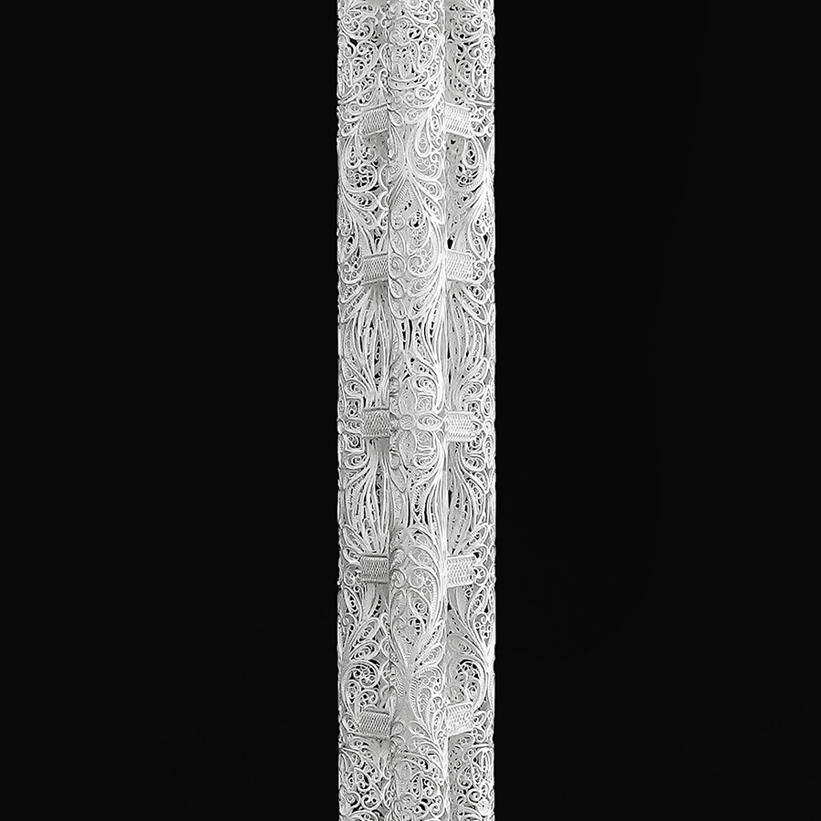 【作品简介】:作品以上海明珠塔为创作核心,运用银花丝工艺精制而成。白玉兰象征上海之繁荣兴盛,卷草纹寓意上海之文化传承。作者巧手将两者韵味融合,尽显海派风华。寄情此作,颂上海盛世之景,祈愿蓬勃永续,雅韵悠长。