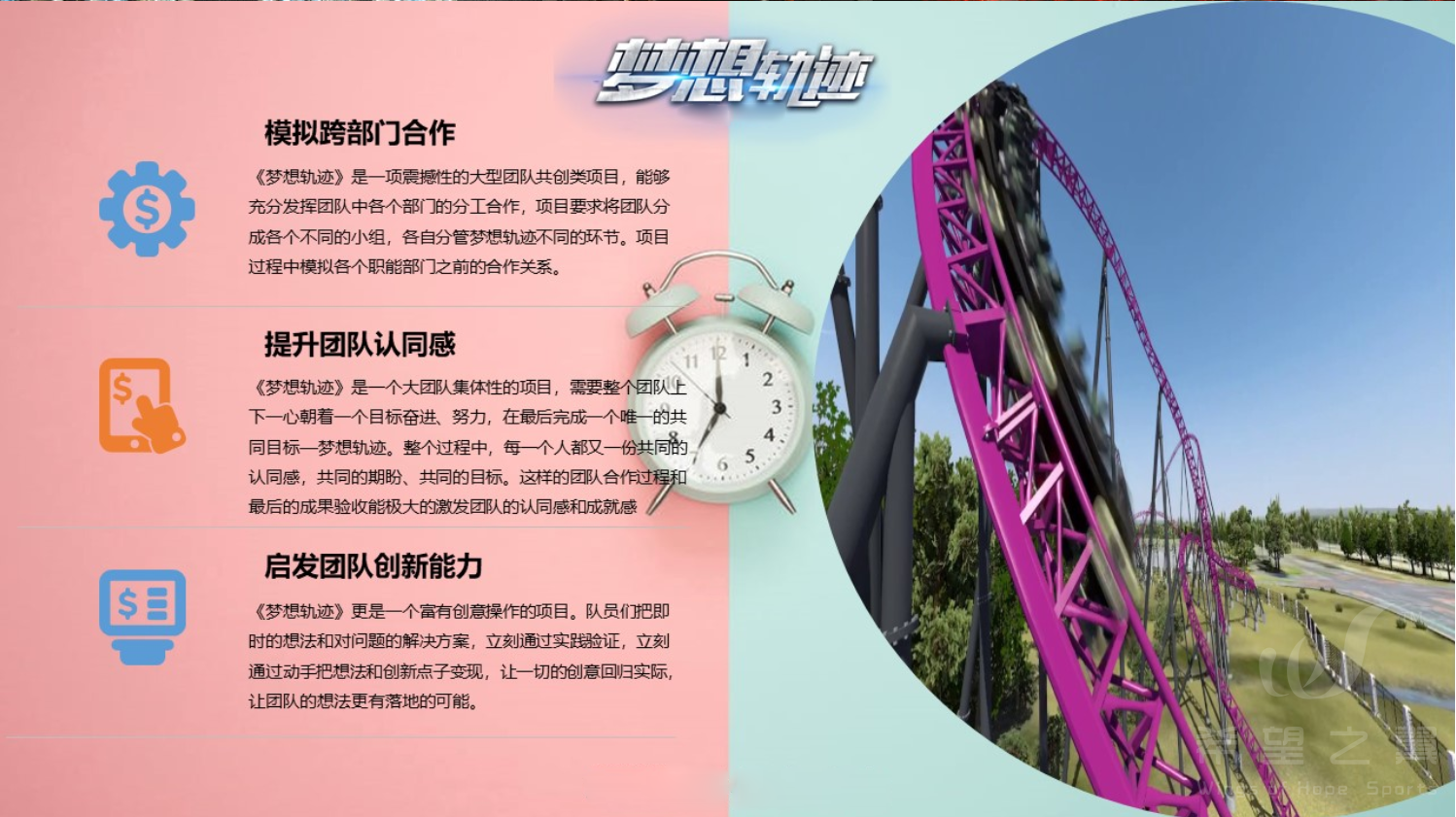 请用你们的智慧,协同团队成员,在有限的时间、有限的资源环境下无限发 挥,制作一套“过山车”的轨道,让“梦想”在这轨道上畅行和飞跃!