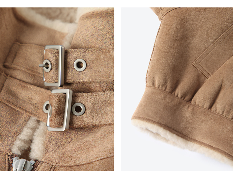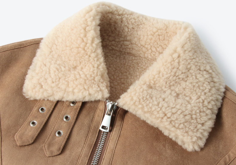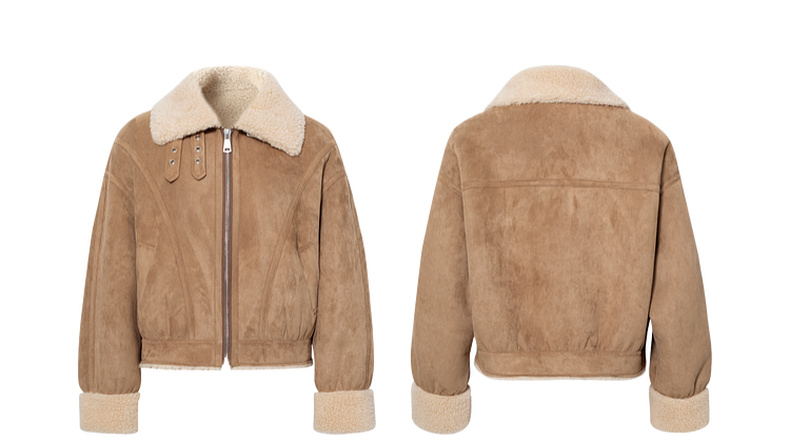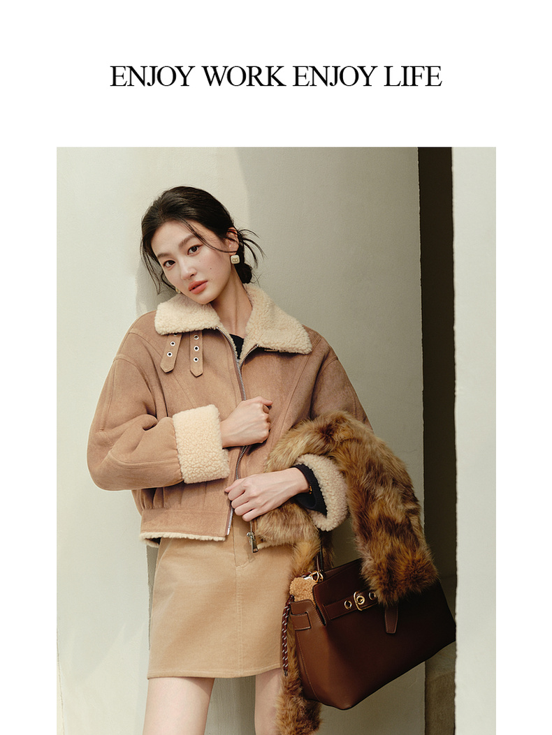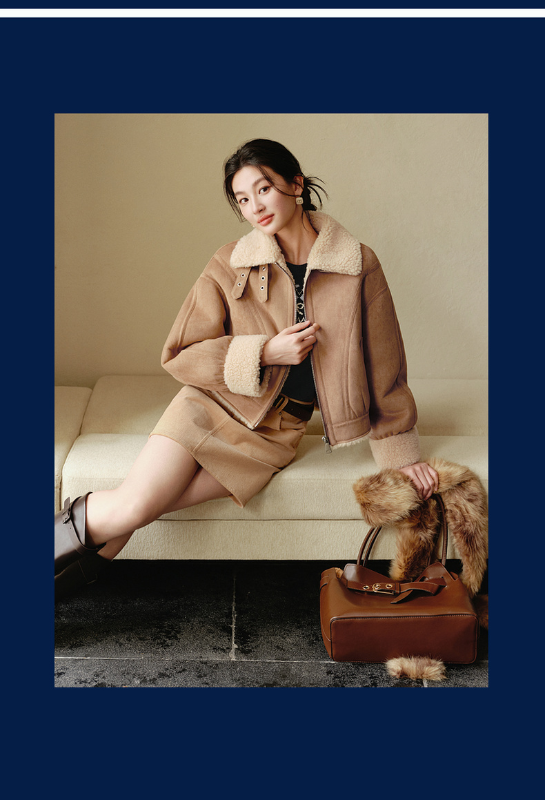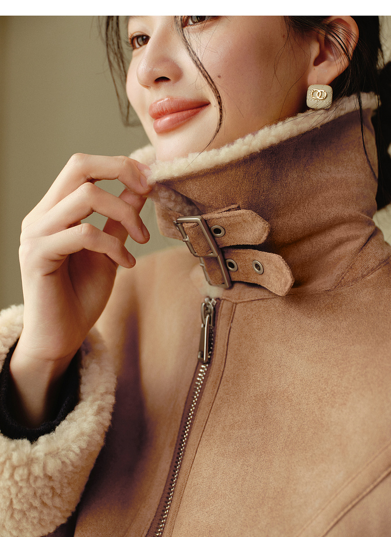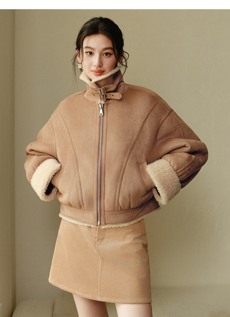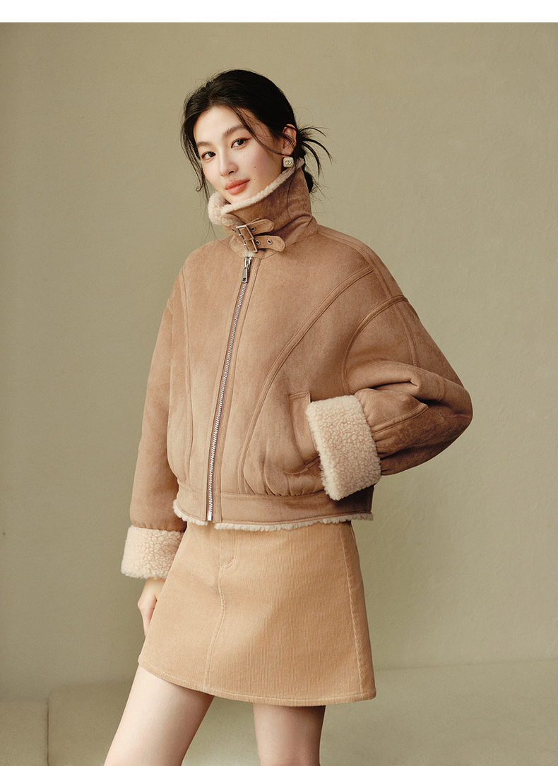 【严选】诗凡黎羊羔毛领宽松保暖短夹克2025冬新款机车翻领羊毛麂皮外套女7GA410601