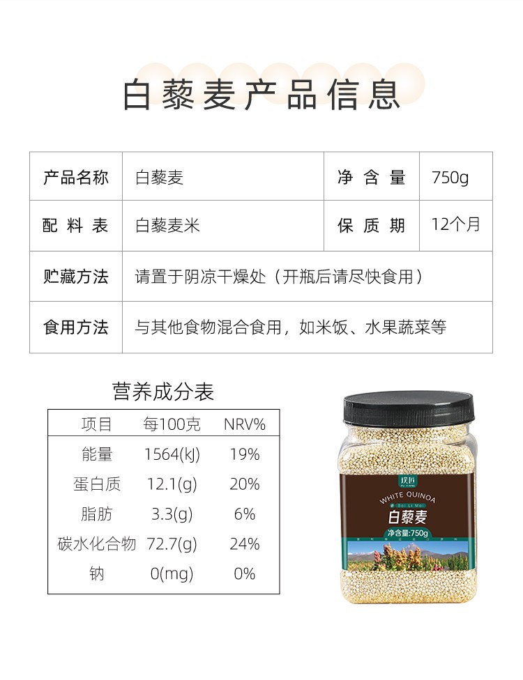 璞匠玻利维亚白藜麦米杂粮高原黍黎米代餐粗粮750g罐装