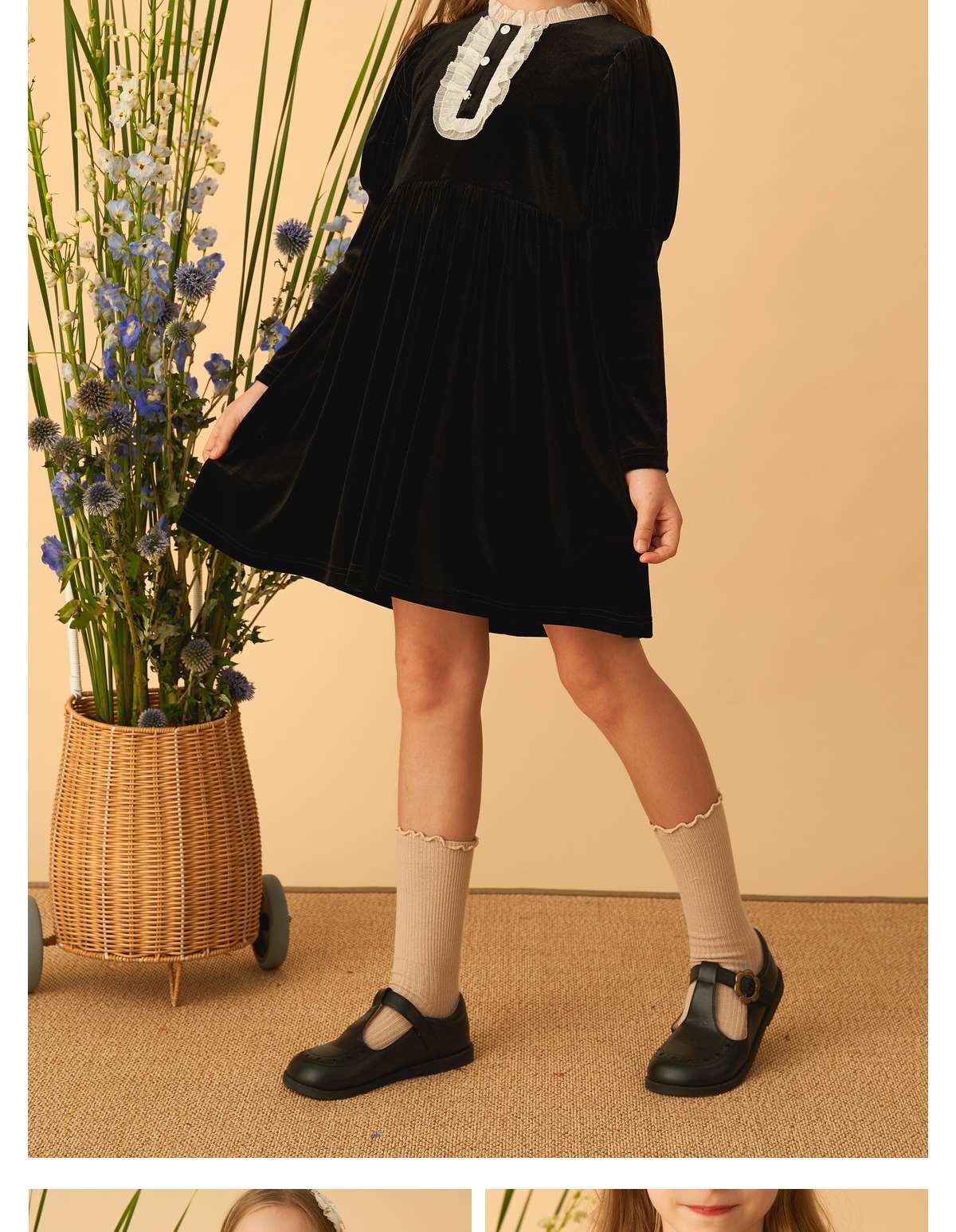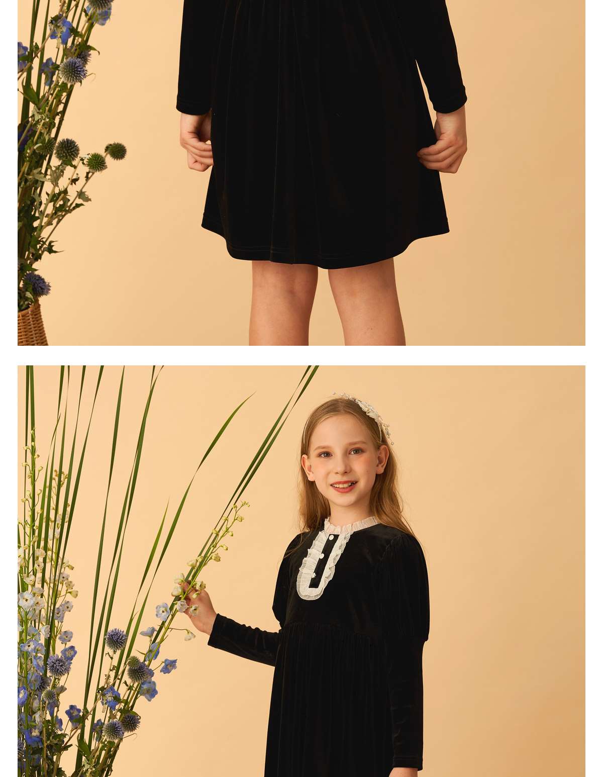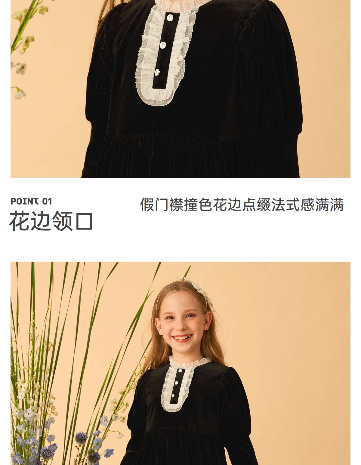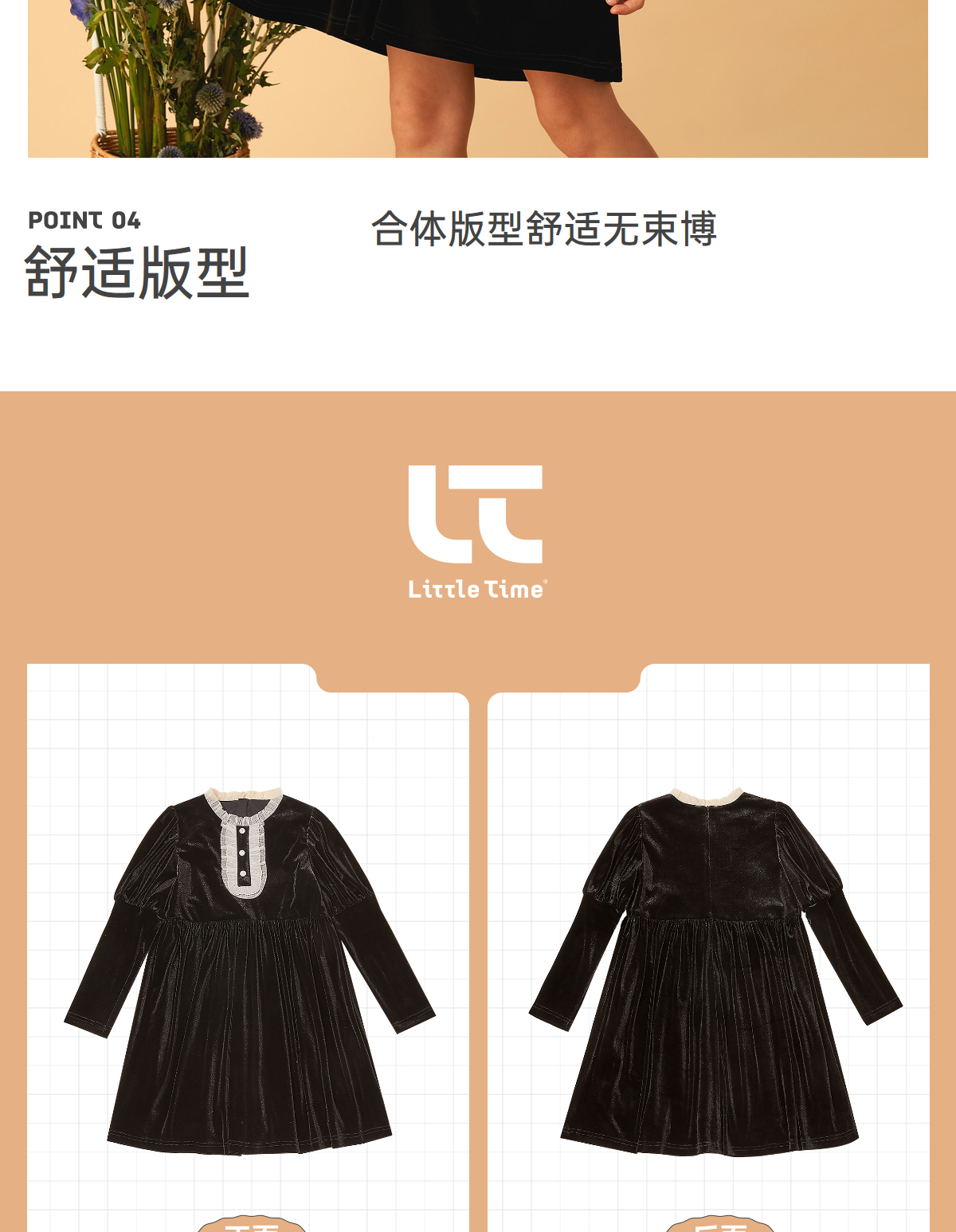 littletime秋季女童赫本风小黑裙2022新款女大童灯笼袖丝绒连衣裙