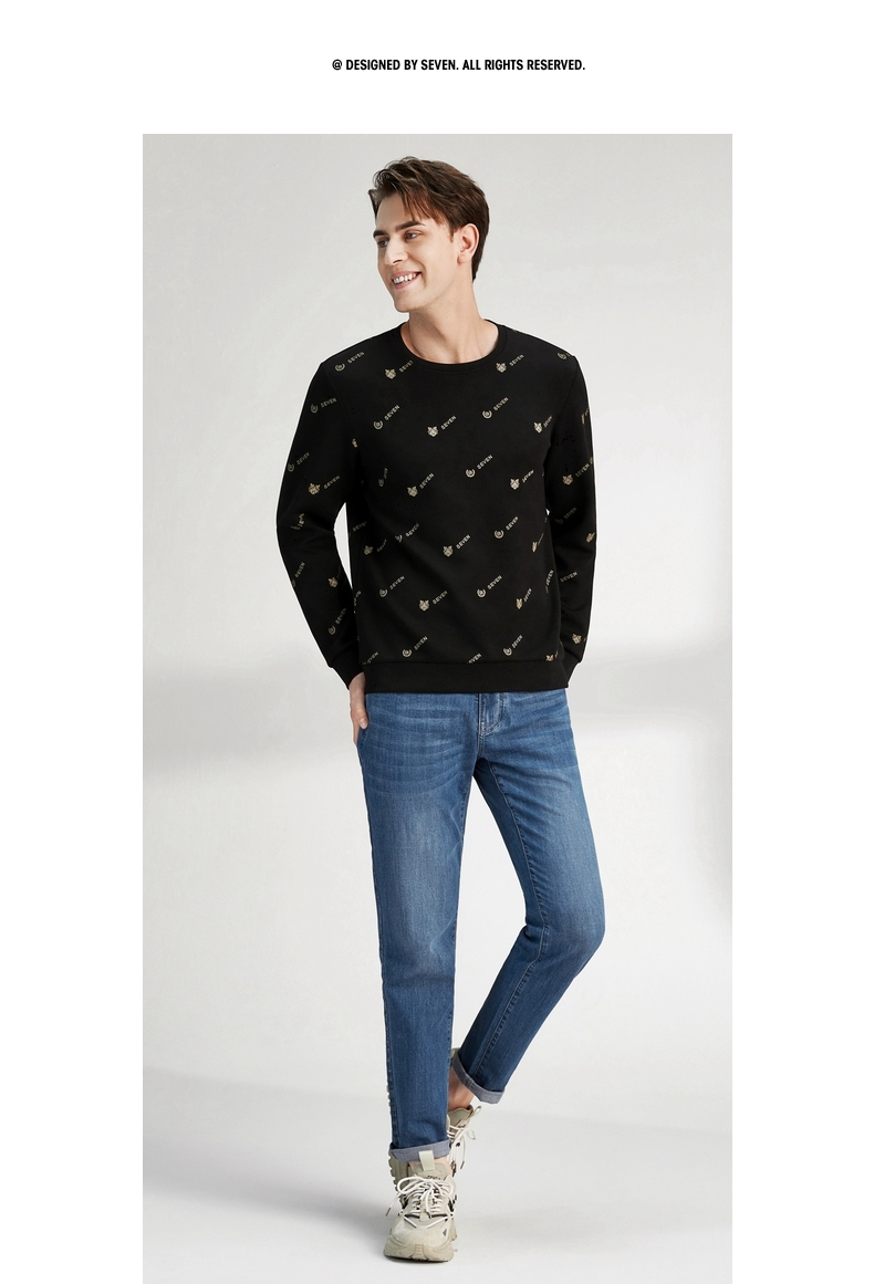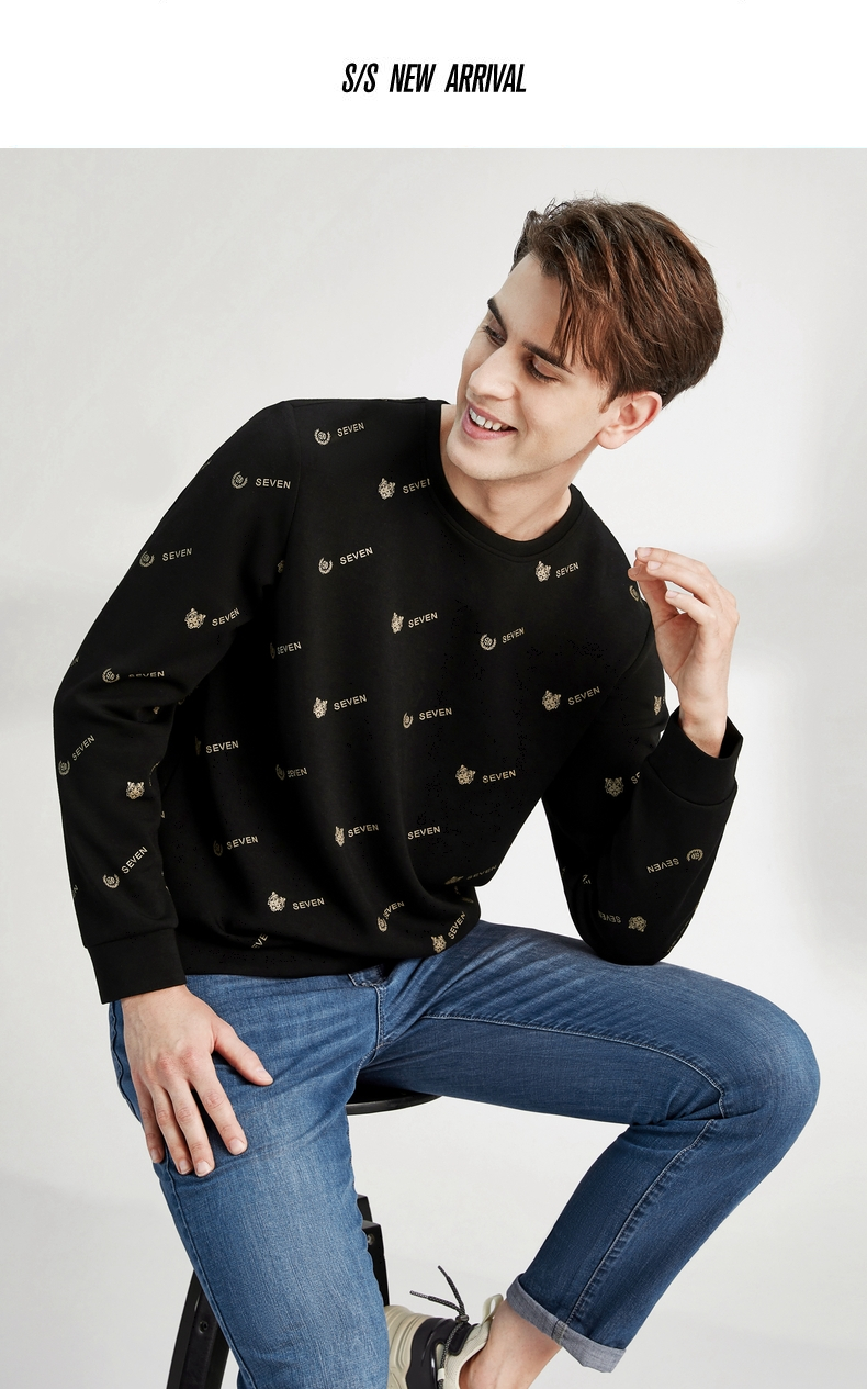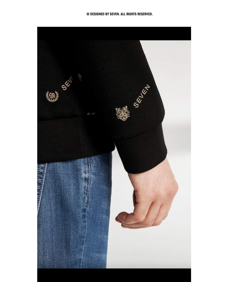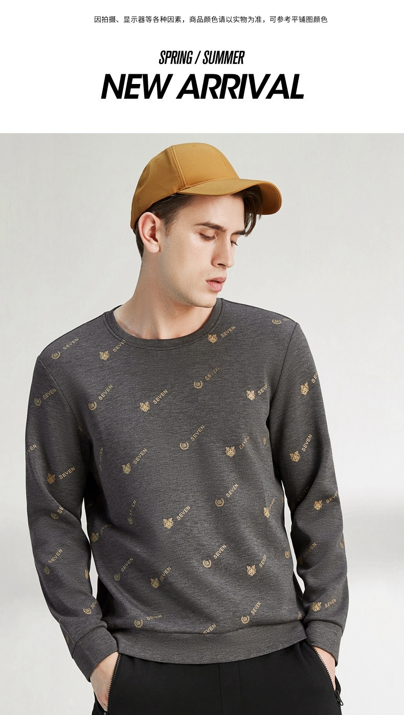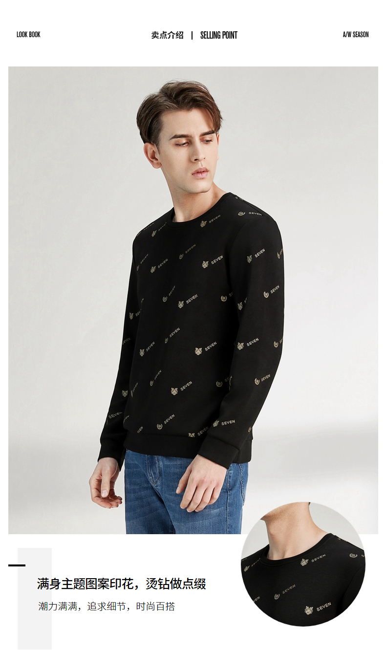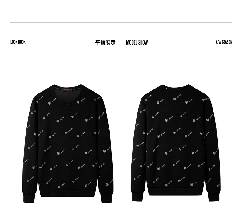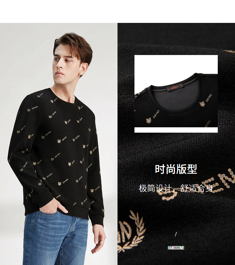 【特价】柒牌卫衣男新款时尚潮流青年老虎圆领印花黑色春秋长袖套头衫 122W70150