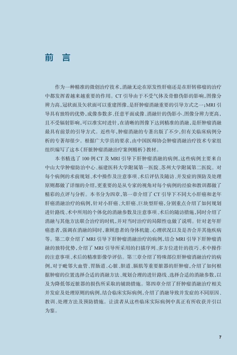 为了让广大从业者从医疗实践中学到更多的内容,中国医师协会介入医学分会肿瘤消融治疗专业委员会牵头,编写一本以图文并茂的形式介绍针对不同肝肿瘤患者消融治疗过程策略的专著,使得读者在肝肿瘤消融治疗遇到问题时有图可查,充分指导临床实践。此专著拟从临床实践中精选近百例真实病例,以图谱的形式展现给读者,并对每个病例进行点评,详细讲解治疗过程中遇到的问题,以便让读者在实践当中参考学习。 此专著共计收录病例100例。