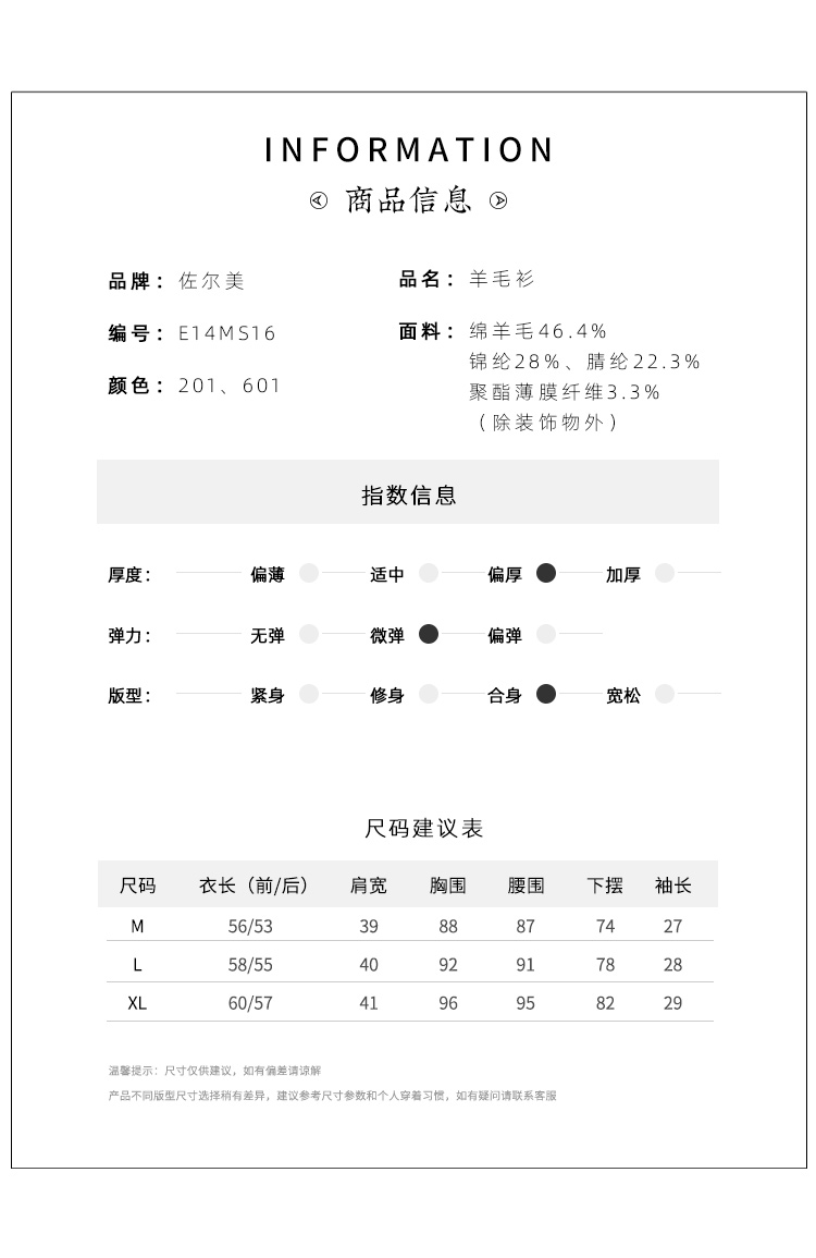 佐尔美2022秋季新款 时尚气质百搭黑色咖啡色中袖羊毛衫女E14MS16