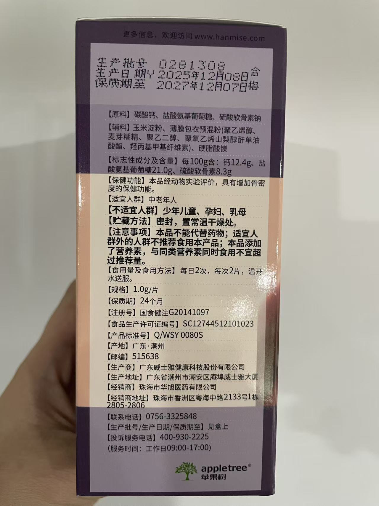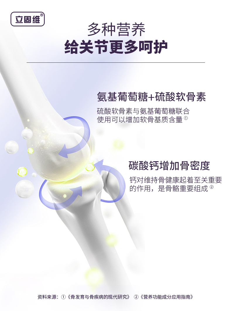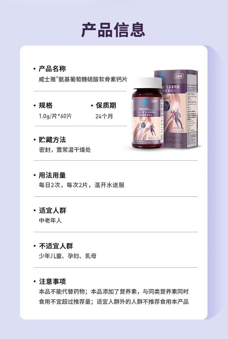核心成分及含量:每粒含钙124mg,盐酸氨基葡萄糖210mg,硫酸软骨素83mg