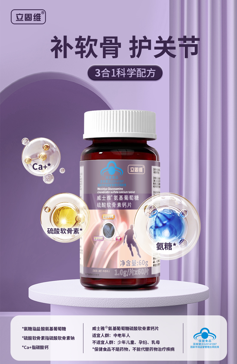 ⁵店庆活动【氨糖+软骨素+钙片】关节“金三角” 每粒含钙124mg+氨糖210mg+软骨素83mg 60粒/瓶 YY05-QTT-PGS