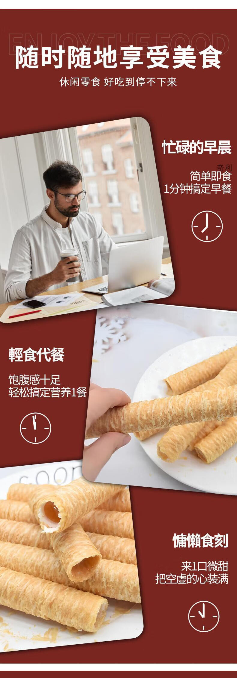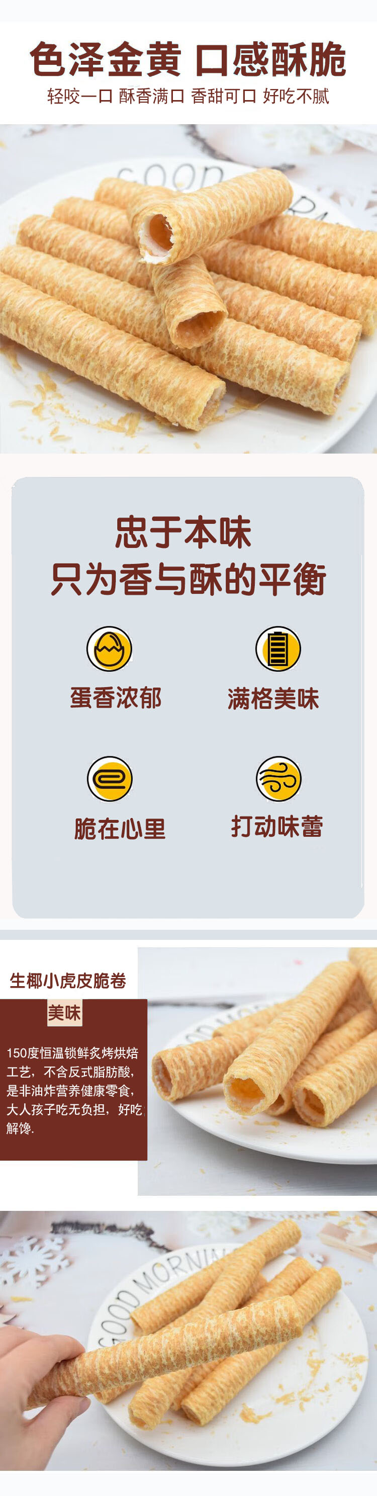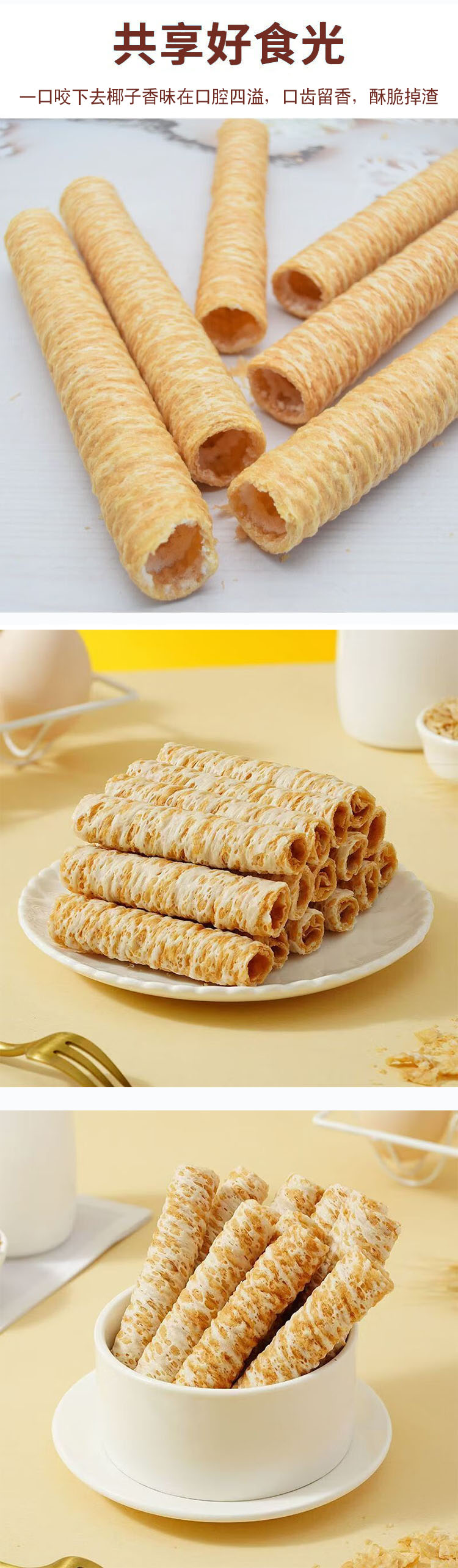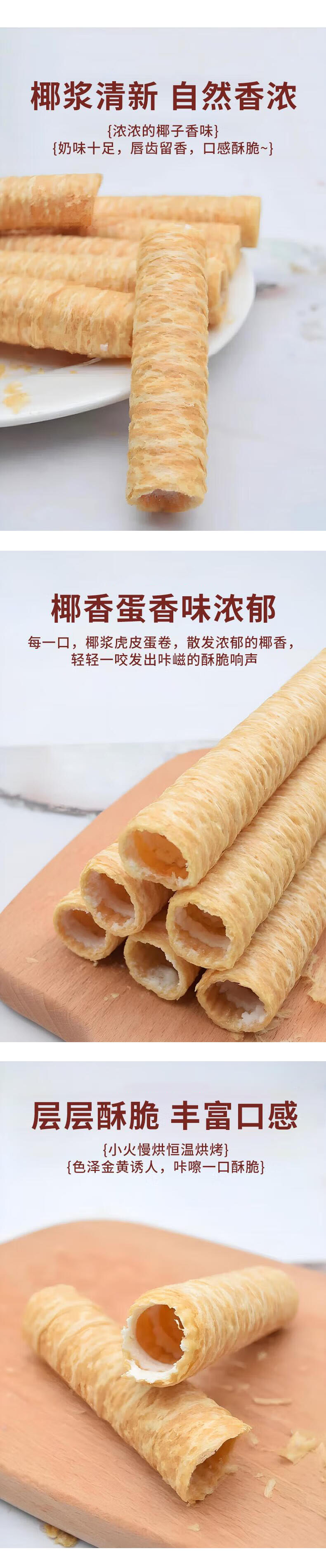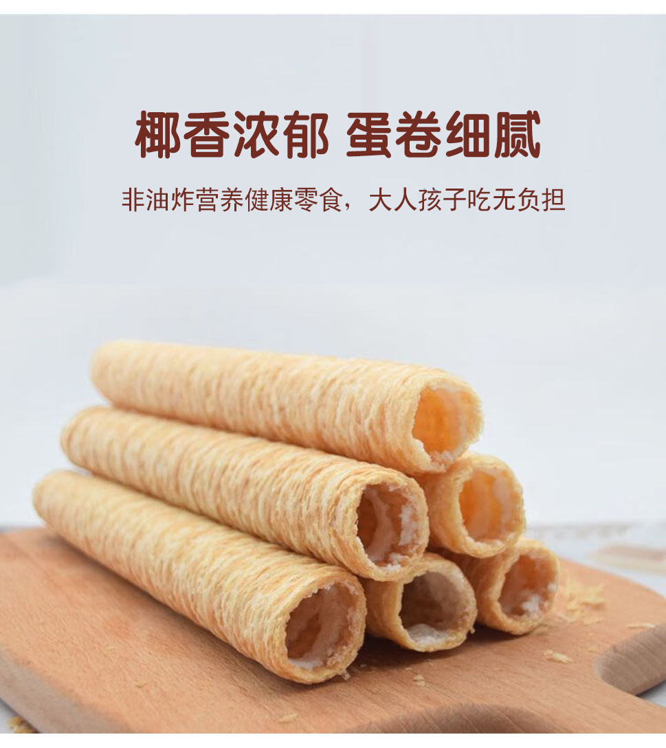 生椰蛋脆卷,20袋组合,甄选进口椰浆和新鲜鸡蛋、小麦粉,恒温锁鲜炙烤烘焙工艺,非油炸,蛋卷细腻清甜,椰香浓郁,甜而不腻,美味营养零食M