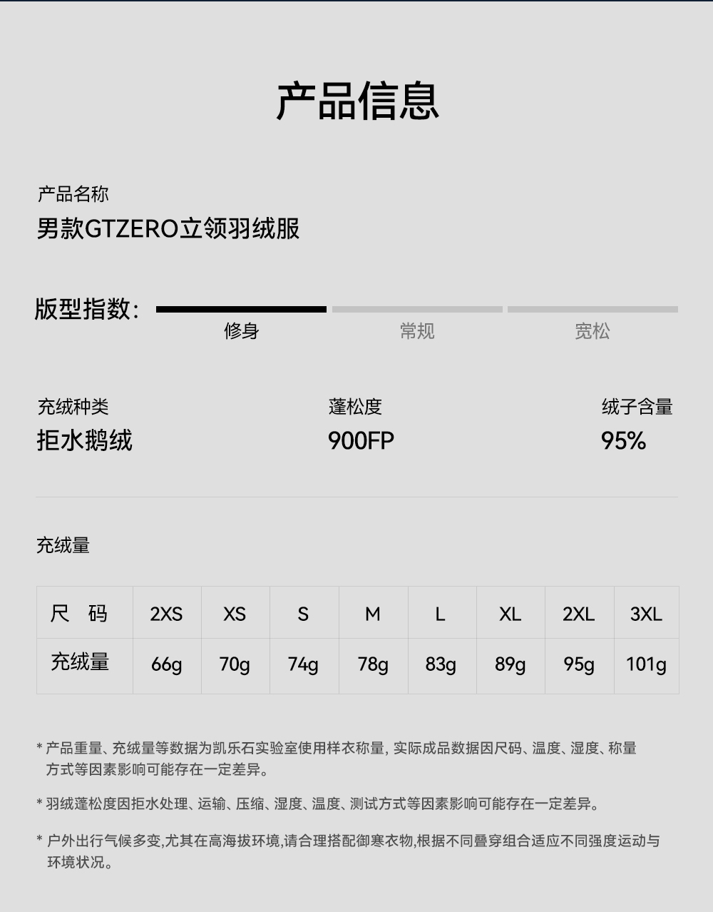 KAILAS凯乐石 男款GT ZERO立领羽绒服 KG2533112【Z】