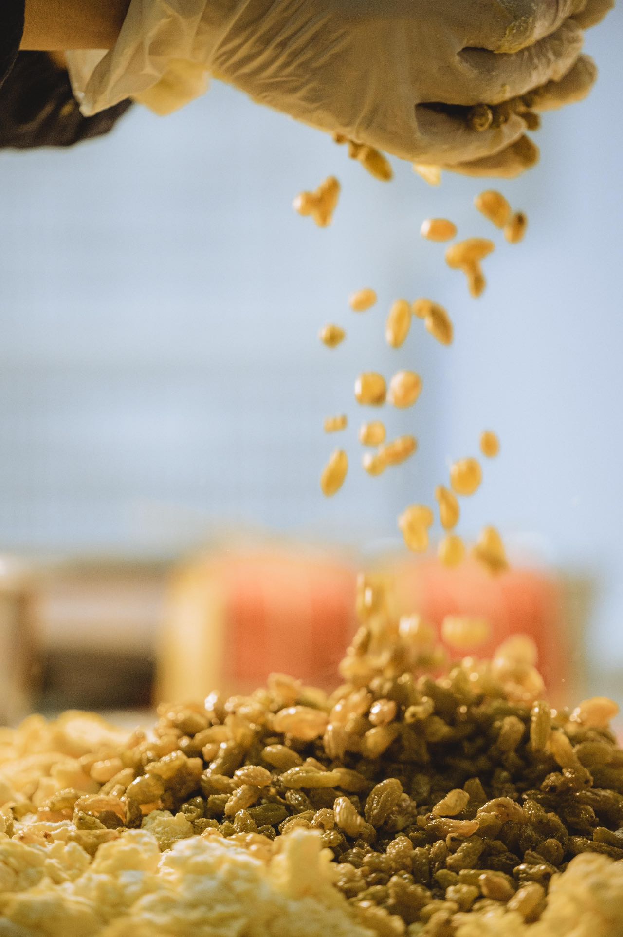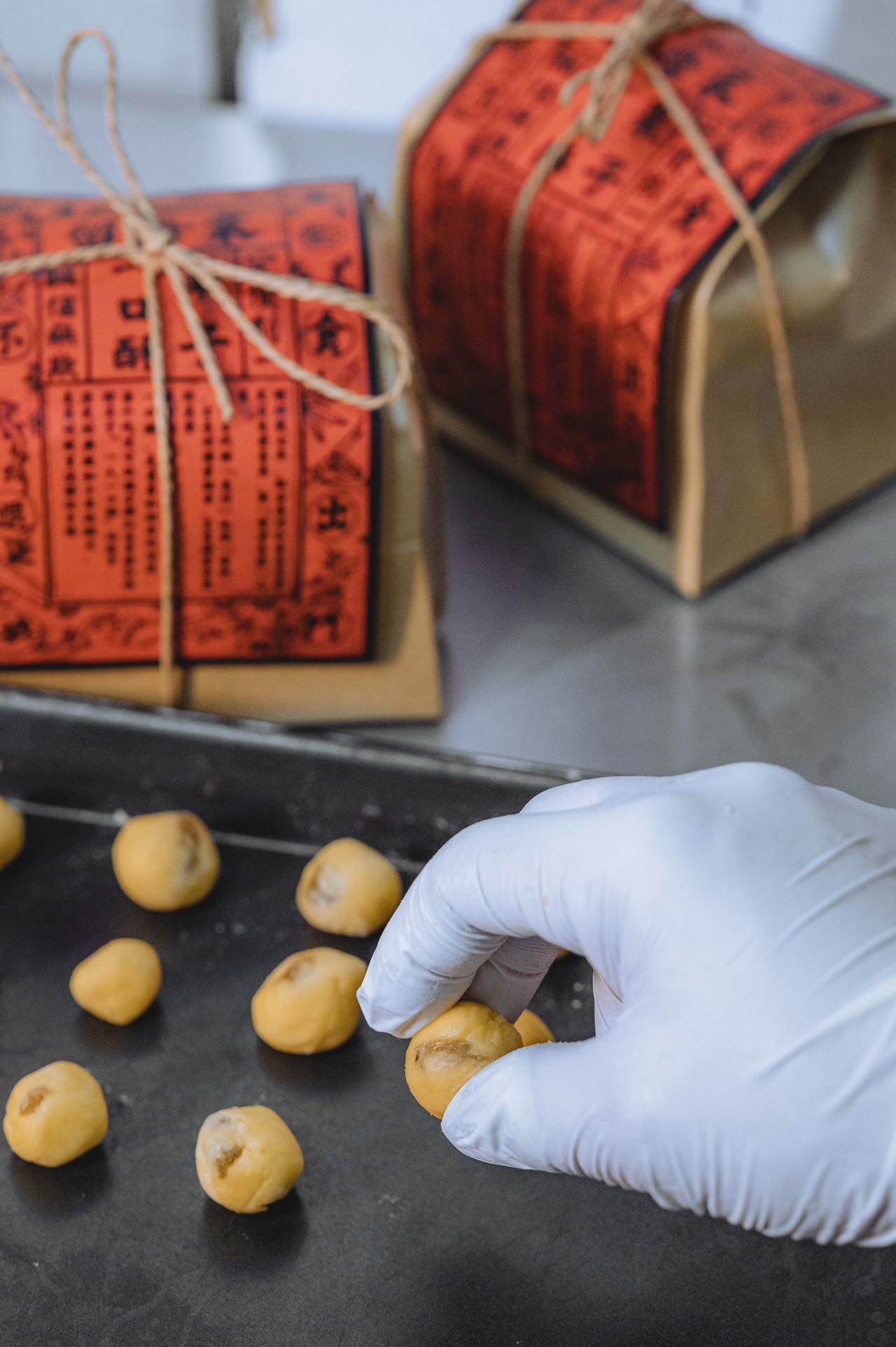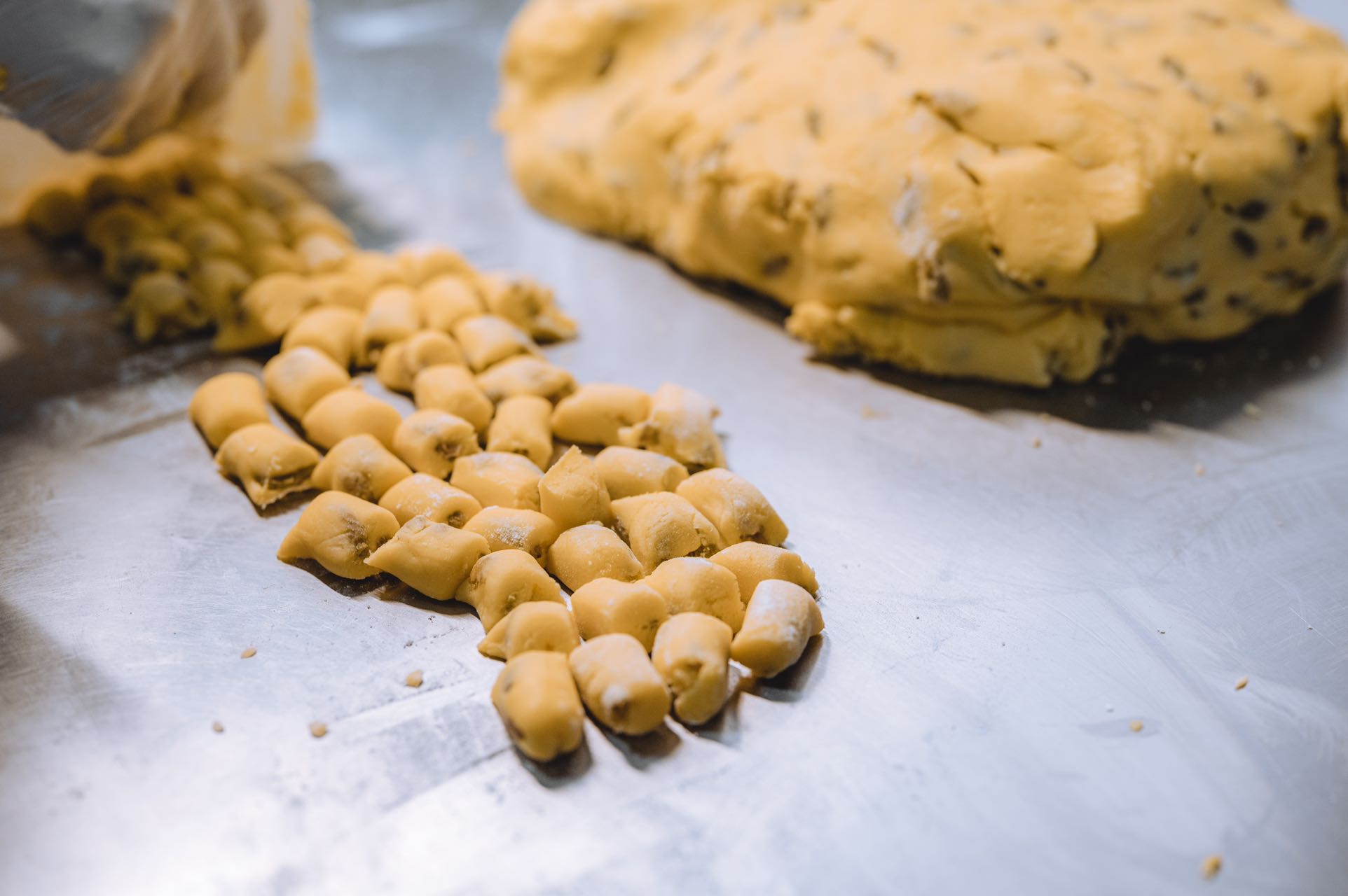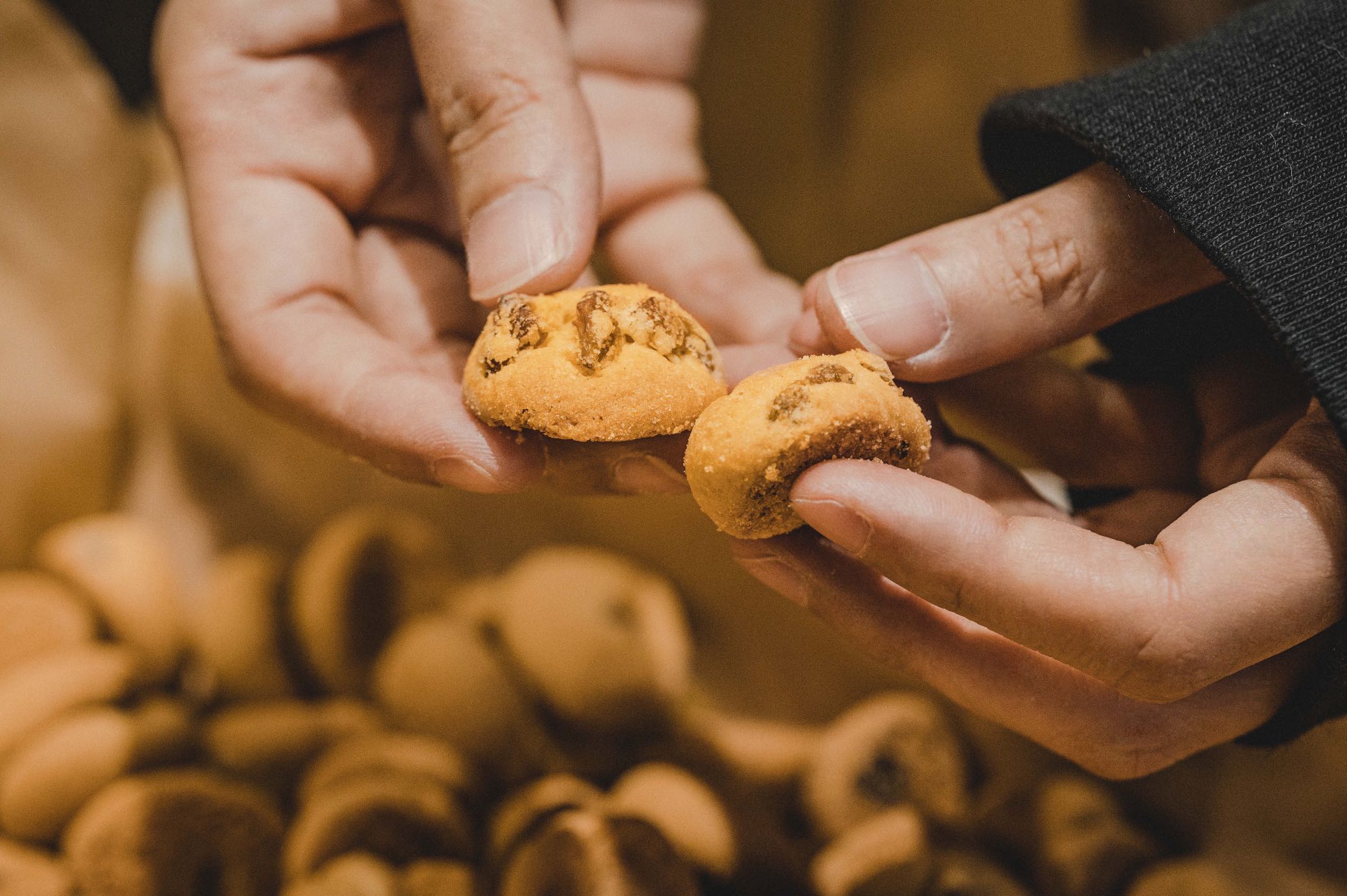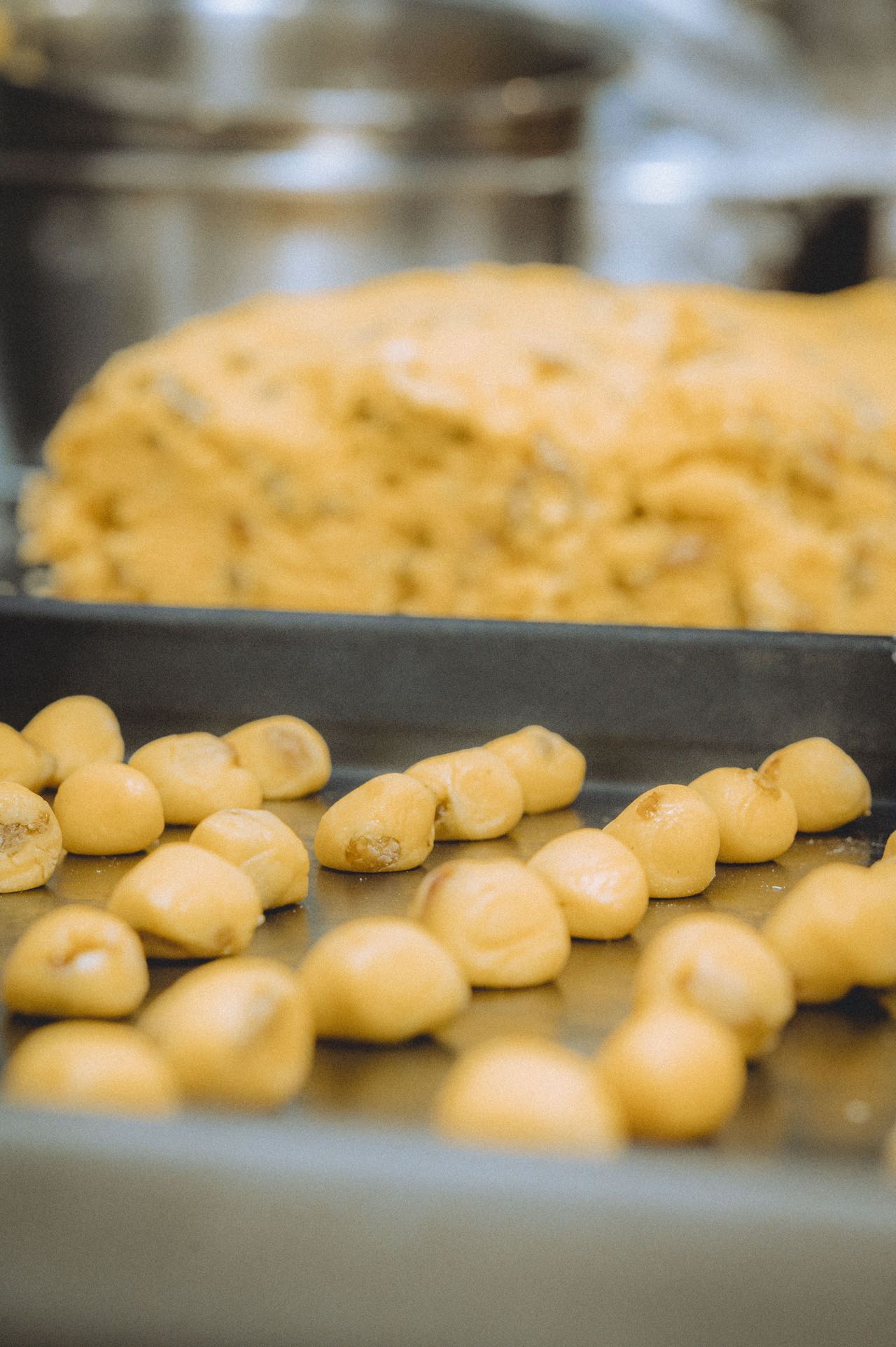 这个过程不能用机器,因为只有人工才能尽可能地保证每颗果子一口酥里都包裹着葡萄干。所以技艺再高超的师傅也不能捏出完全相同的两颗果子一口酥。也因此,每一颗小酥饼都是独一无二的。