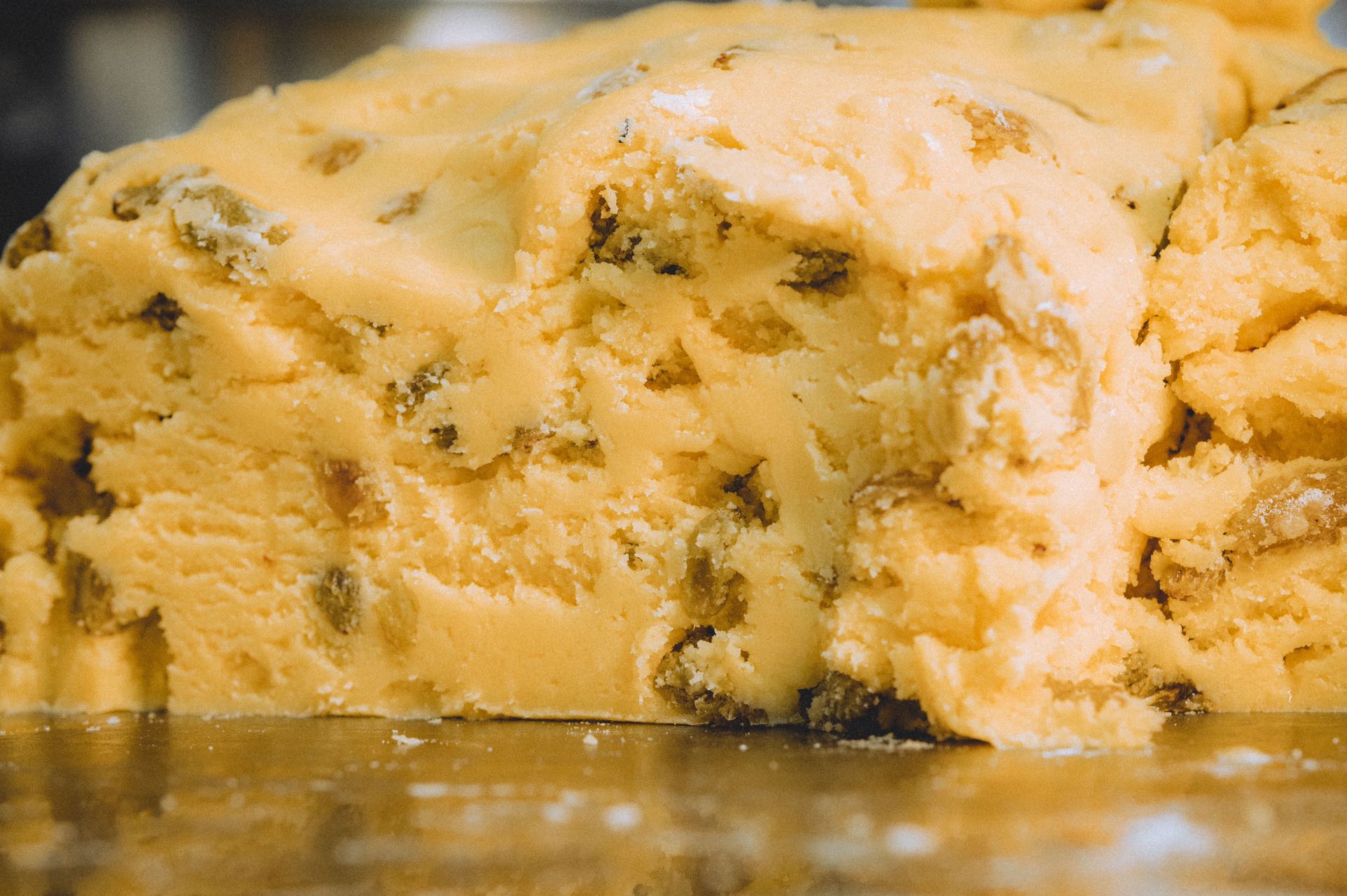 师傅们将加入小麦粉和鸡蛋的面团擀开、层叠,加入葡萄干,每一次合油、搅拌、起酥、打、揉的工序,虽然是简单的动作不断重复,却考验着技术与经验。