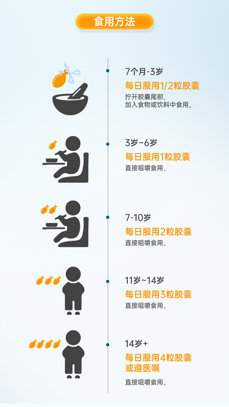 【7个月-3岁】服用1粒胶囊,拧掉胶囊尾端,