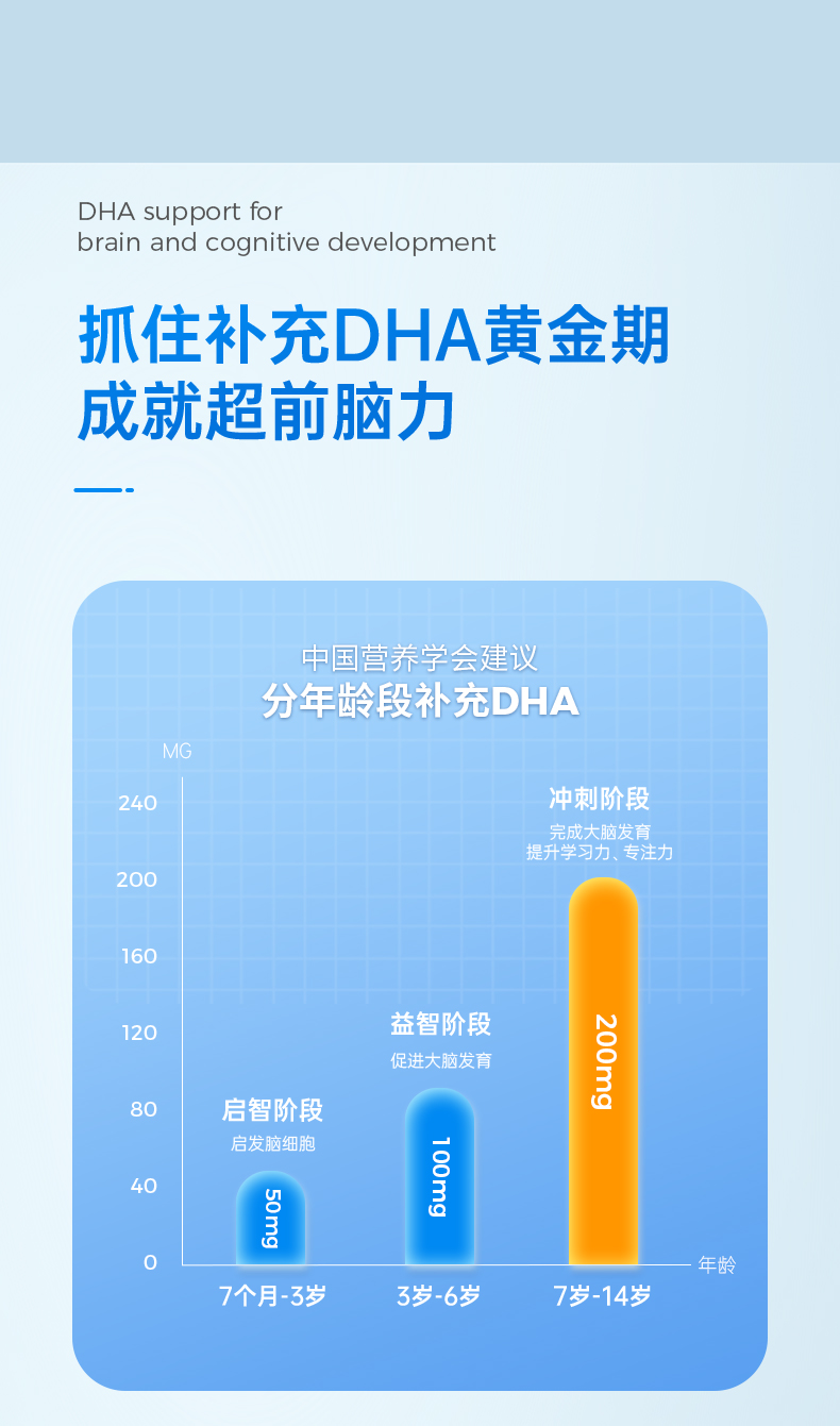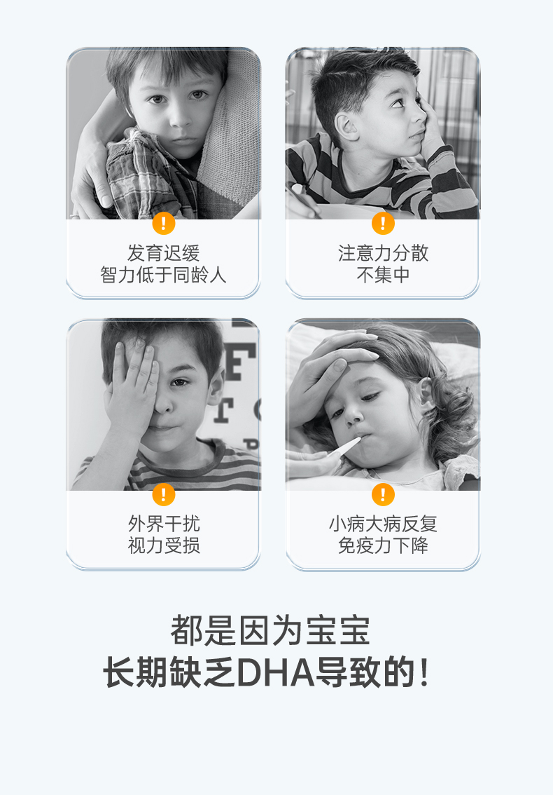 【适用人群】7个月以上缺少DHA导致脑部眼部发育不佳,需要补充DHA的儿童。具体表现为: