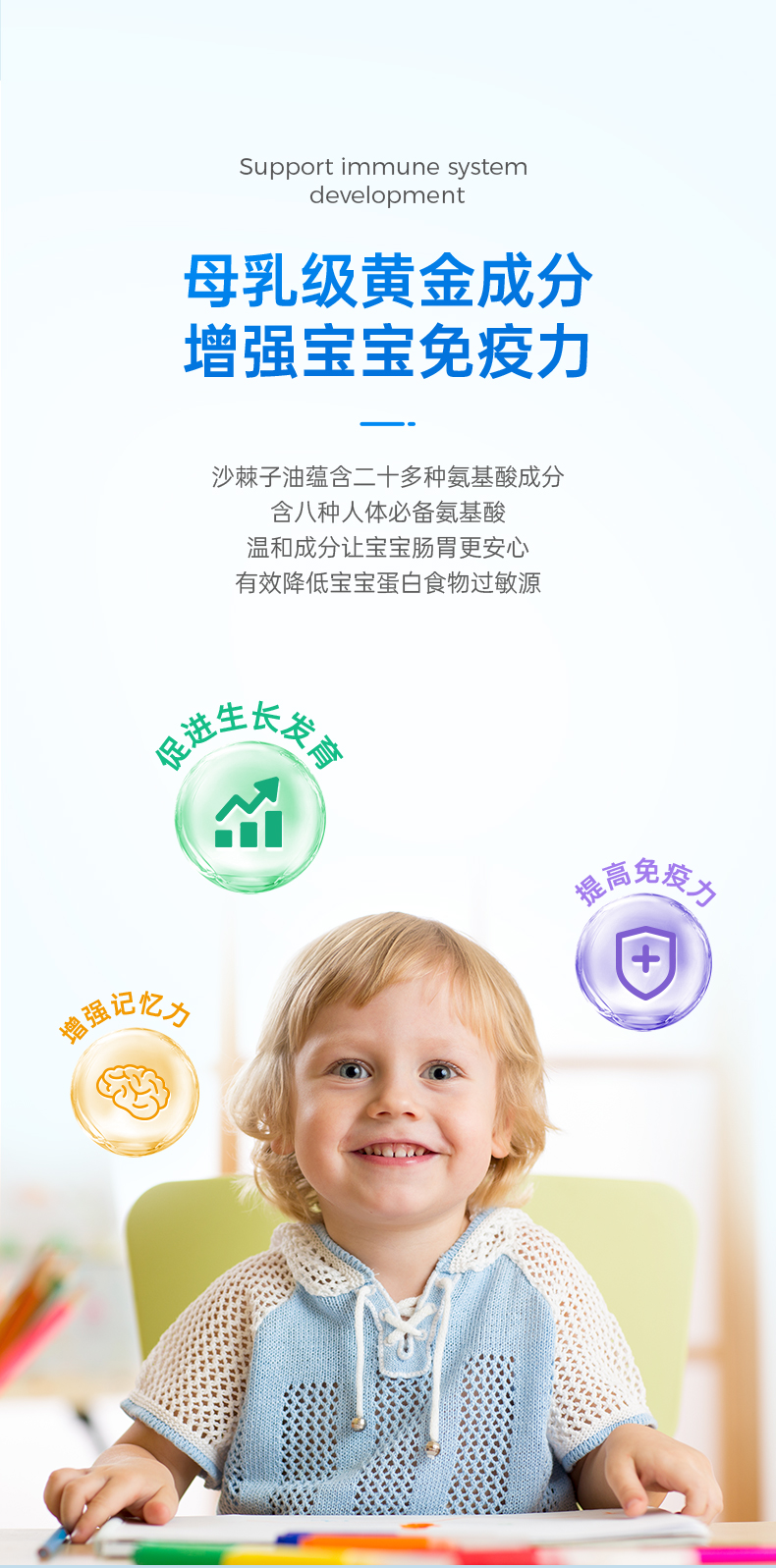 沙棘子油蕴含二十多中氨基酸成分,含八种人体必备氨基酸,温和成分让宝宝肠胃更安心,有效降低宝宝蛋白食物过敏源。