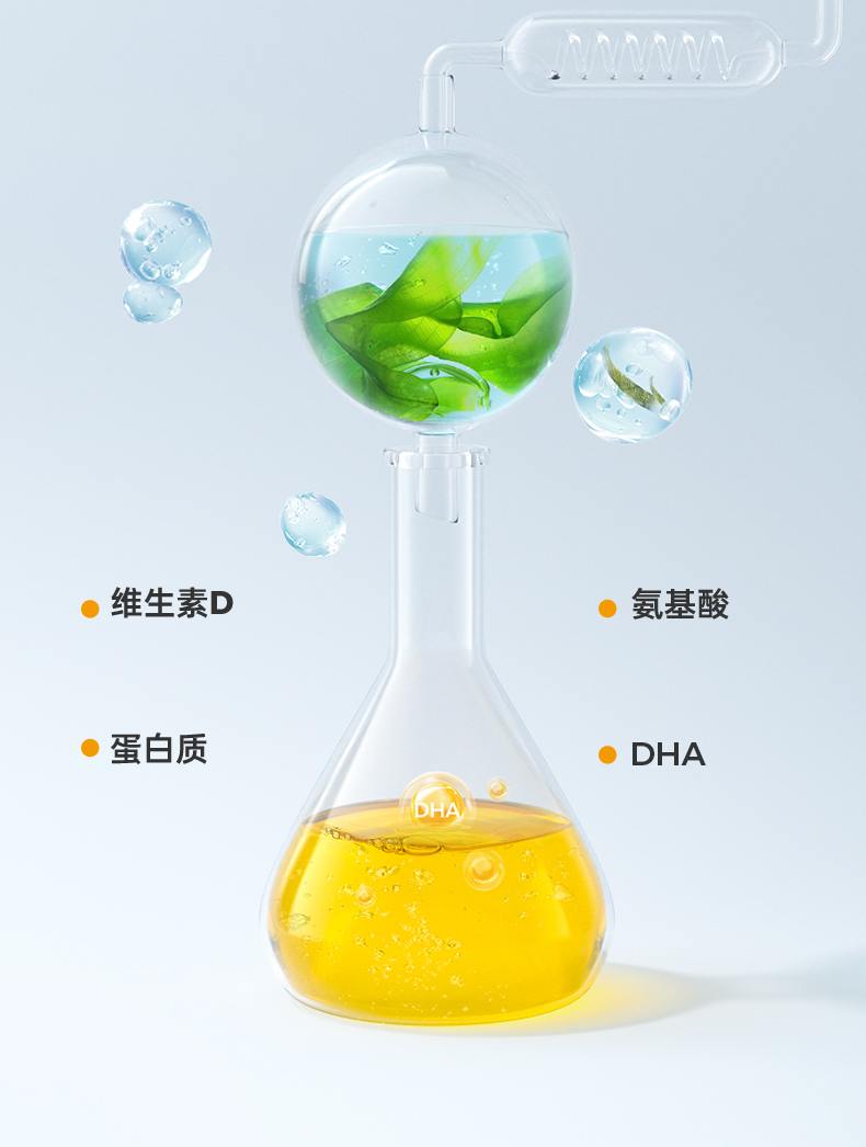 微生物发酵技术提取而成。除DHA外富含丰富营养物质:维生素D、