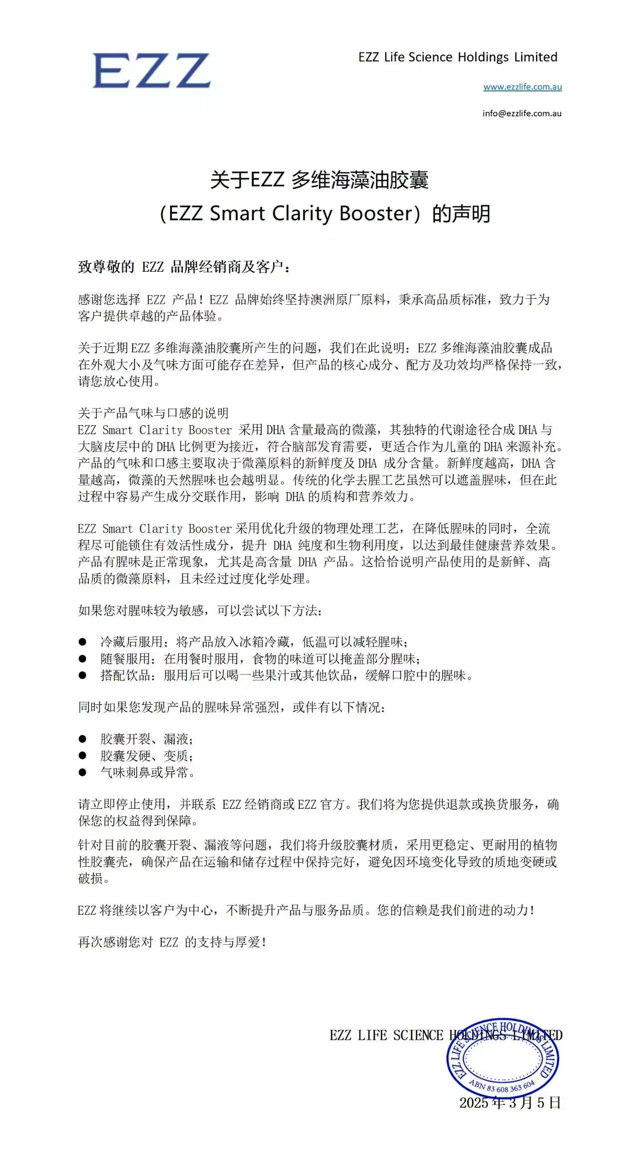 EZZ作为全球的生命科学研究和生产品牌,拥有世界排名前列的EZZ生命科学研究院,和奥克兰理工大学基因究院的技术支持,EZZ的产品符合澳洲严苛TGA认证和GMP管理标准,功效和安全性都有保障。