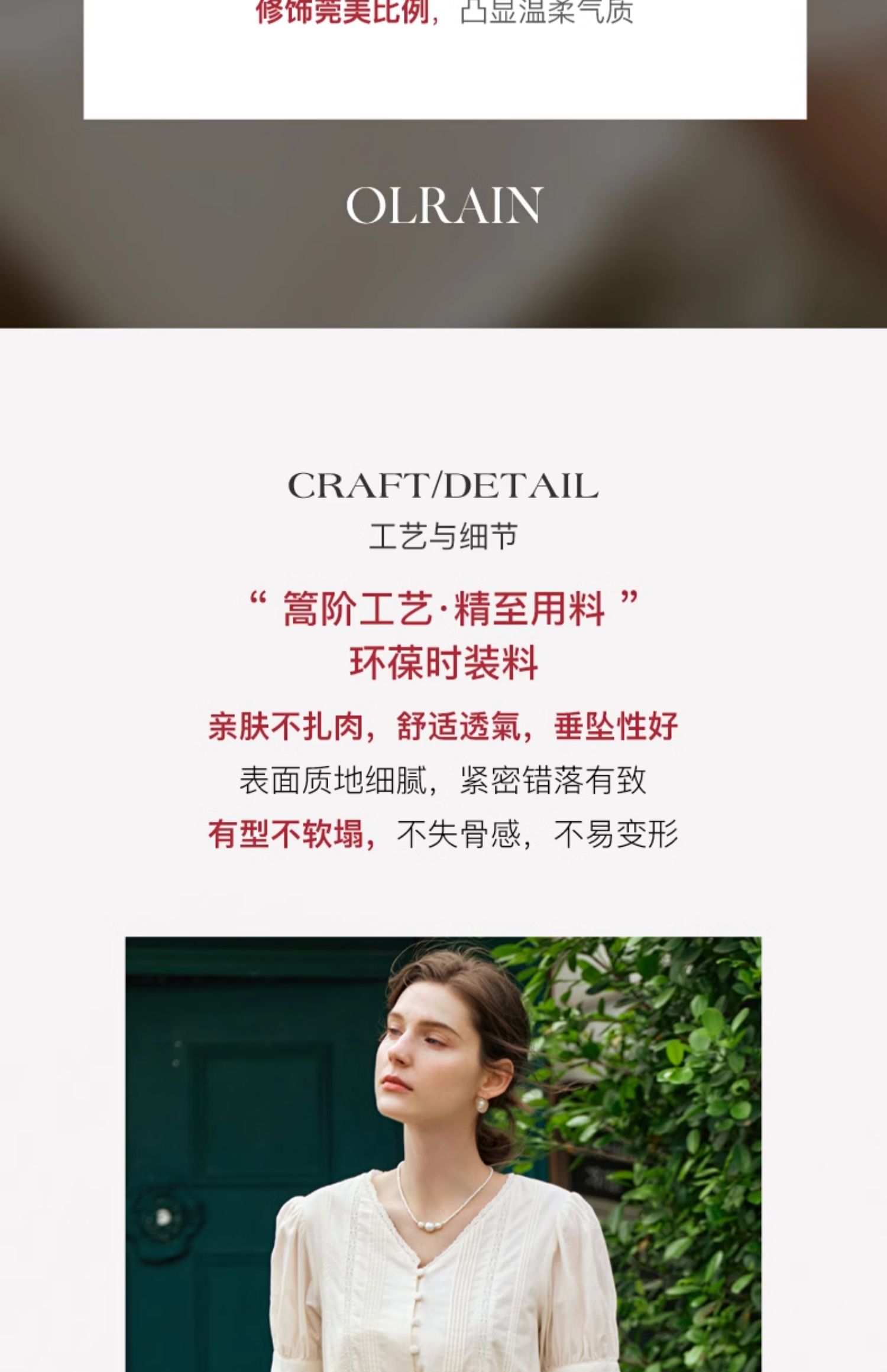 - “精致”是欧芮儿olrain品牌文化的核心,欧芮儿认为,精致的女人,不但要外在动人,更要内在迷人,内外兼修,有魅力、有气质、有内涵,自信而不自傲,优雅而不矫揉,自有万种风情而不轻浮,更不故作矜持。