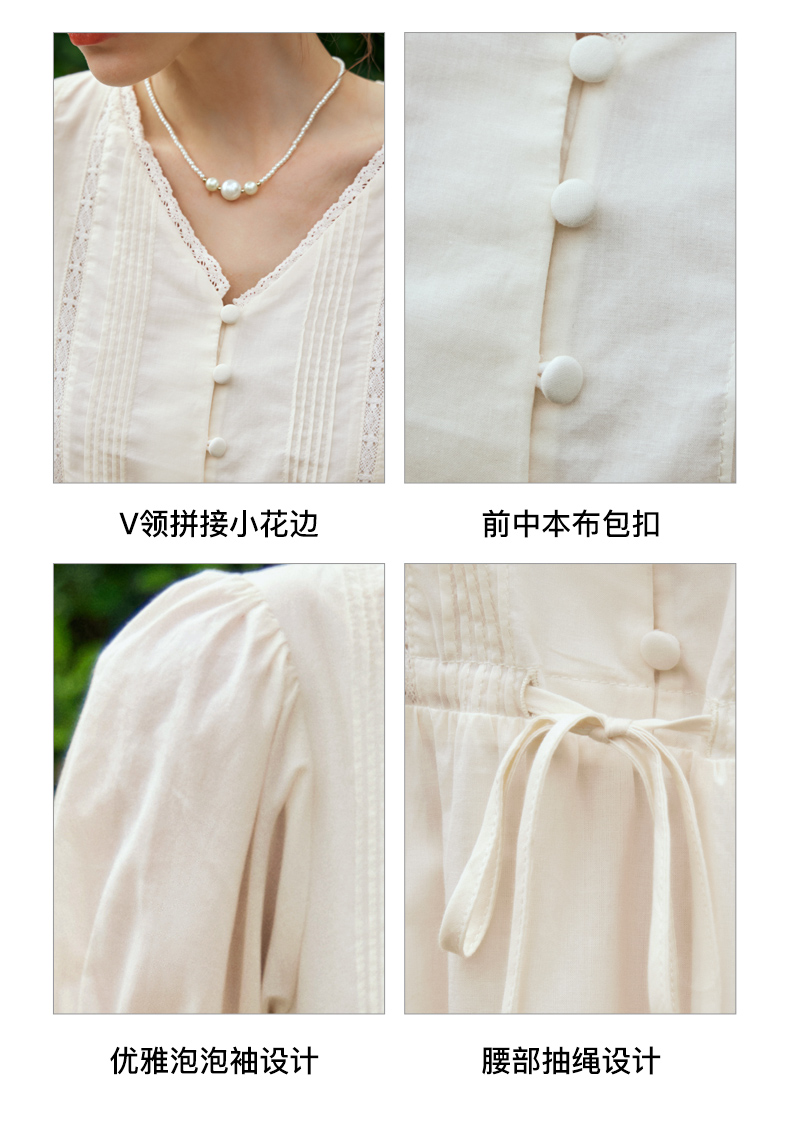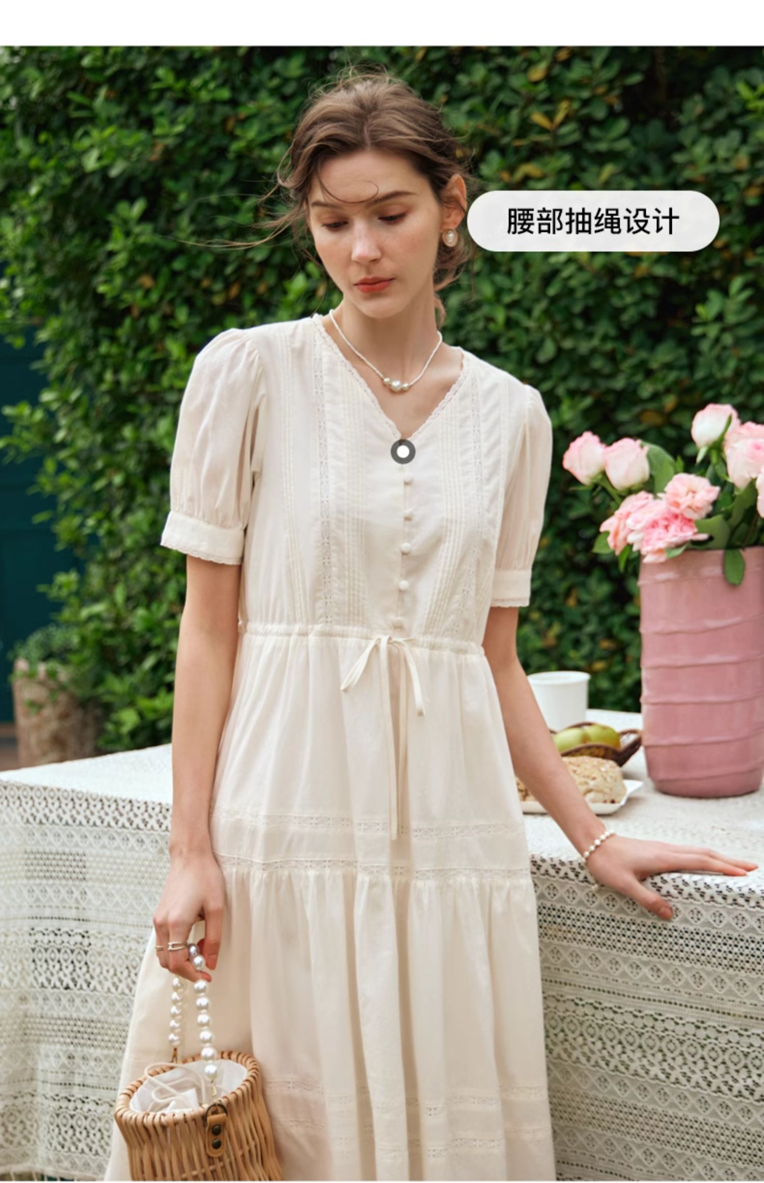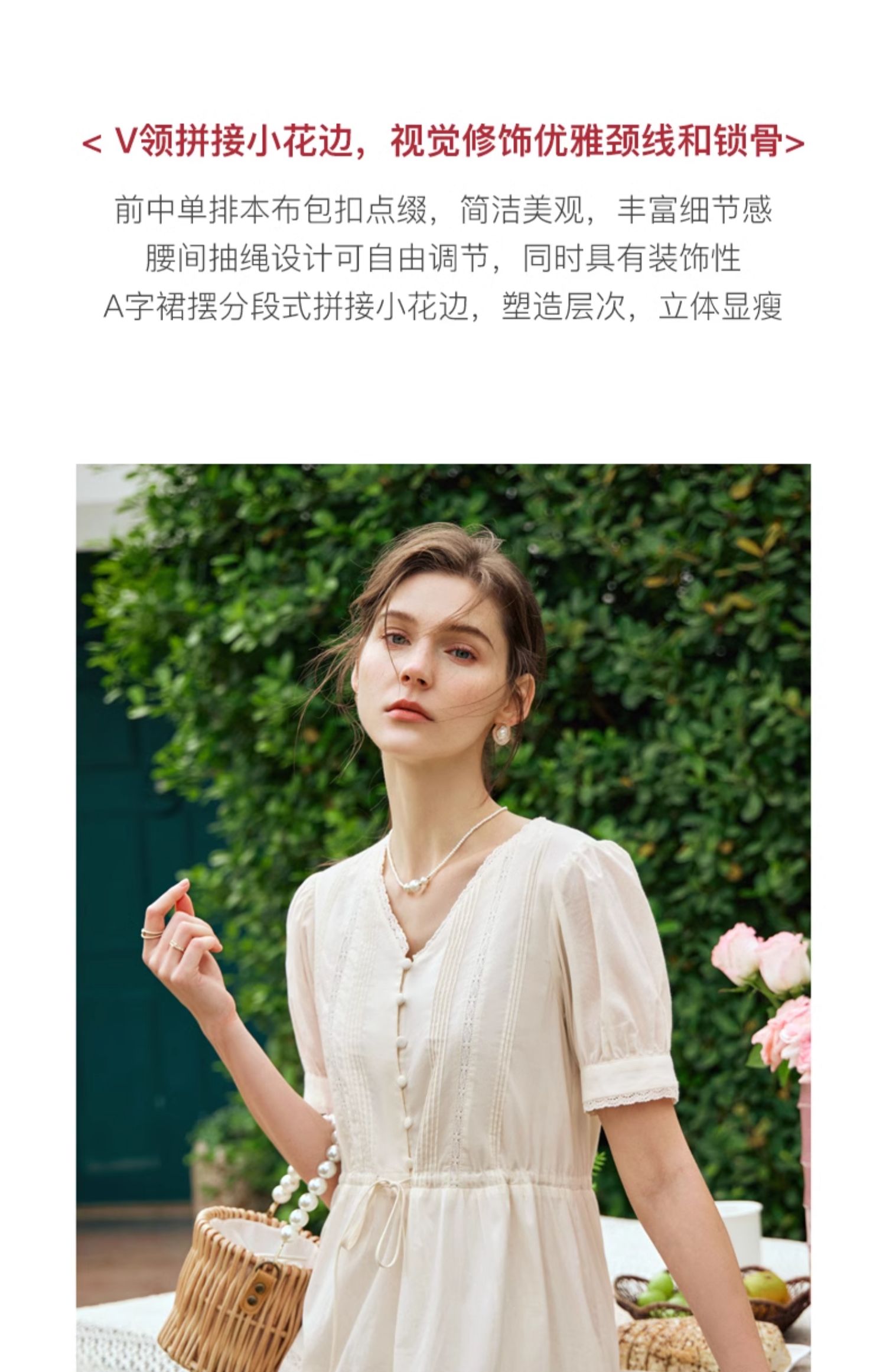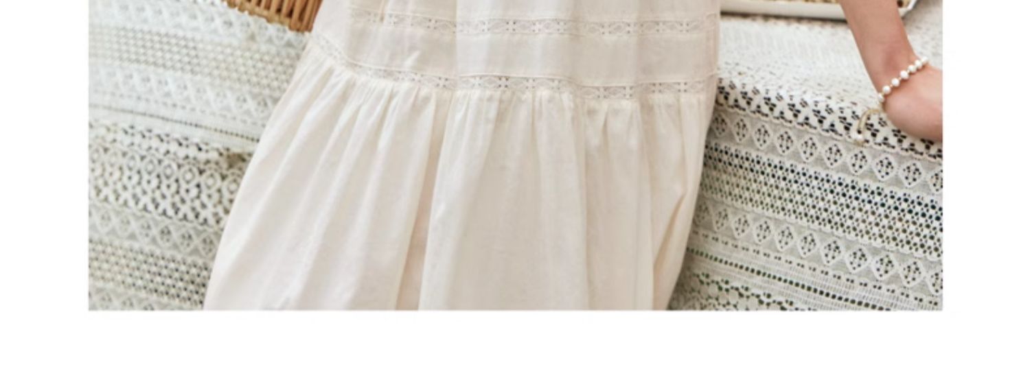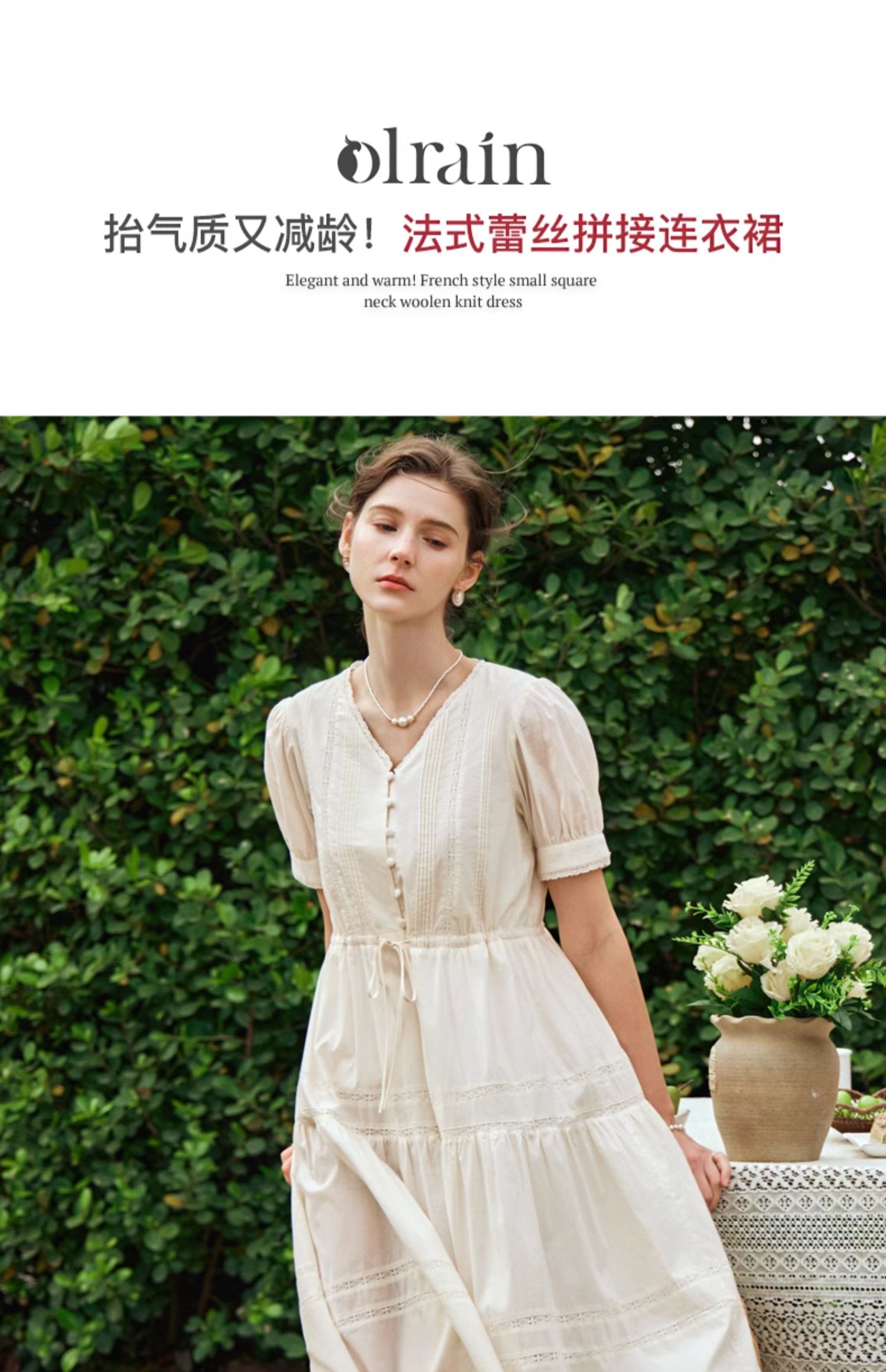 OLrain欧芮儿法式杏色v领连衣裙女夏季2024年新款蕾丝拼接中长裙