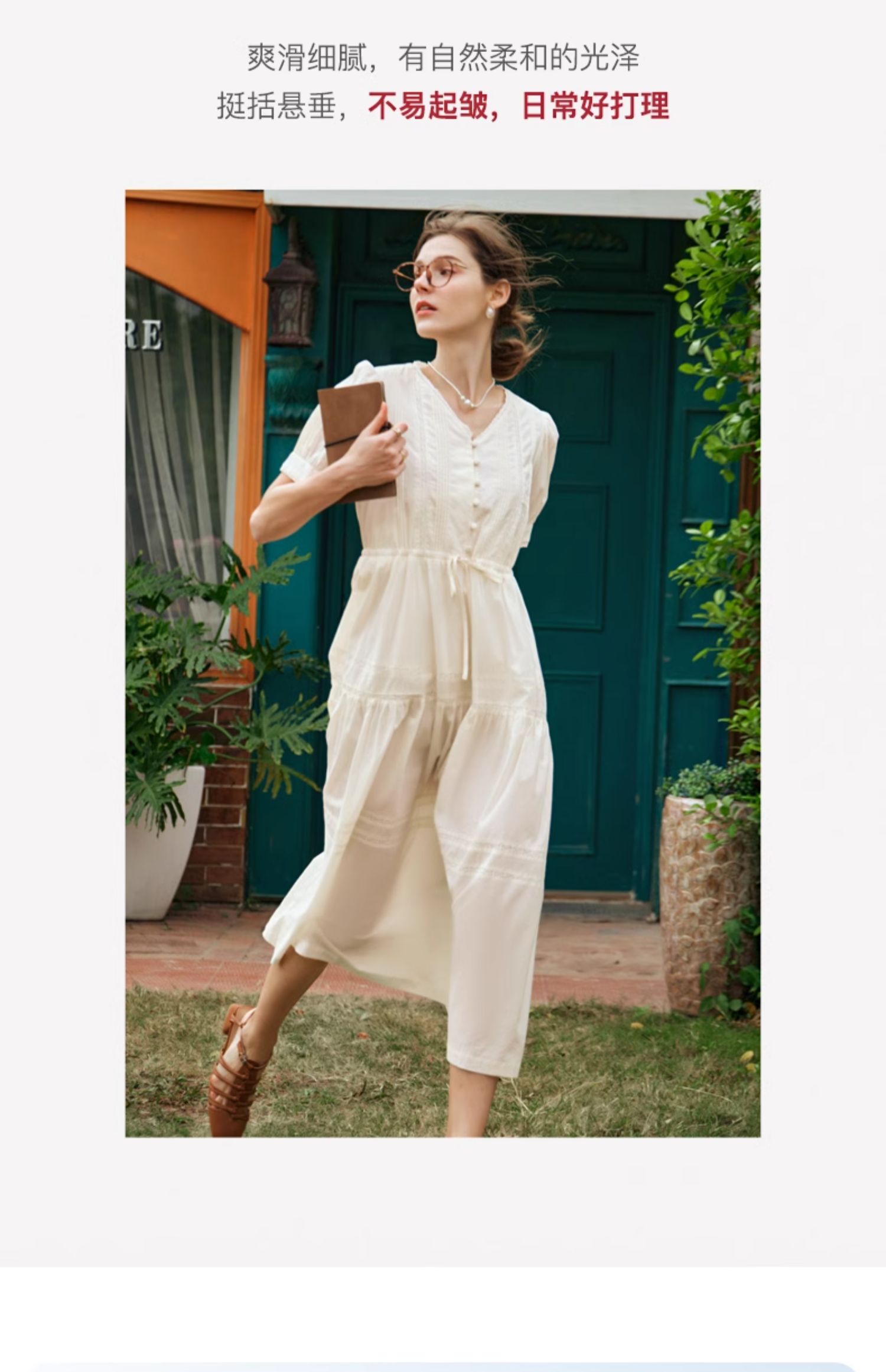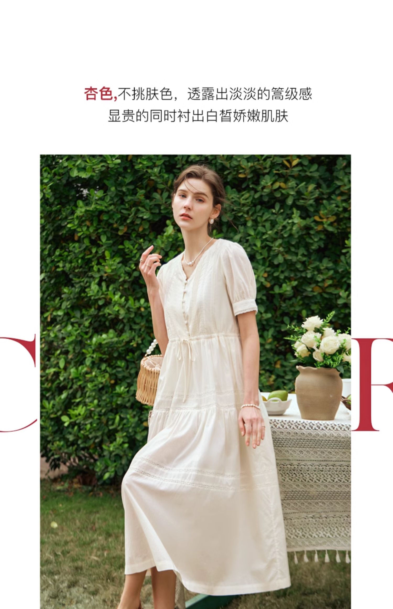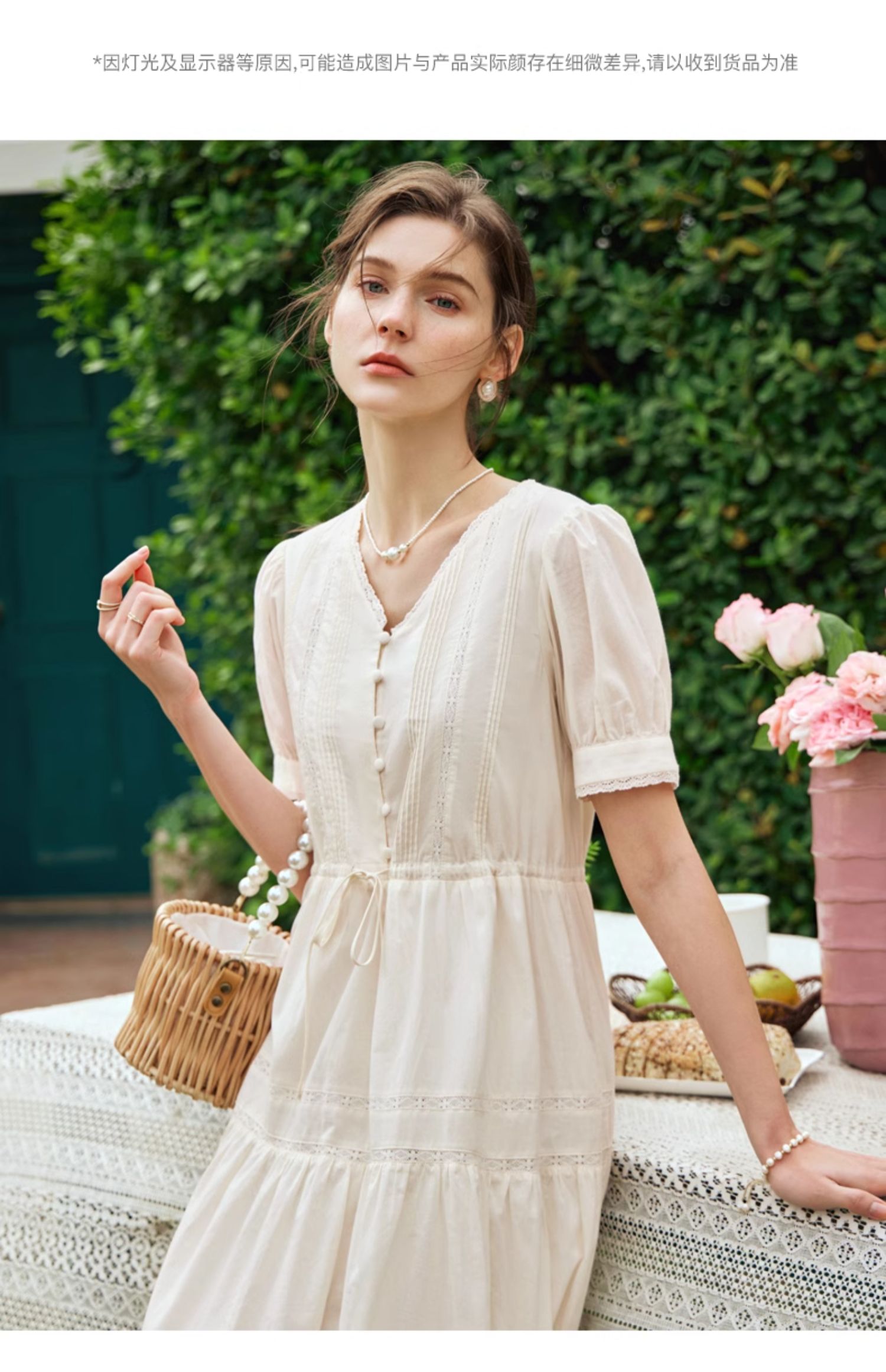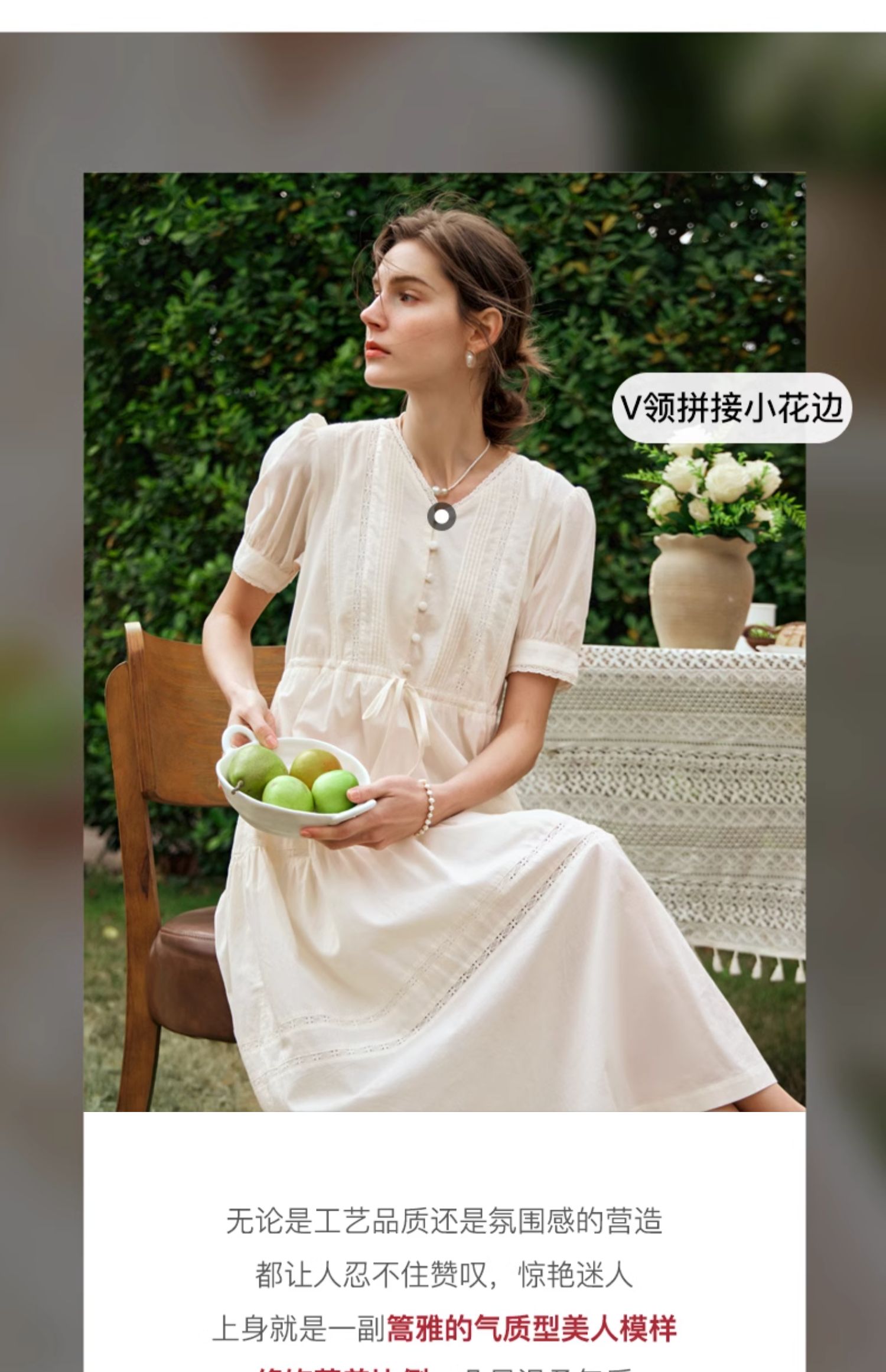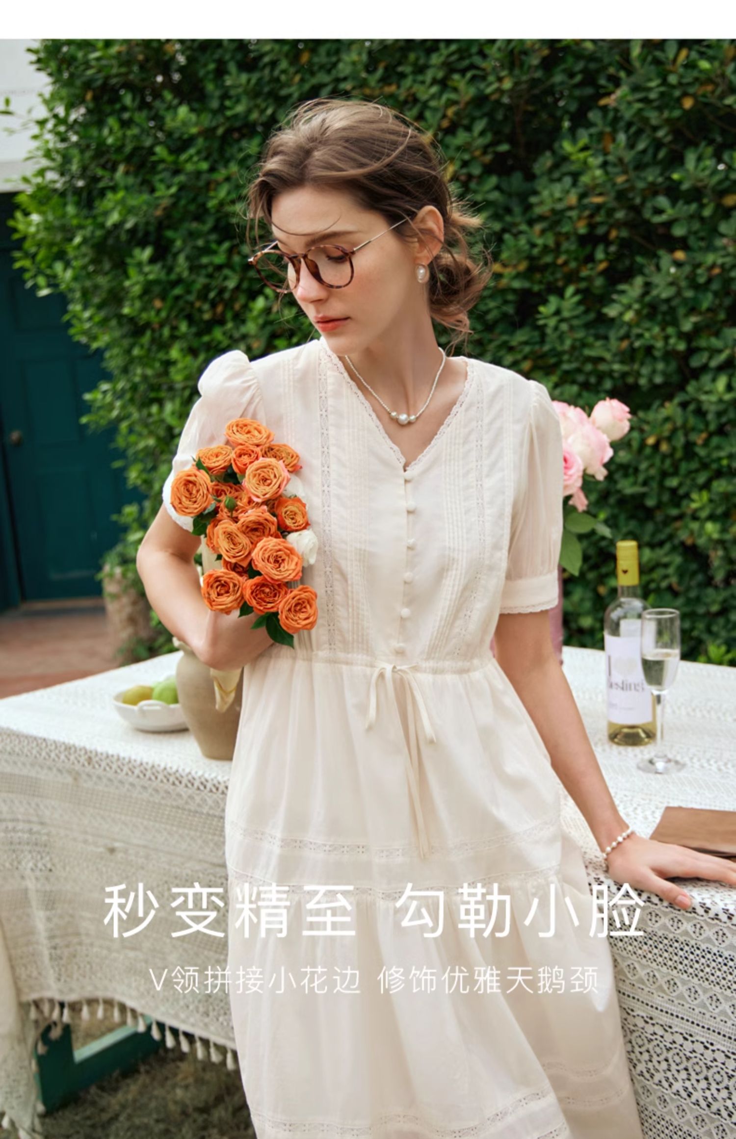 OLrain欧芮儿法式杏色v领连衣裙女夏季2024年新款蕾丝拼接中长裙