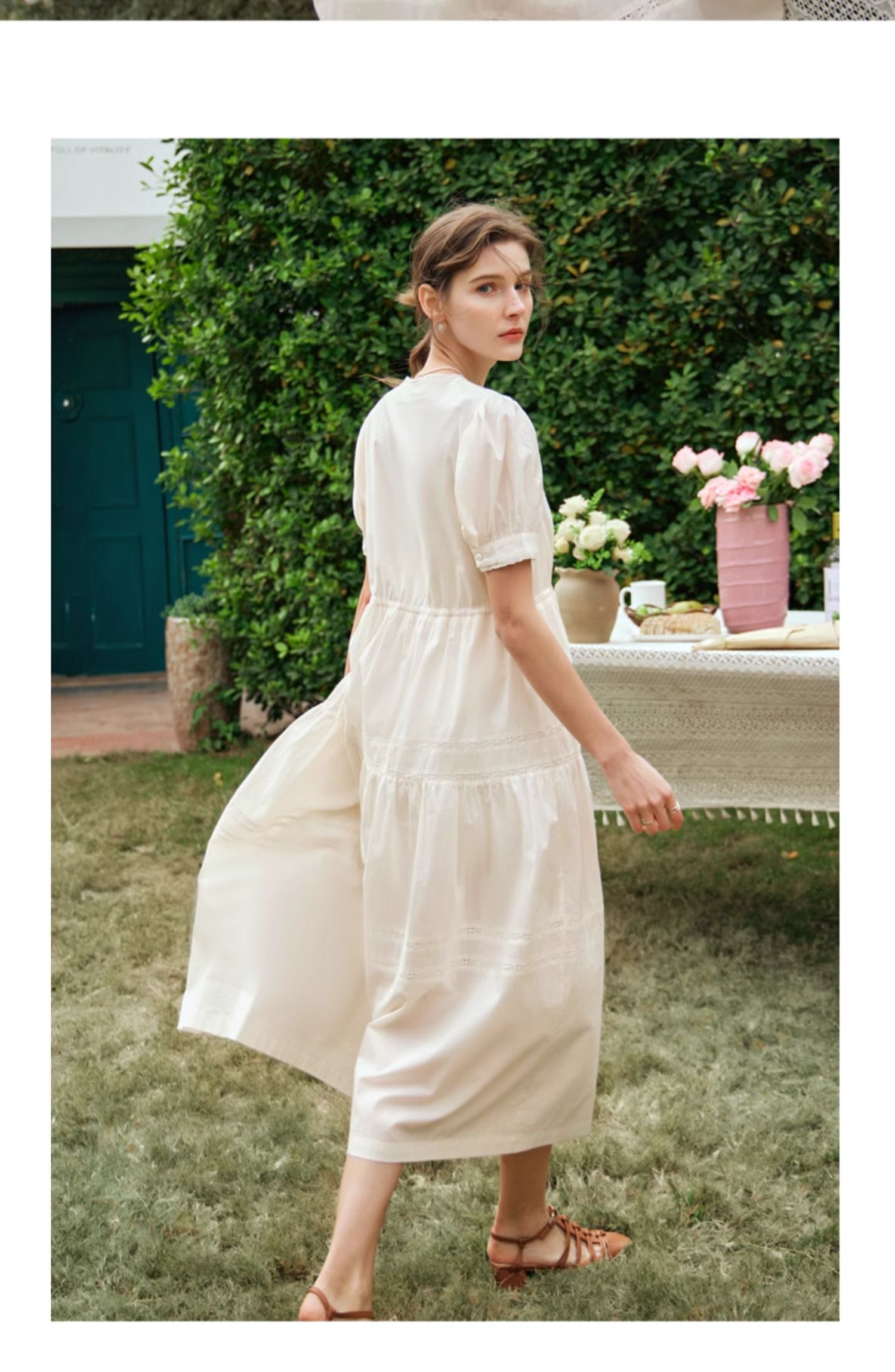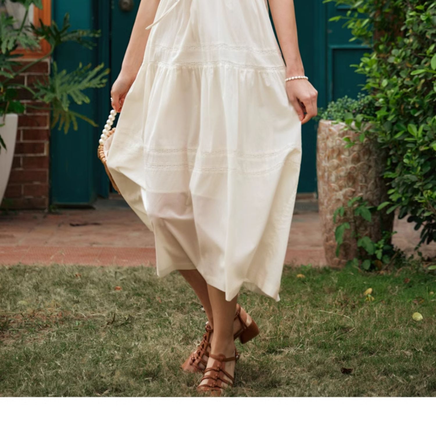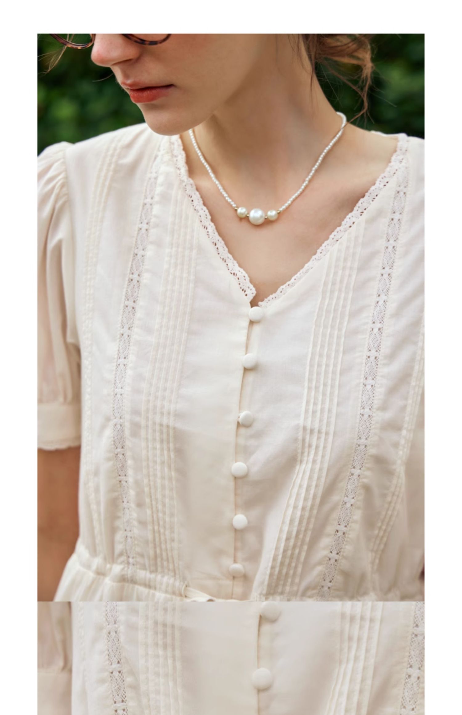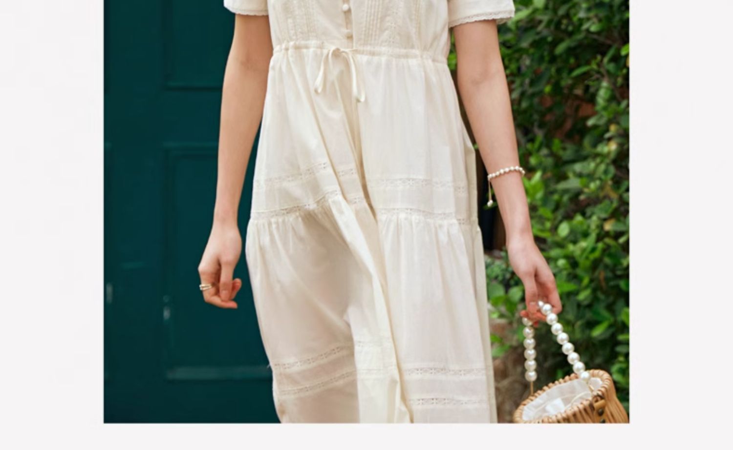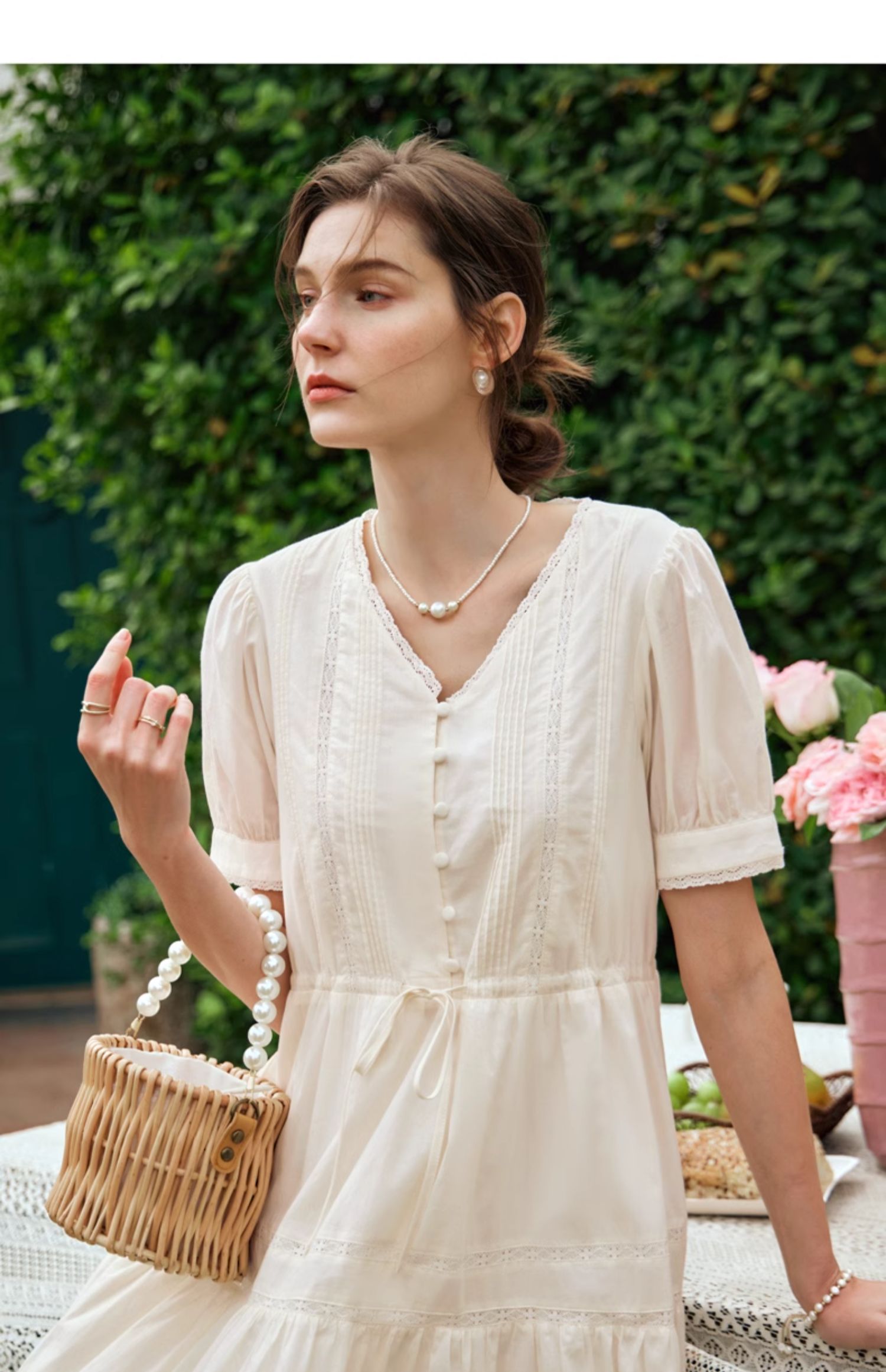 OLrain欧芮儿法式杏色v领连衣裙女夏季2024年新款蕾丝拼接中长裙