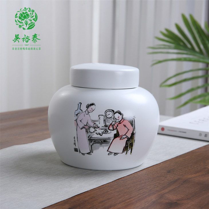 茶叶罐主体画面为著名漫画家李滨声老师专门为吴裕泰创作的“四季饮茶图”,将四种喝茶的场景展现的淋漓尽致,“春饮茉莉、夏饮绿、秋饮乌龙、冬饮红”的概念,强调一年四季顺时饮茶。