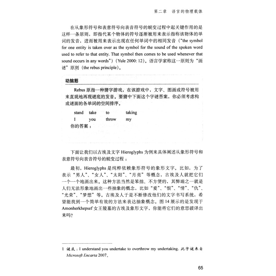 《概论》的目的是普及语言学的最基本知识,引发读者对语言和语言学的兴趣。读罢此书,我感到《概论》实现了作者的初衷。《概论》向读者展示,语言学并不一定“枯燥无味”,因为它与我们的日常生活休戚相关。《概论》能够拓宽读者的眼界,它能使读者看到,人们习以为常甚至熟视无睹的语言,原来是一门博大而奇妙的学问。博大,仅从书中的讨论所涉及到的多方面视角便可见一斑:有个体的、社会的、文化的、生理的、心理的、认知的、历史的、文学的、科技的,甚至更多;奇妙,是因为全书表明,我们十分熟悉的、看似极具个性化的语言,原来是个有规律可循的符号体系,语言普遍规律为世界上数千种已知语言所遵循,涉及到语言本性、语言起源、语言的音系、词汇、句子、语言意义、语言使用、语言变迁、语言习得、语言与思维和文化等等。语言学难道不奇妙吗?《概论》诱发思考,正如书中所述,人们的语言常识并非都是真理;语言研究中的诸多问题尚无定论,许多谜团等待着后人去解析。《概论》有很强的可读性和趣味性:全书语言通俗易懂,运用了大量来自自然语言,特别是流行文化和经典作品中的语言实例,读者不会产生陌生感;它旁征博引,诱发联想,引起兴趣;书中设置了多个互动环节,一改语言学作品曲高和寡的窘境,更进一步拉近了作者与读者之间的距离。