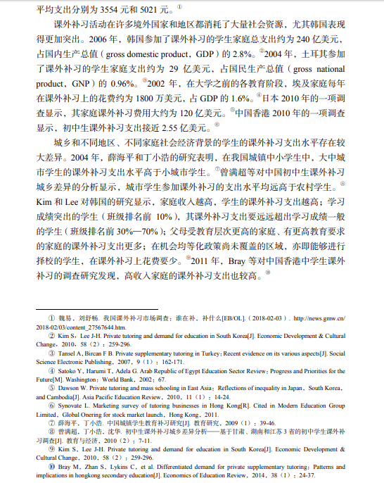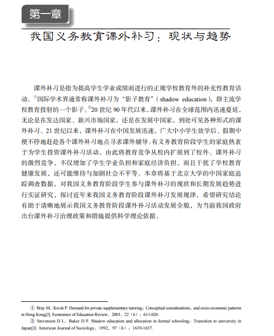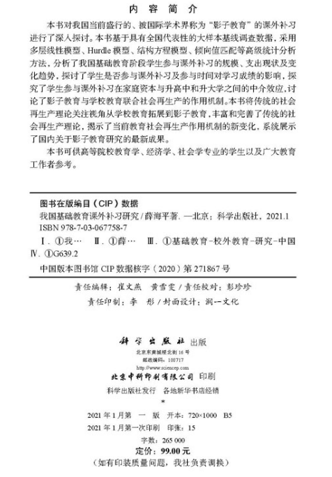 《我国基础教育课外补习研究》对我国当前盛行的、被国际学术界称为“影子教育”的课外补习进行了深入探讨。《我国基础教育课外补习研究》基于具有全国代表性的大样本基线调查数据,采用多层线性模型、Hurdle模型、结构方程模型、倾向值匹配等高级统计分析方法,分析了我国基础教育阶段学生参与课外补习的规模、支出现状及变化趋势,探讨了学生是否参与课外补习及参与时间对学习成绩的影响,探究了学生参与课外补习在家庭资本与升高中和升大学之间的中介效应,讨论了影子教育与学校教育联合社会再生产的作用机制。《我国基础教育课外补习研究》将传统的社会再生产理论关注视角从学校教育拓展到影子教育,丰富和完善了传统的社会再生产理论,揭示了当前教育社会再生产作用机制的新变化,系统展示了国内关于影子教育研究的*新成果。