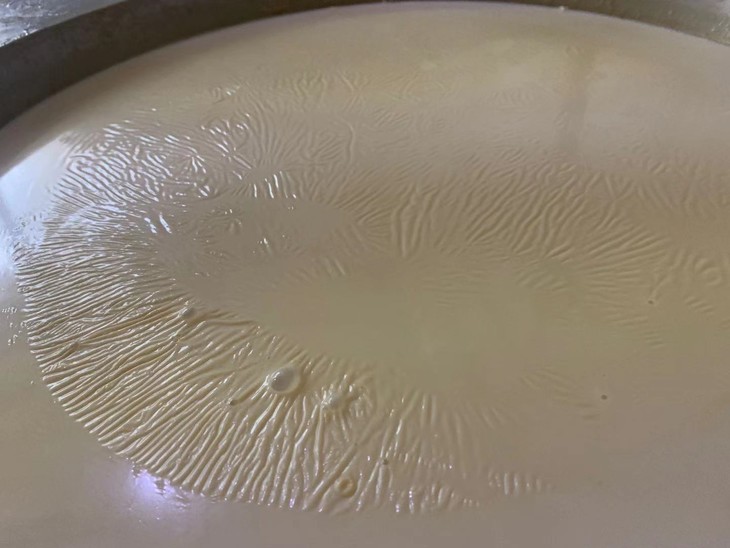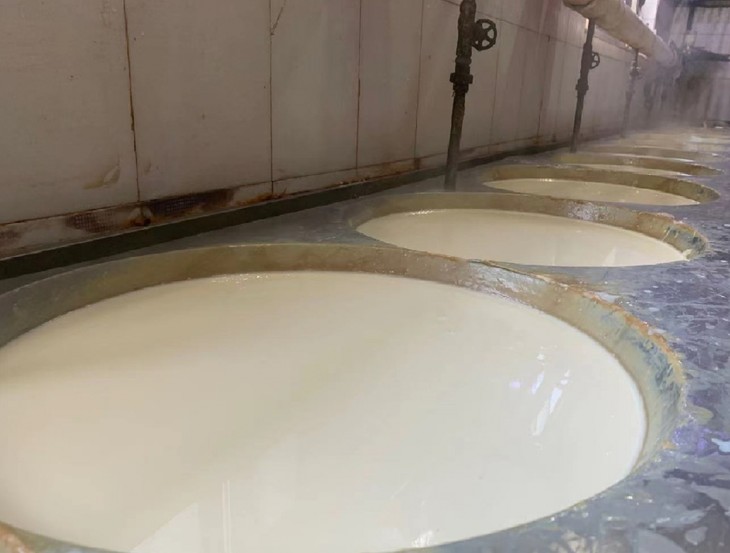 10点左右,记者来到制作车间,车间分上下两层,每层都有3条流水线,每个流水线上,22口大锅一字排开。锅里就是黄豆磨碎的浆,煮沸过滤后,豆浆通过管道被送到一口口大锅里。