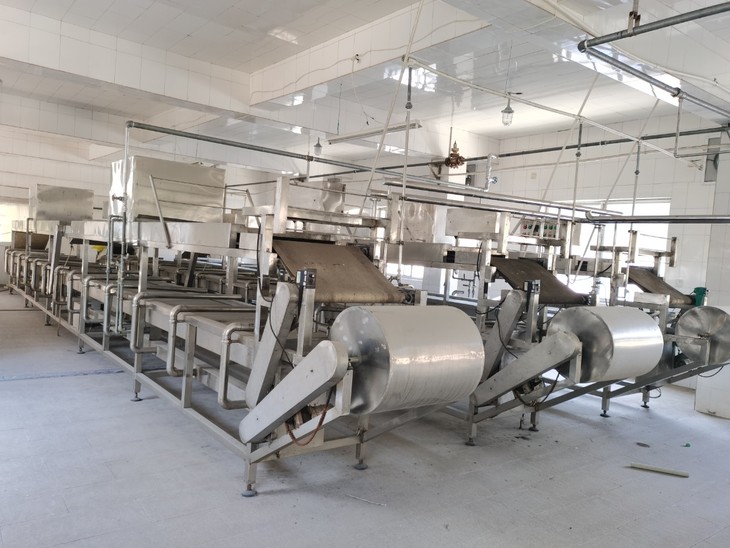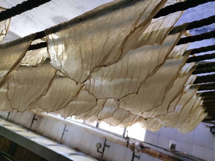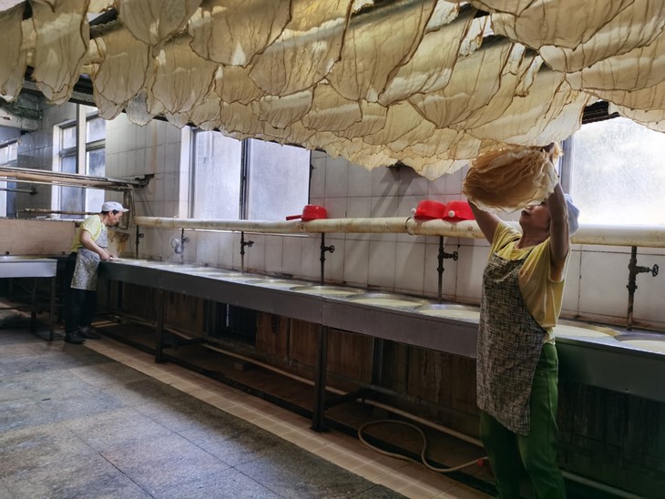 在生产车间里没站几分钟,就觉得汗涔涔的。车间内的体感温度大概有30多度,在这个温度下麻绳上的豆腐皮稍微晾一晾后,就会被送到烘箱烘30分钟,再拿出来摊开整理,静置10个小时干透,半成品都会放到-18℃的冷库里保存。